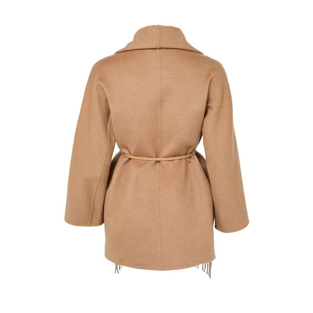 Description : Short, three-quarter-sleeved, patch pockets, fringe details, wraparound.