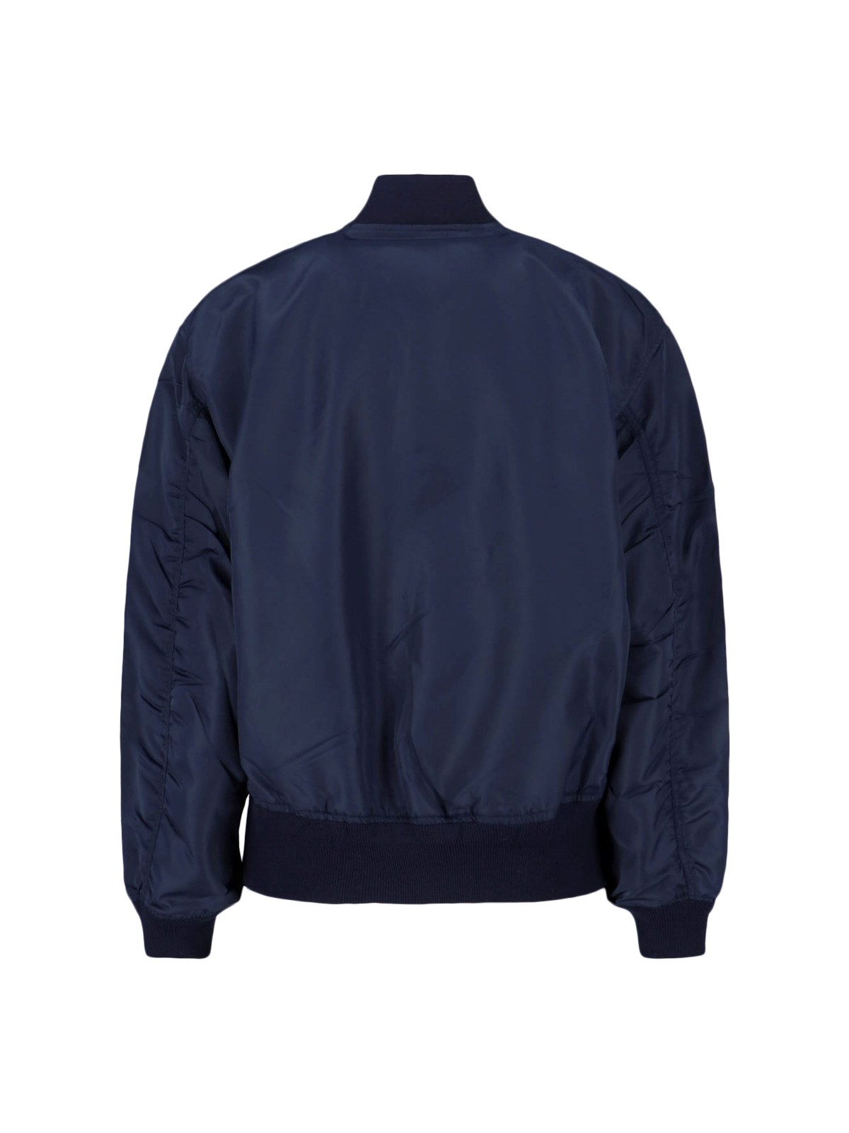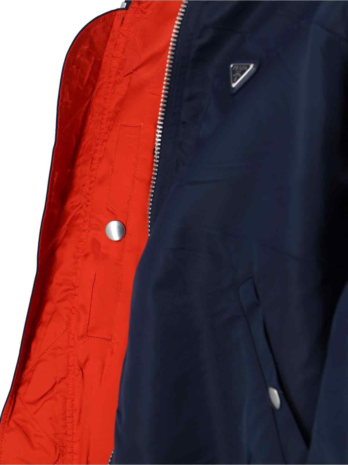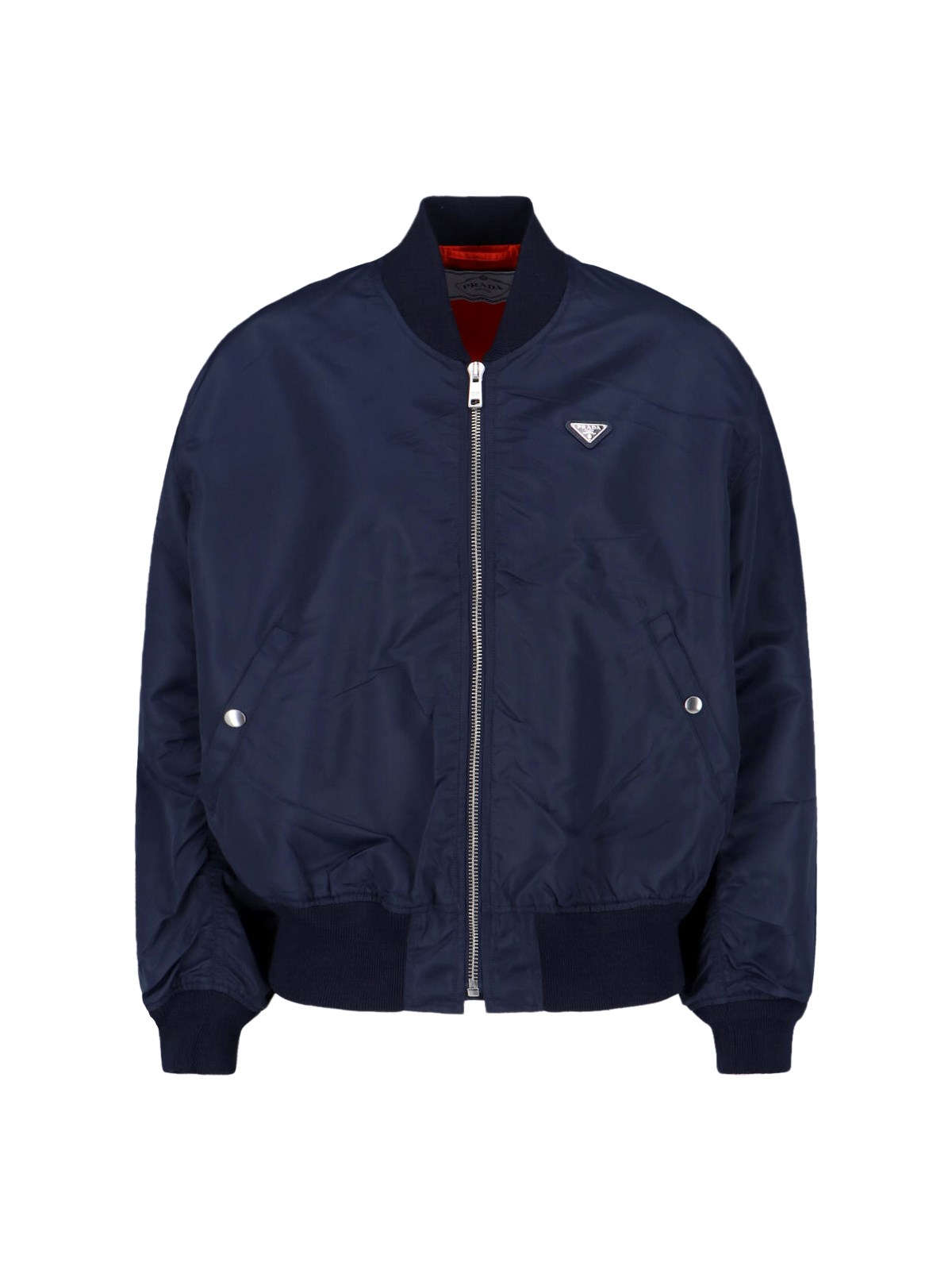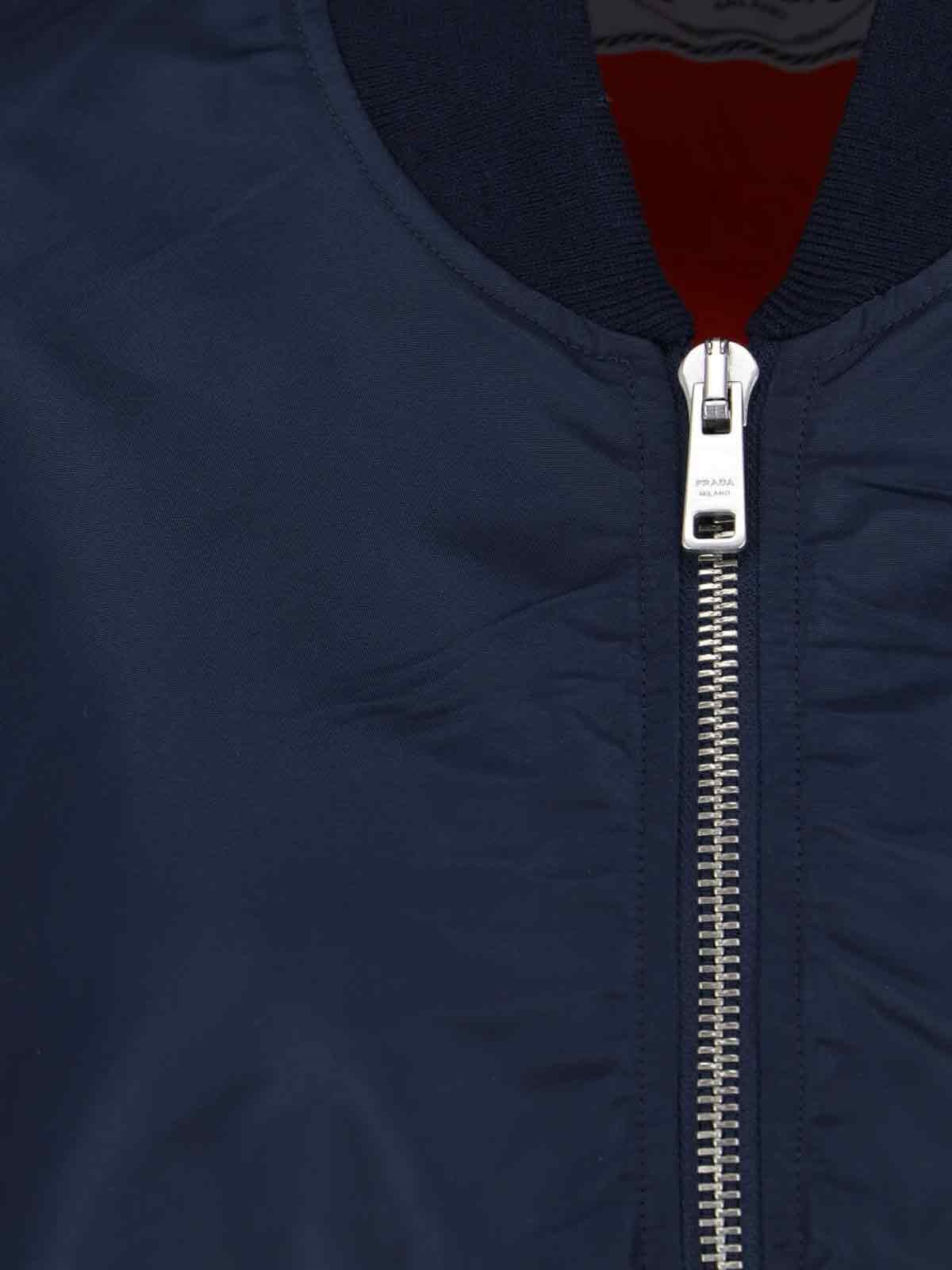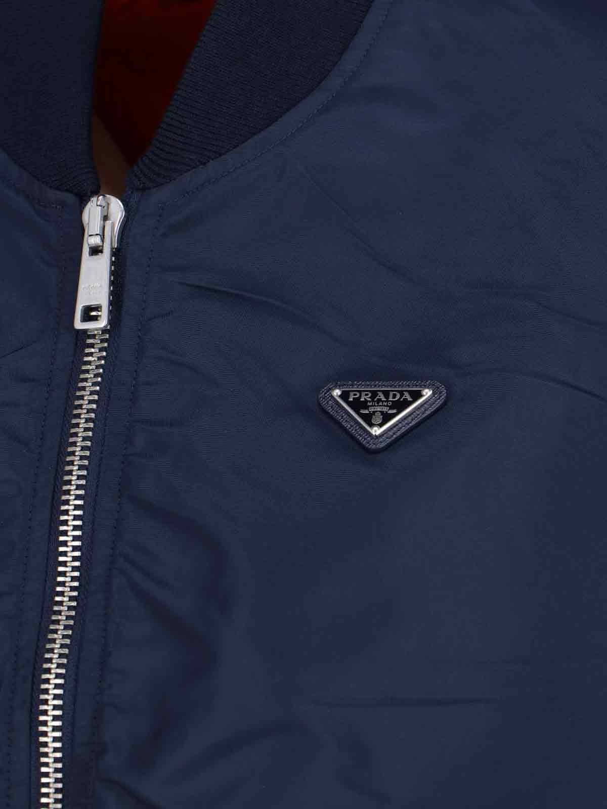 Prada Re-Nylon dark blue bomber jacket with ribbed collar, zip closure, enameled metal triangle logo on the front, two side button flap pockets, inner button pocket, ribbed cuffs, straight elastic hem.