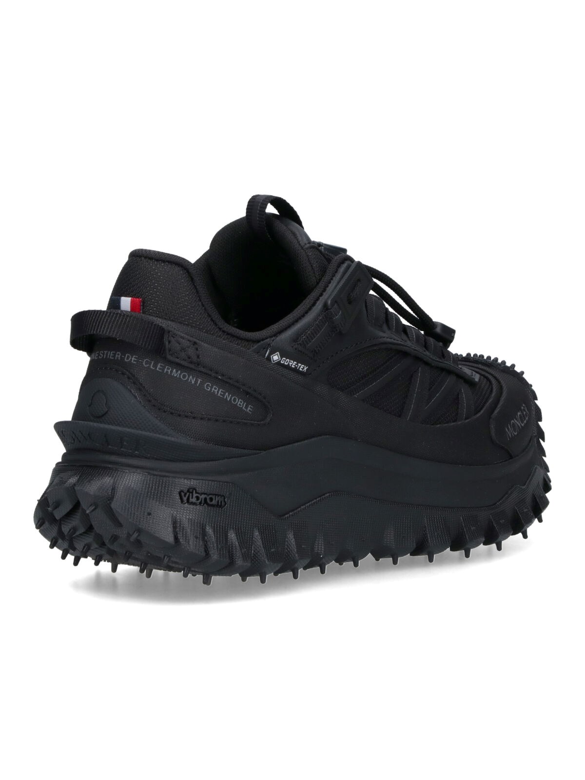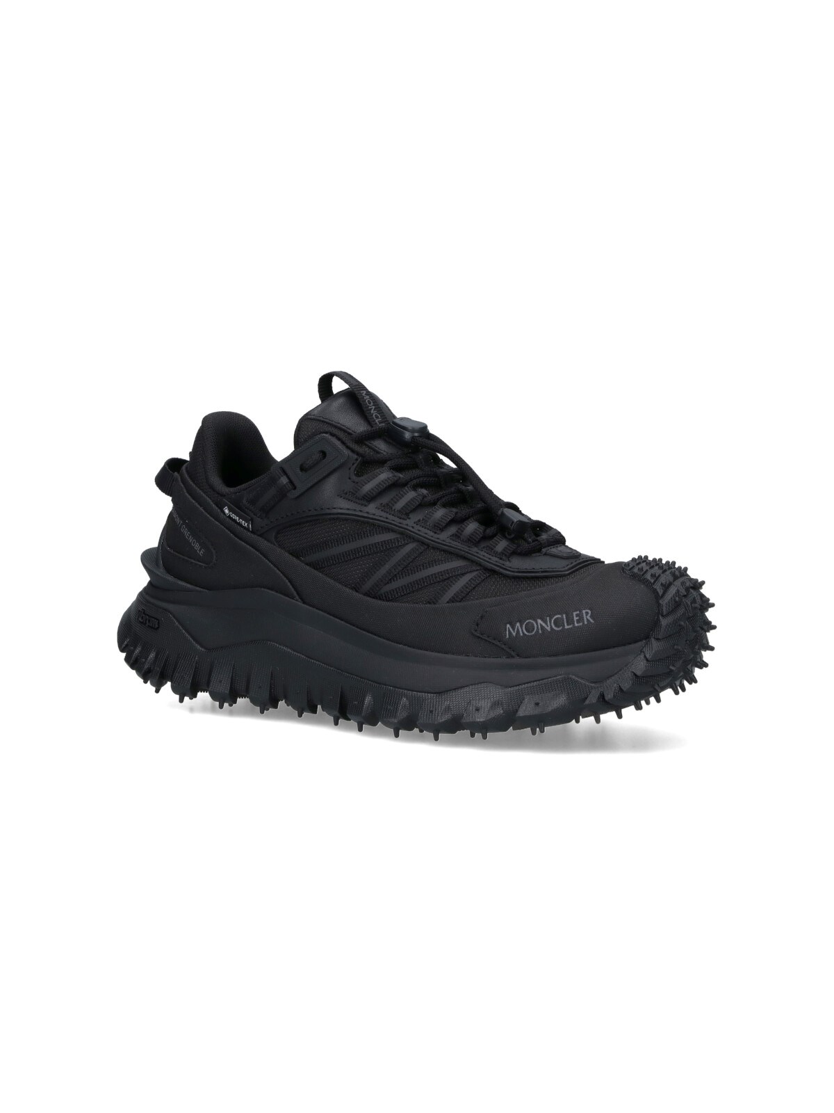 Moncler Trailgrip GTX sneakers in black fabric with round toe, tone-on-tone laces, adjustable drawstring, embossed logo on the front, tone-on-tone finish, and textured Vibram carbon fiber sole.