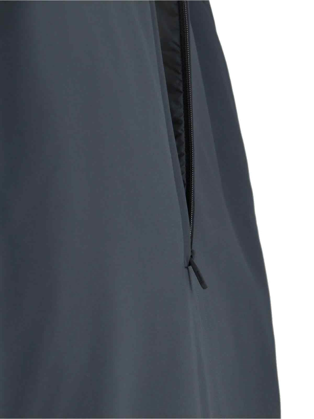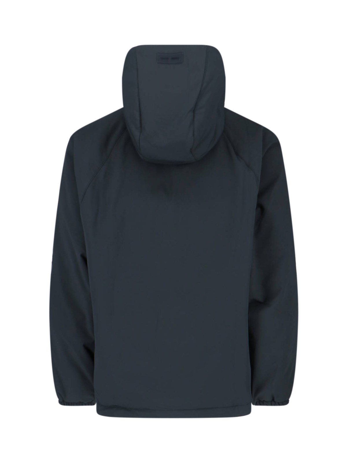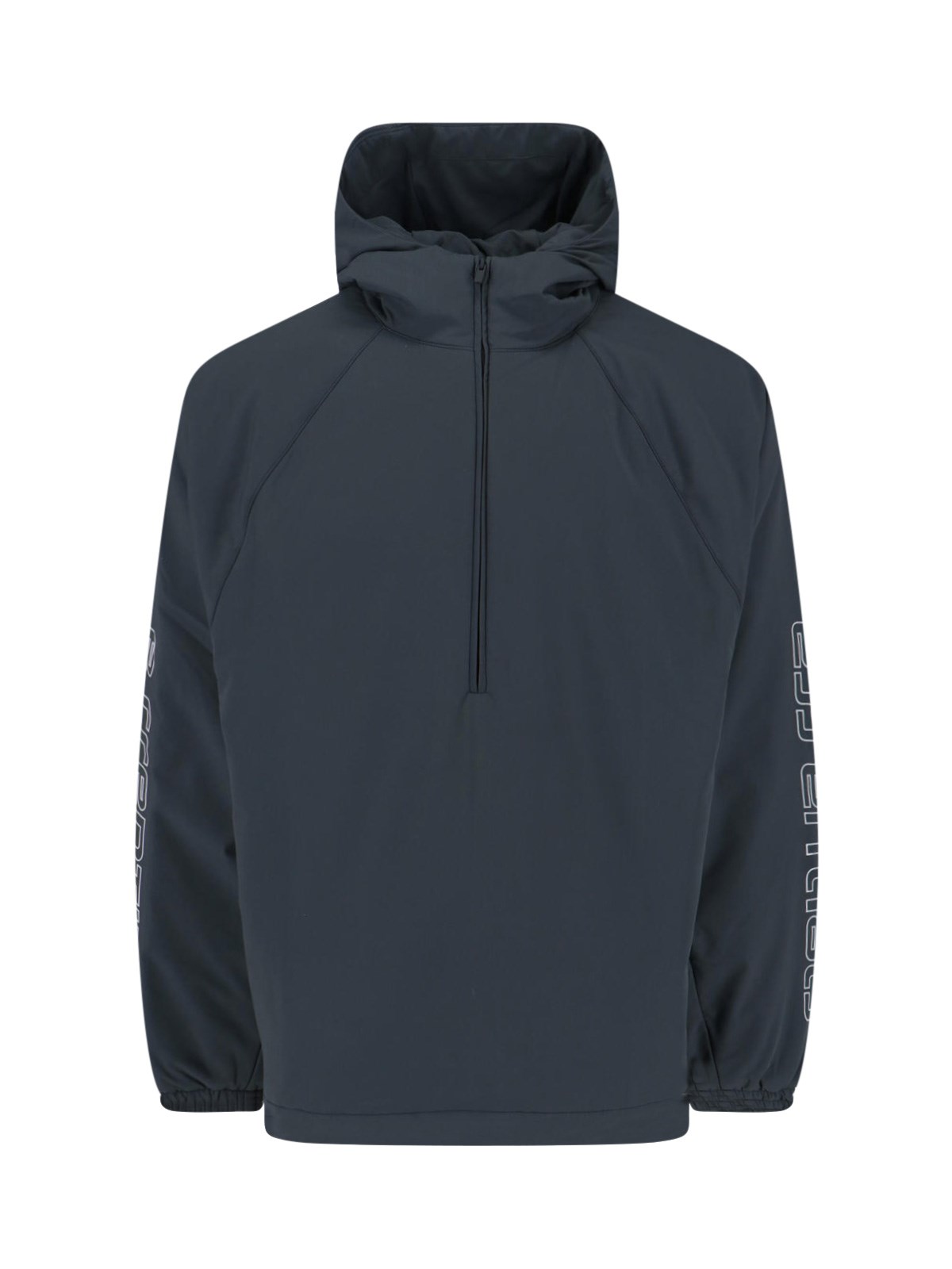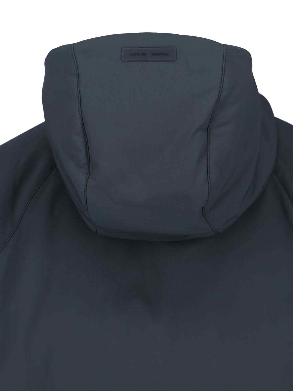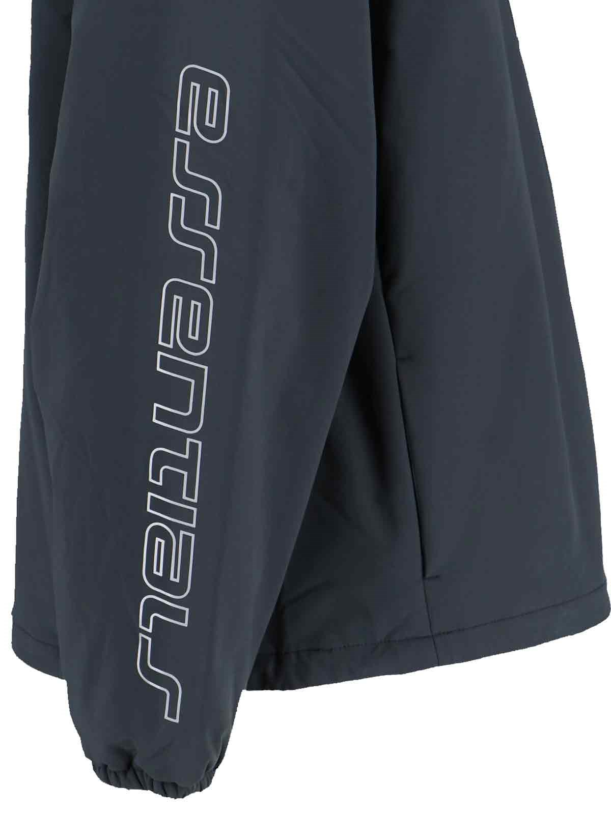 Fear of God Essentials zip jacket in black stretch fabric with hood, front zip closure, long sleeves, two side zip pockets, contrasting logo on the side, and straight hem.