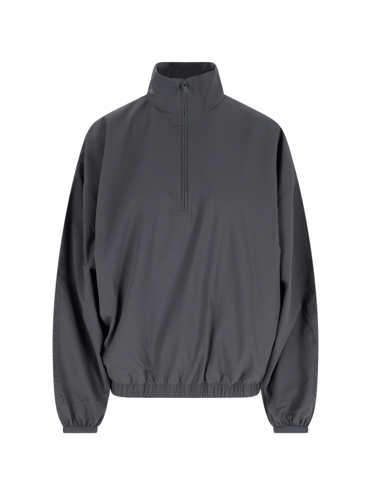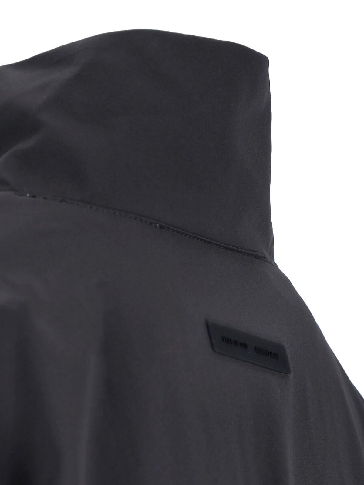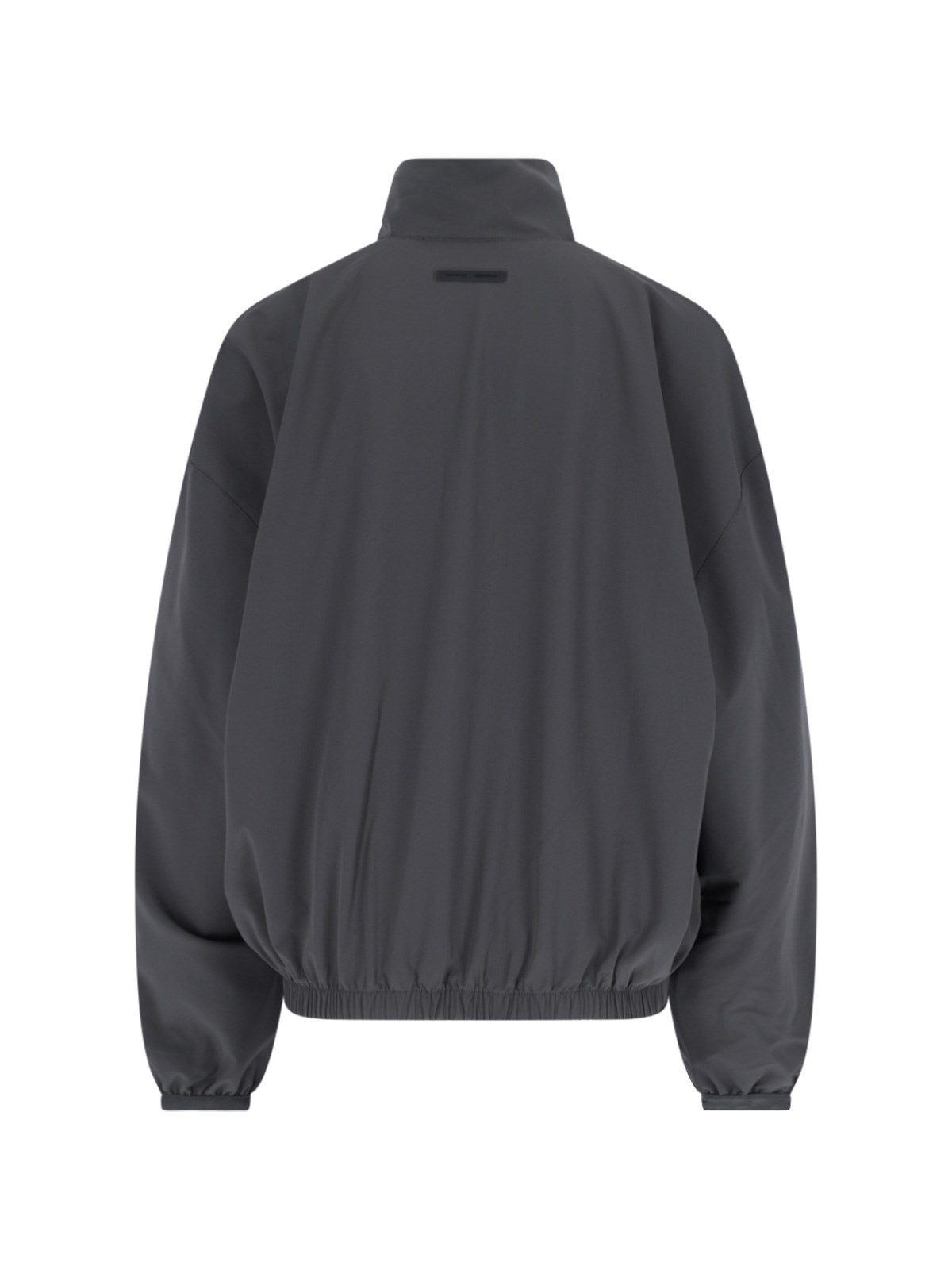 Fear of God Essentials zip jacket in gray stretch fabric with high neck, front zip closure, long sleeves, logo tag at the back, straight hem.