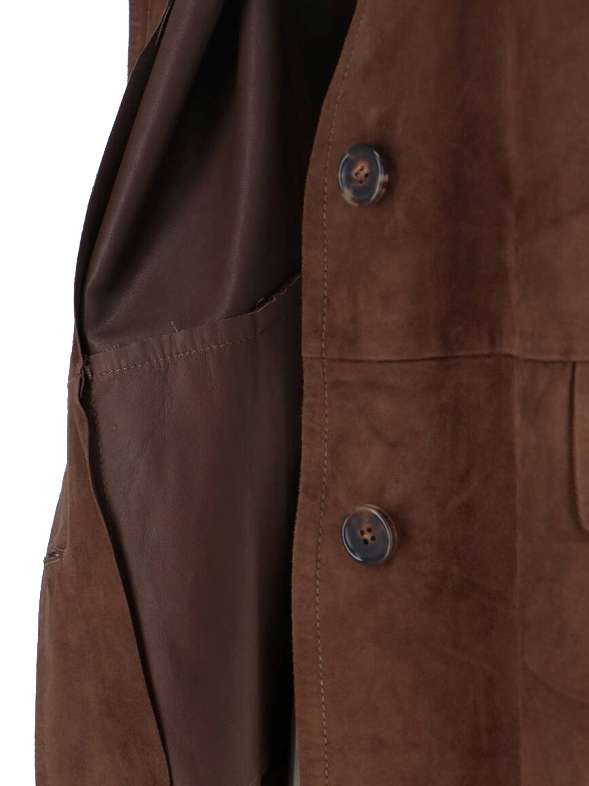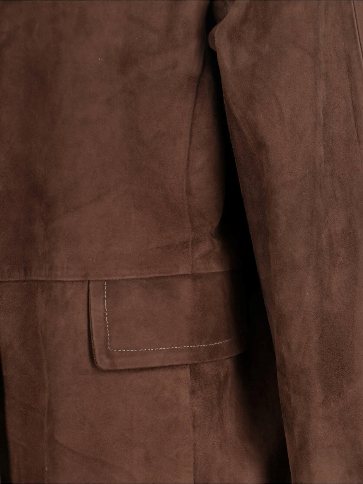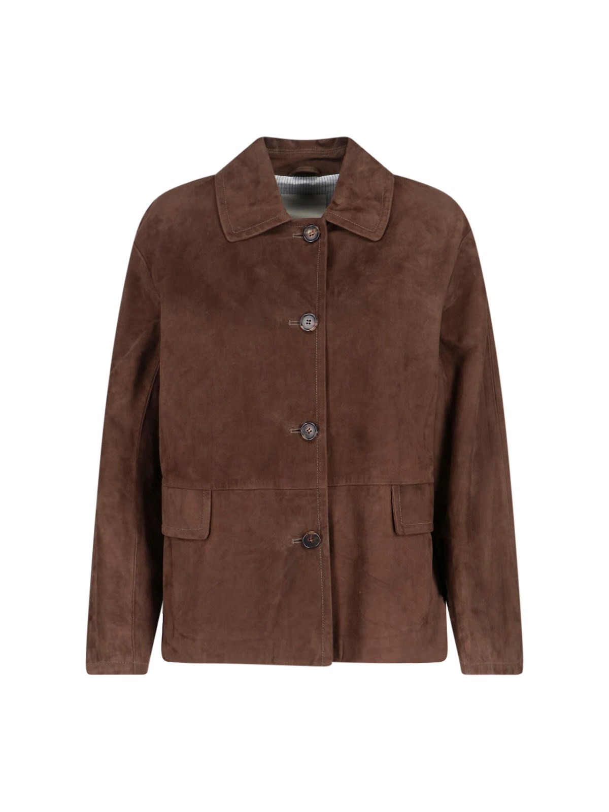 "charme"s Max Mara jacket in dark brown lamb suede with collar, front button closure, long sleeves, two front flap pockets, and straight hem.