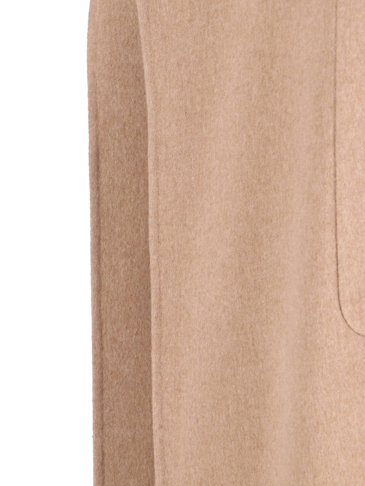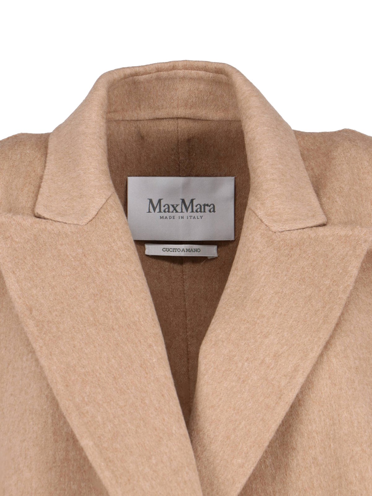 Max Mara camel coat, light brown, lapels, front belt closure, long sleeves, two front pockets, straight hem.