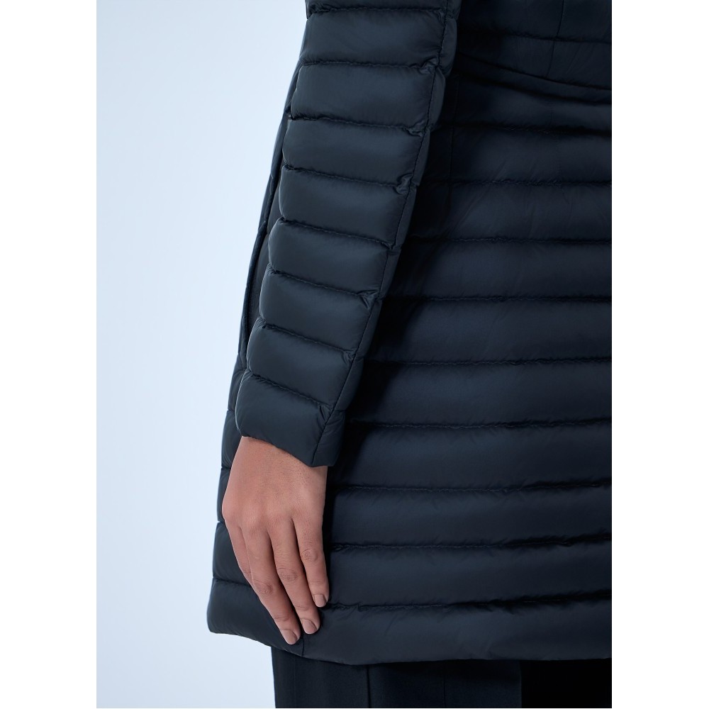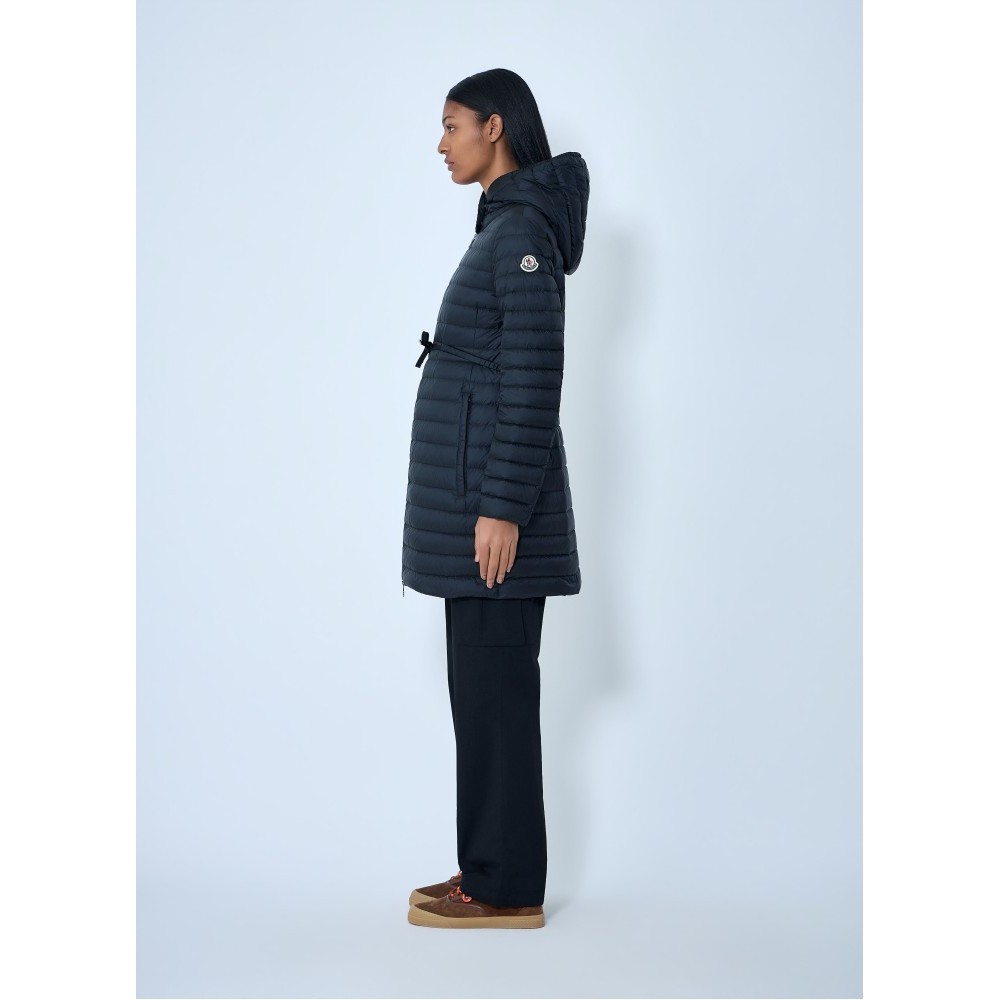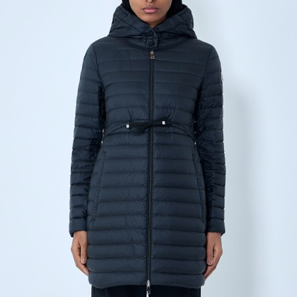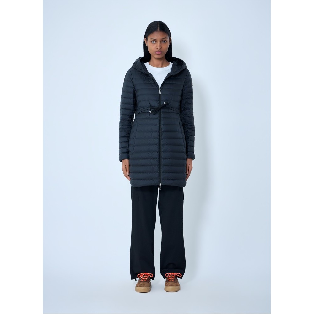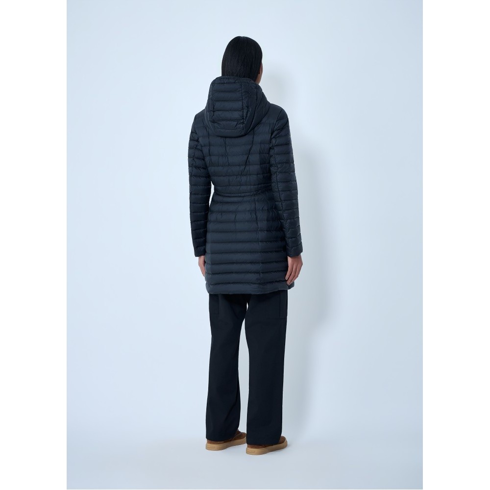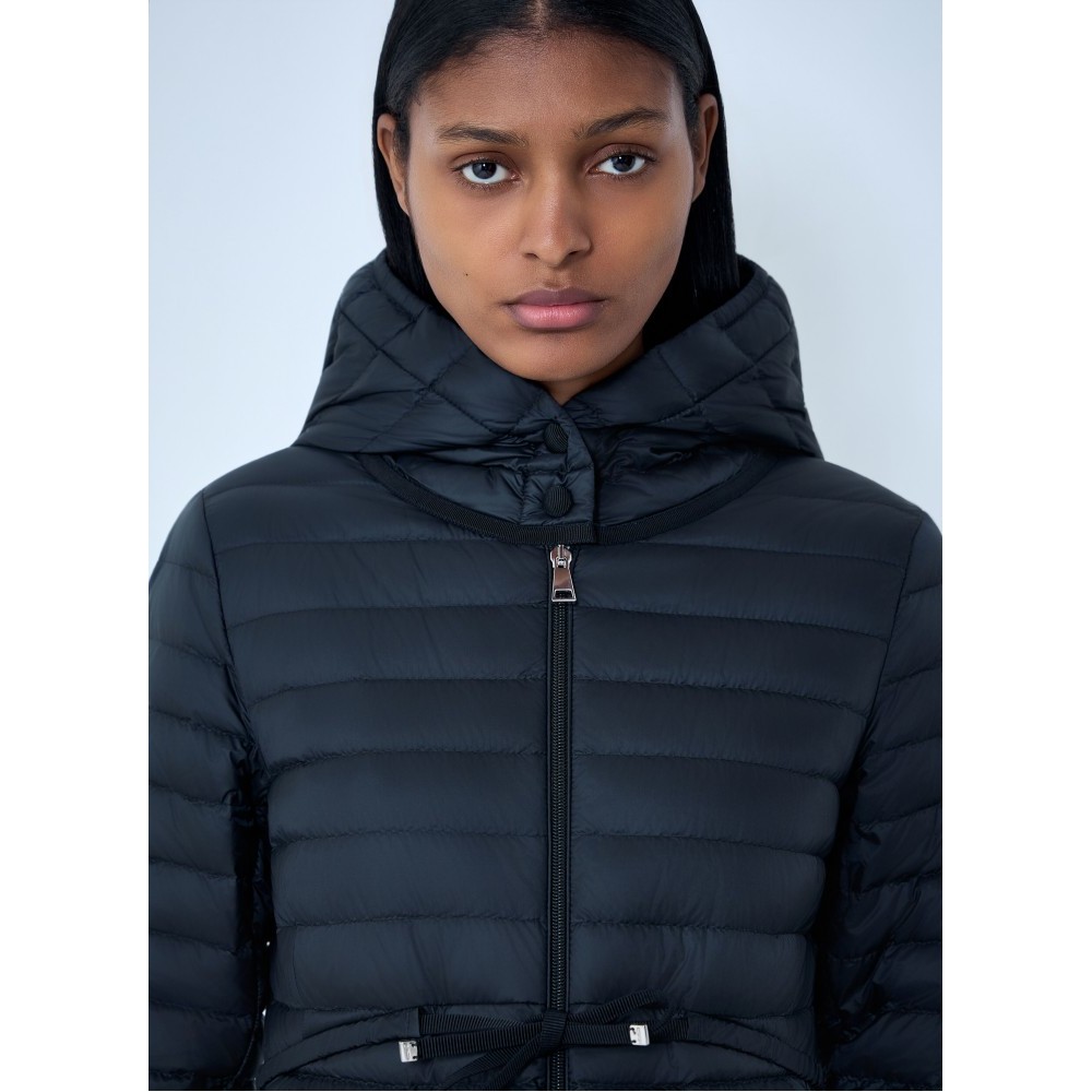 Long puffer coat with hood and adjustable drawstring waist.