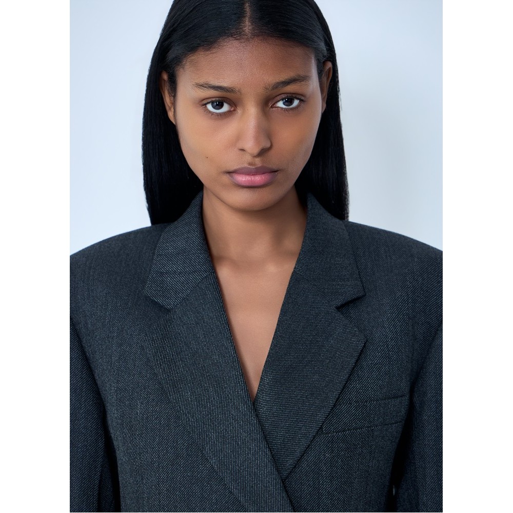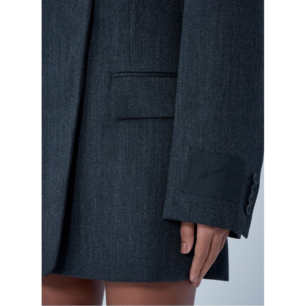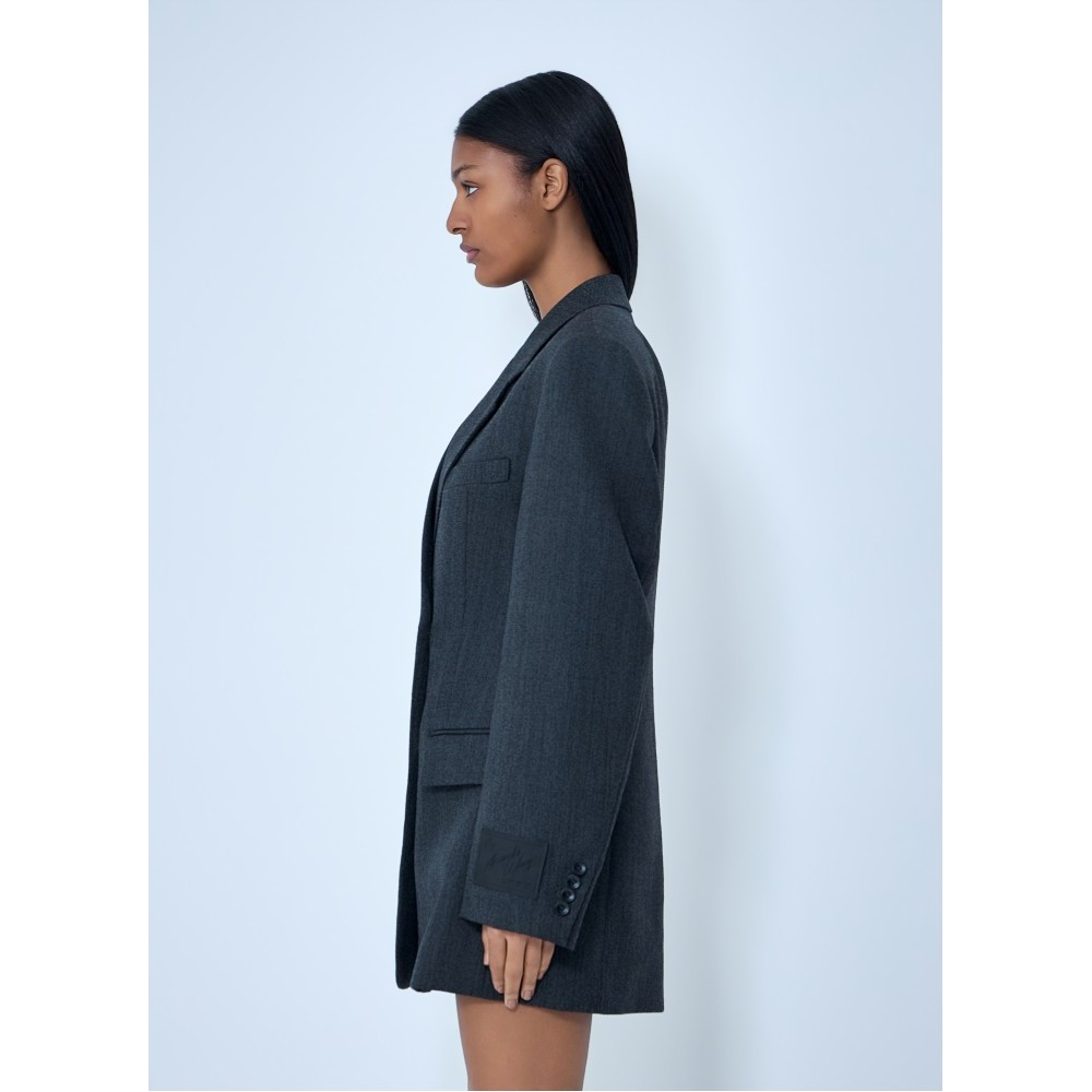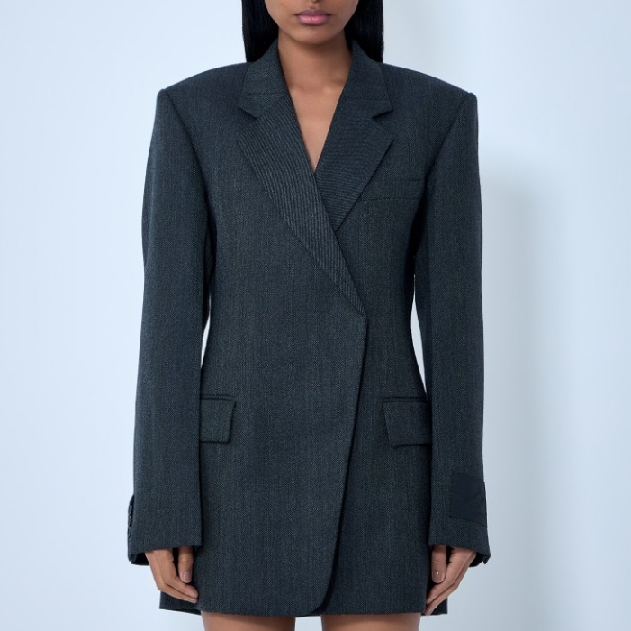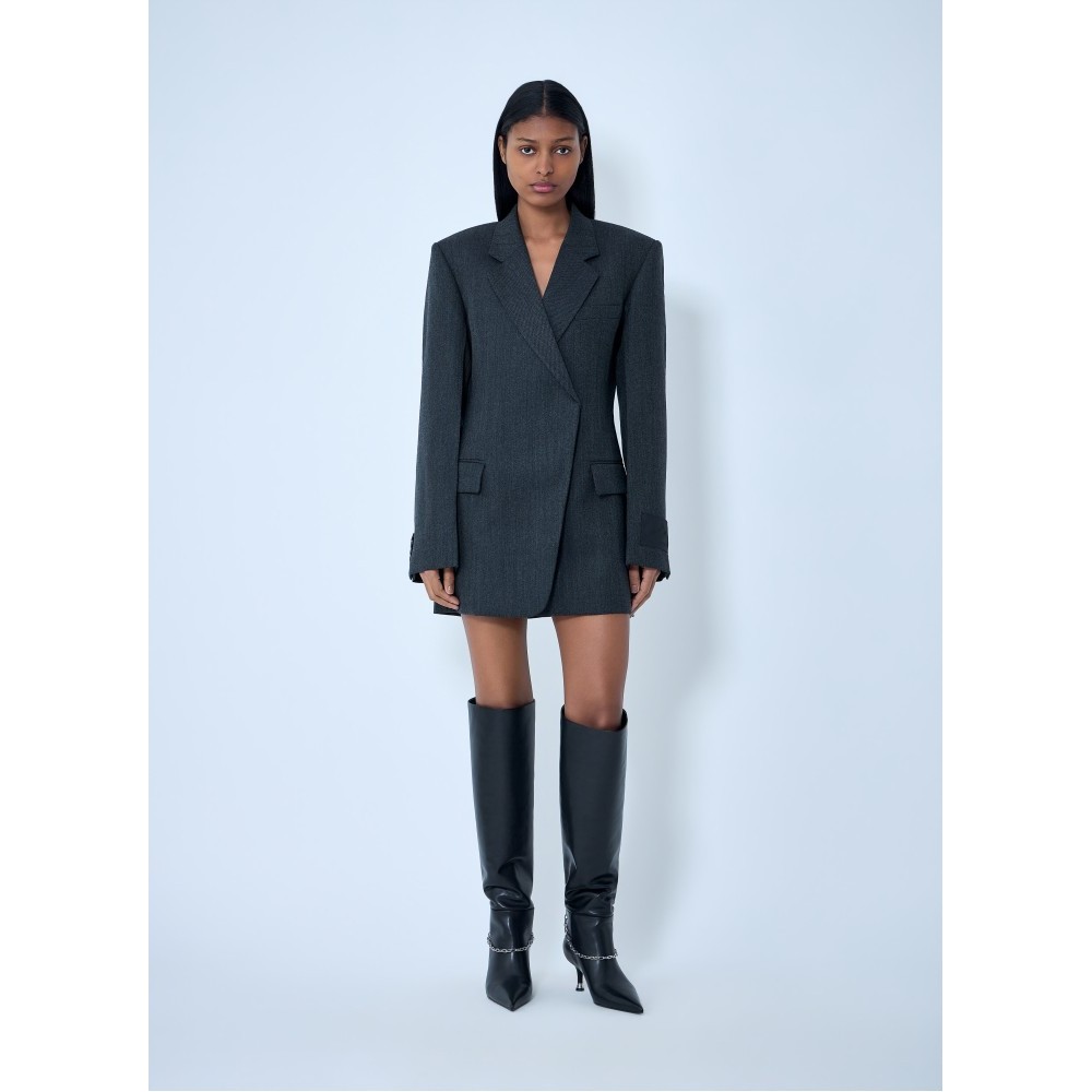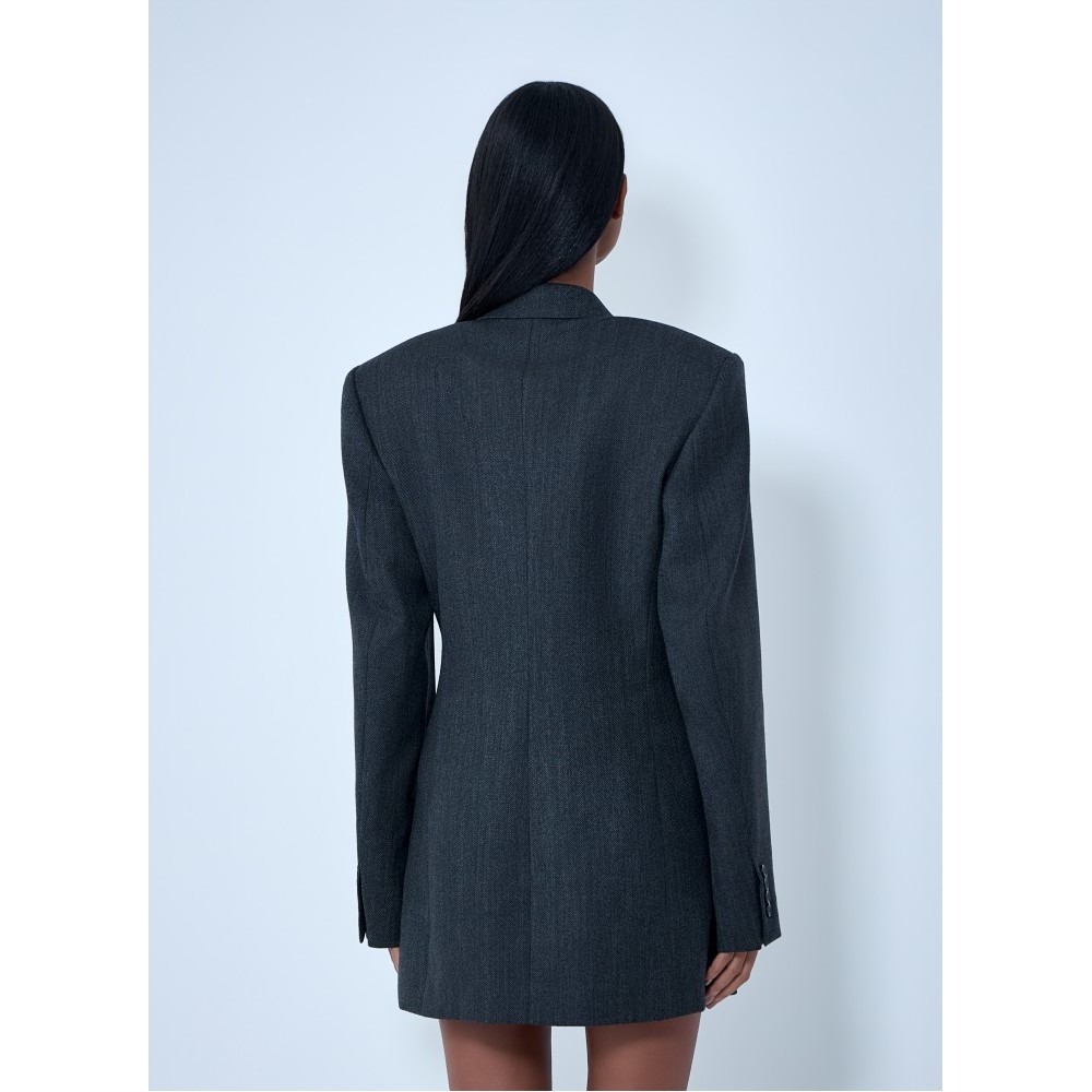 Double-breasted tailored blazer dress in wool blend.
