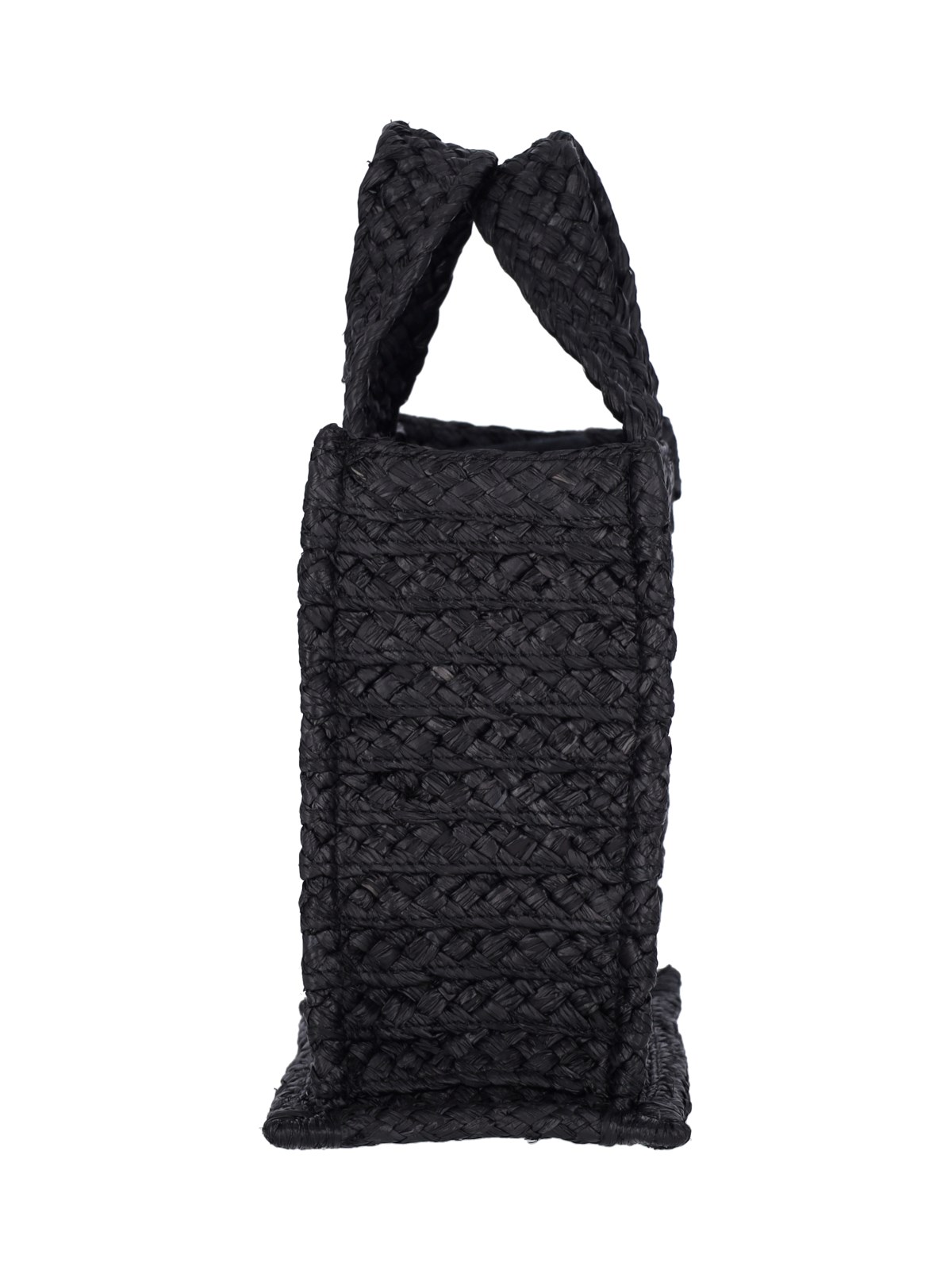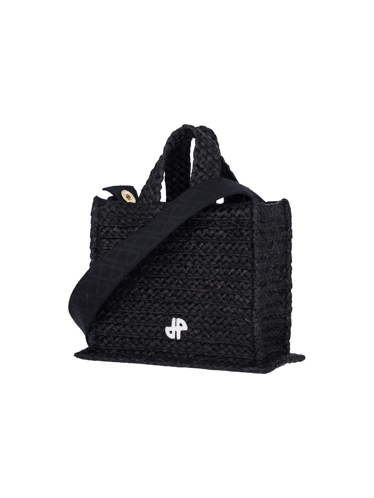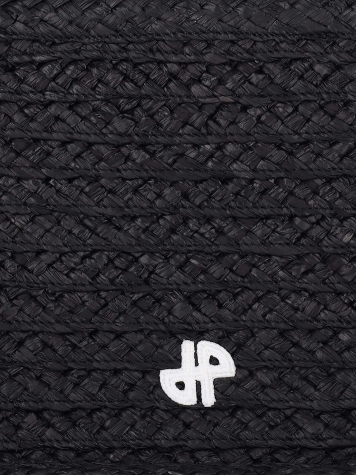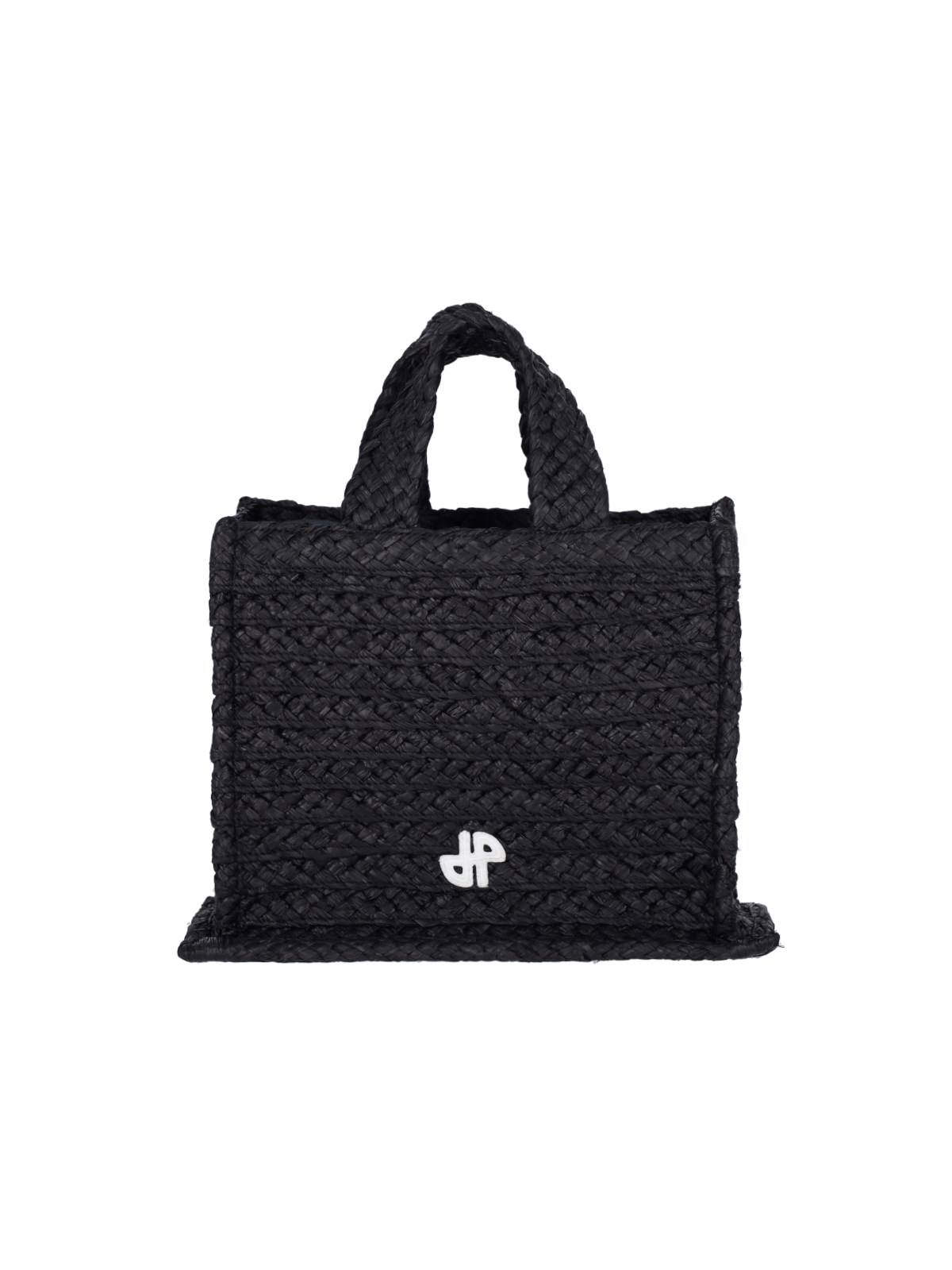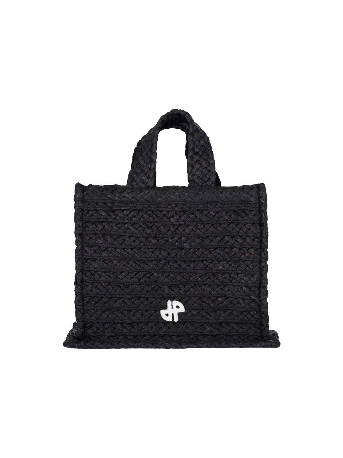 Patou "JP" small handbag in black raffia with two handles, removable fabric shoulder strap, contrast logo embroidery on the front, inner compartment.