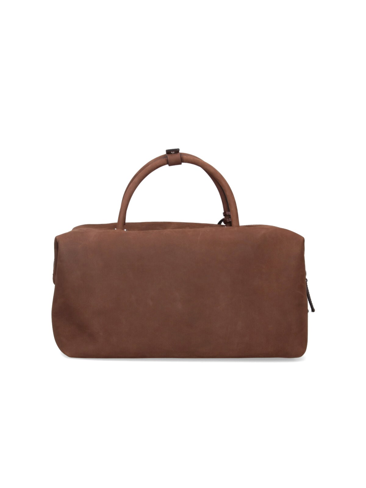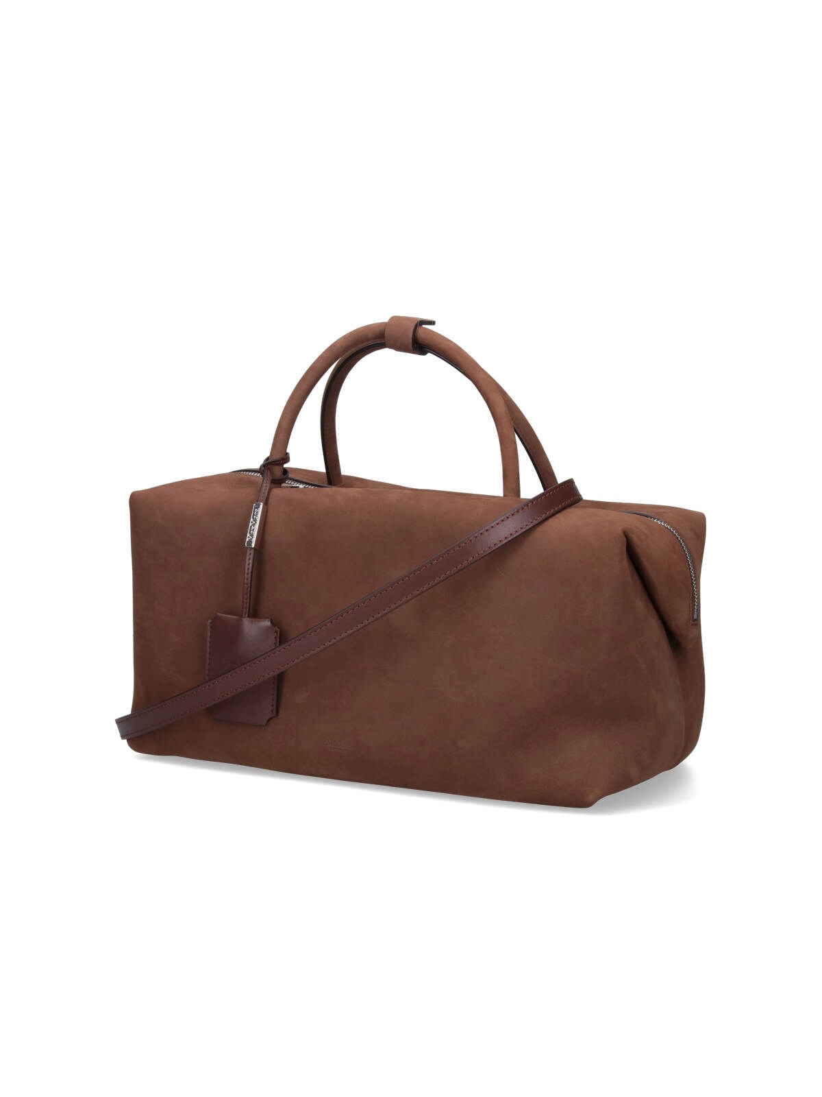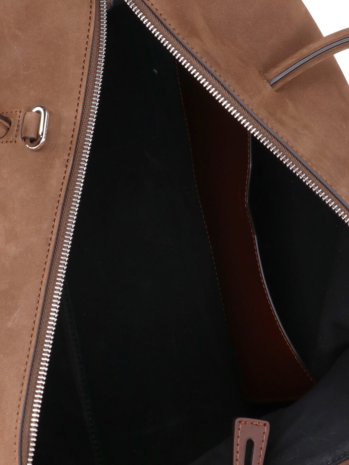 Max Mara 'HoldAll' calf suede medium bag, brown, two handles, removable padlock charm detail, removable shoulder strap, zipper closure, one interior flat pocket, one interior single compartment.