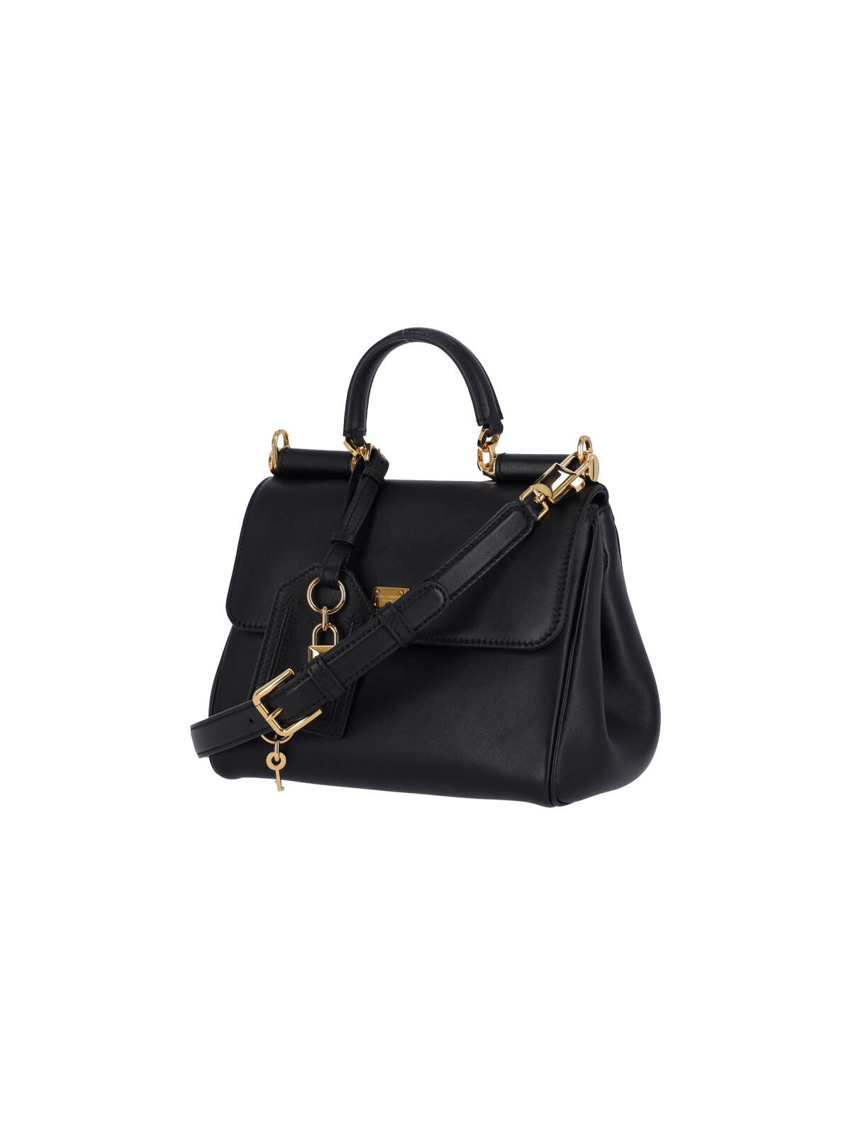 Dolce & Gabbana 'My Sicily' black calf leather handbag with handle, removable gold metal padlock charm detail, adjustable and removable shoulder strap, interlocking flap closure, gold metal logo tag detail, inner zip pocket, main inner compartment.