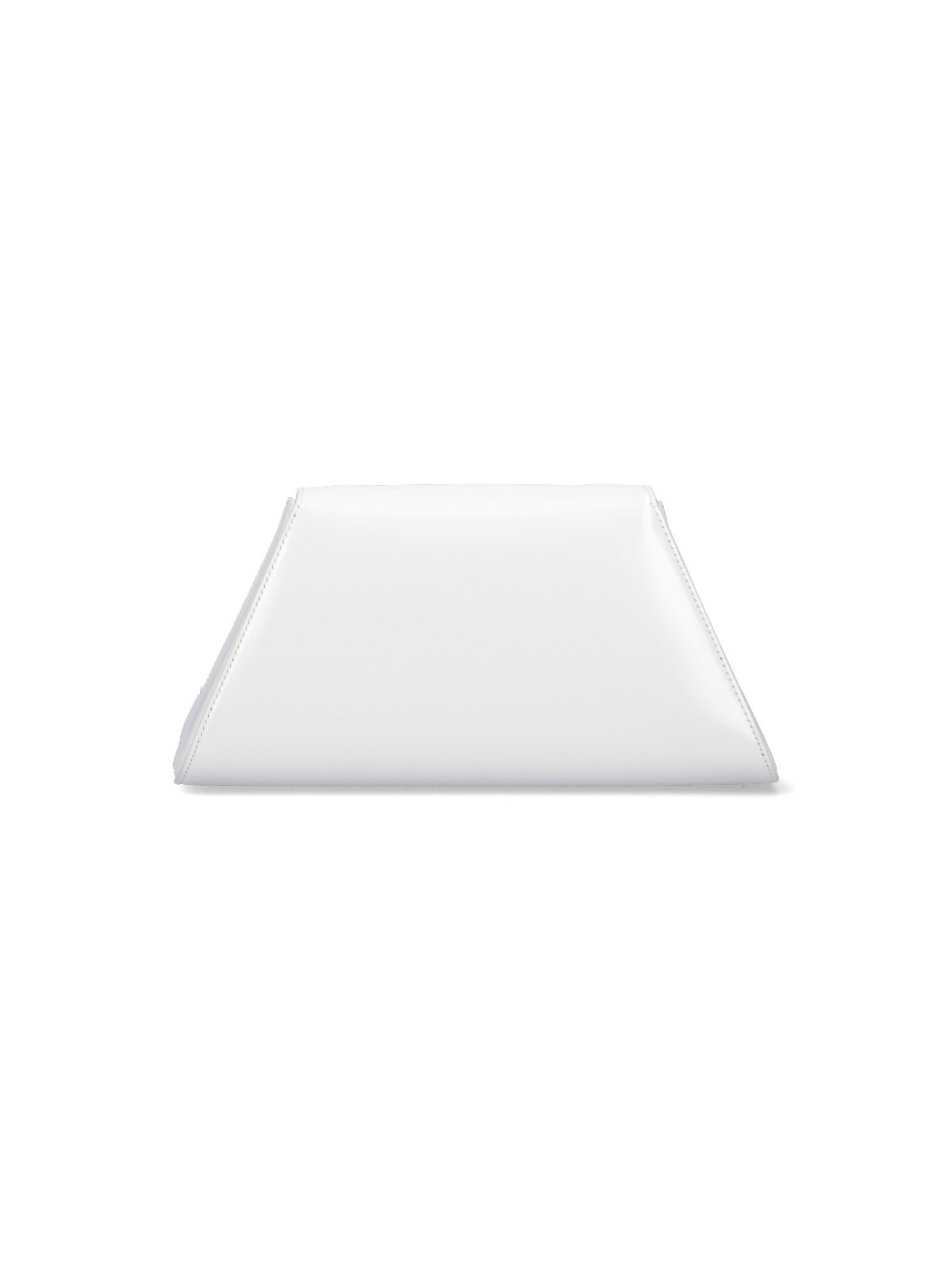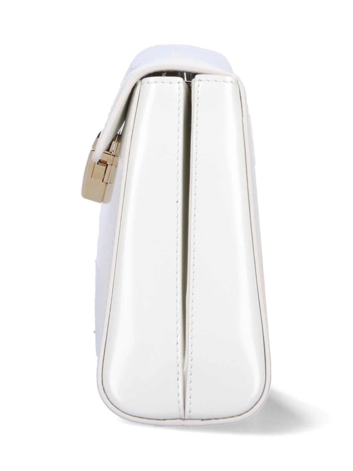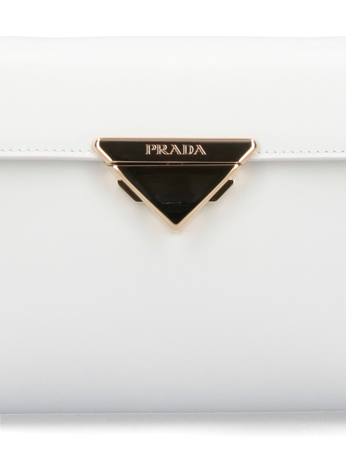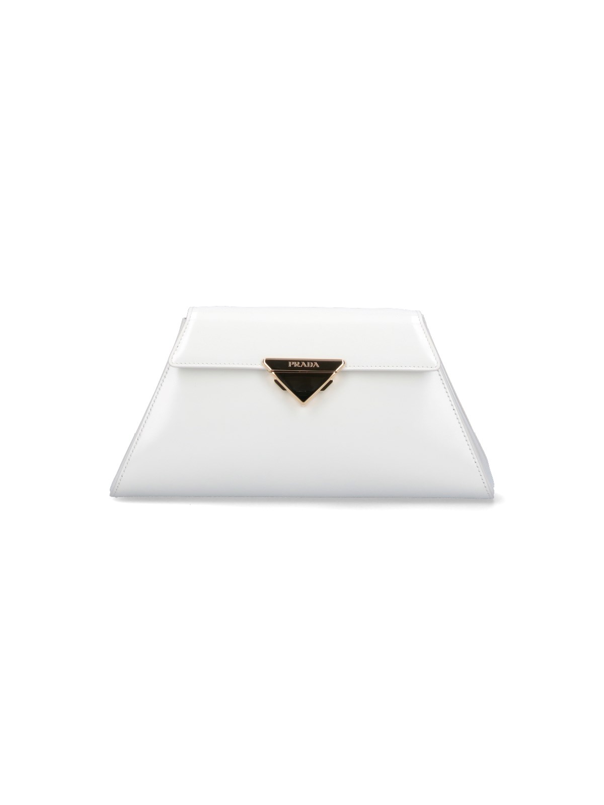 Prada medium handbag in white leather with removable adjustable handle, removable adjustable shoulder strap, gold metal logo on the front, interior flat pocket, main inner compartment.