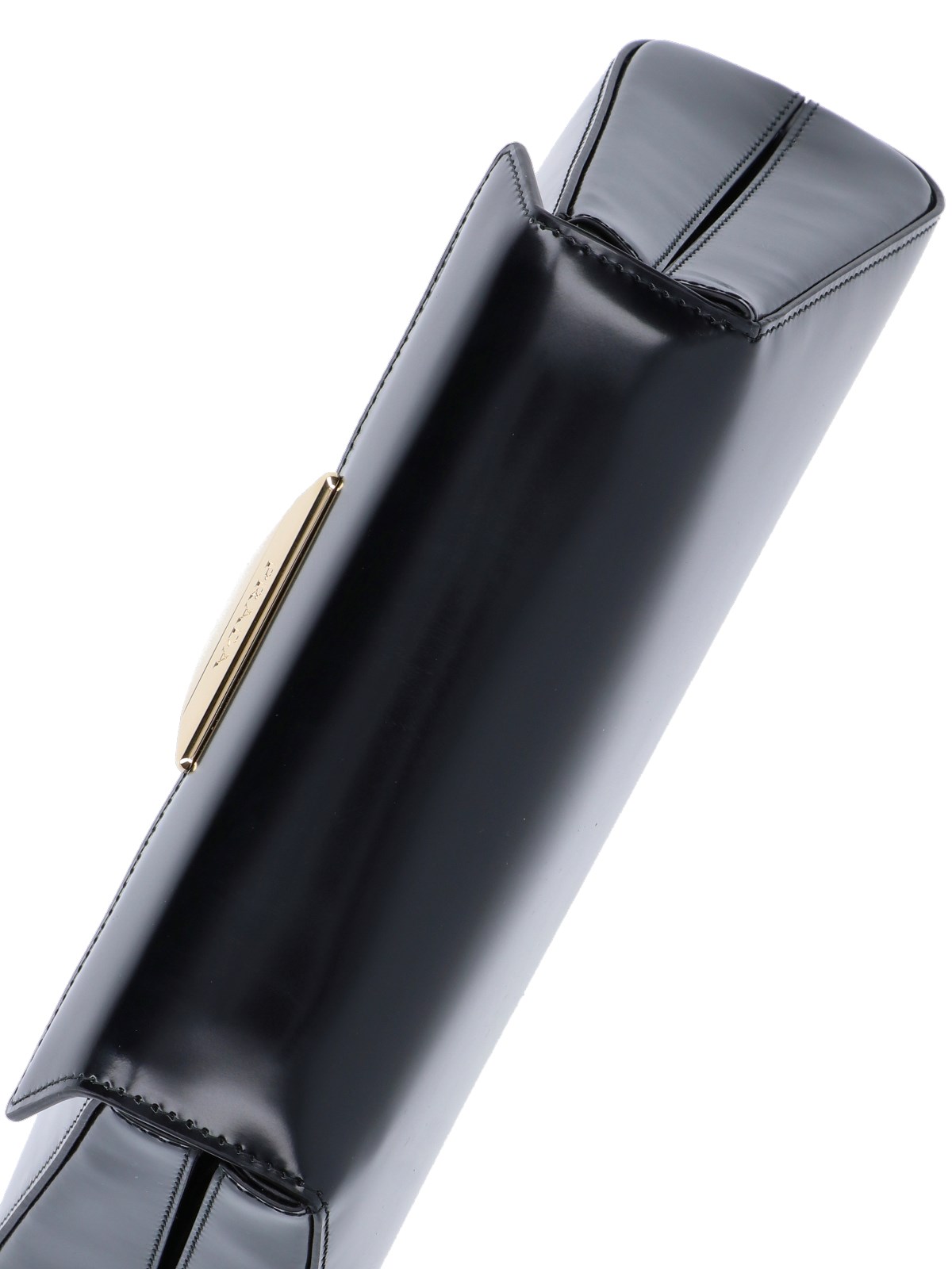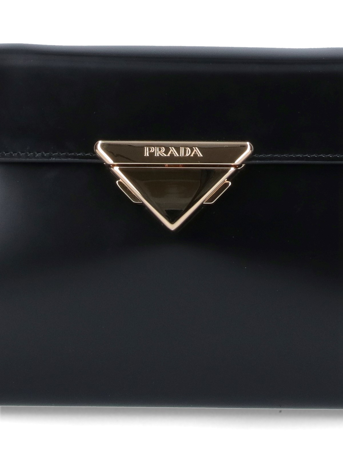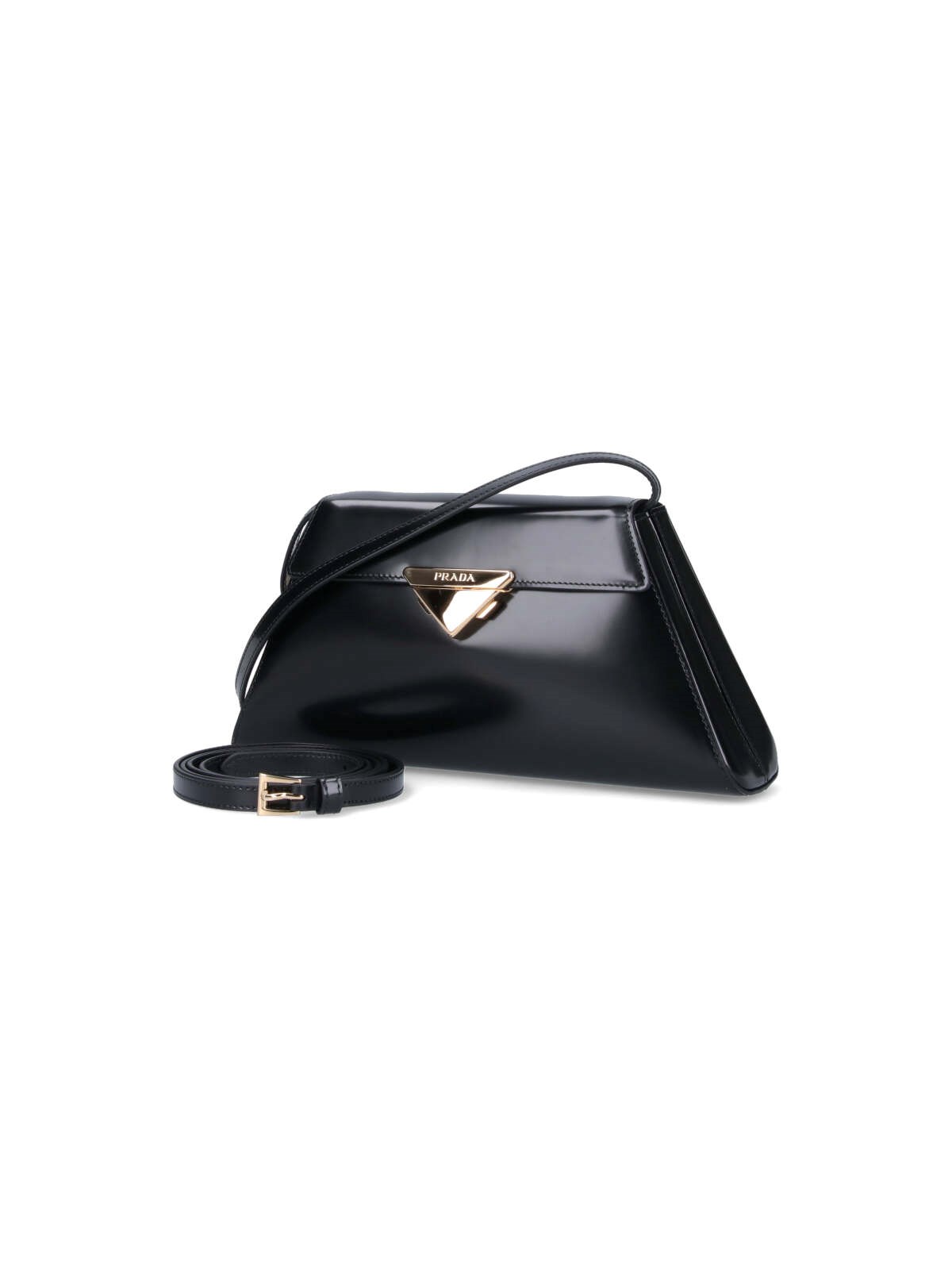 Prada medium handbag in black leather with removable adjustable leather handle on the top, removable adjustable leather shoulder strap, metal logo patch flap closure on the front, metal patch logo lettering detail, interior patch pocket, main interior compartment.