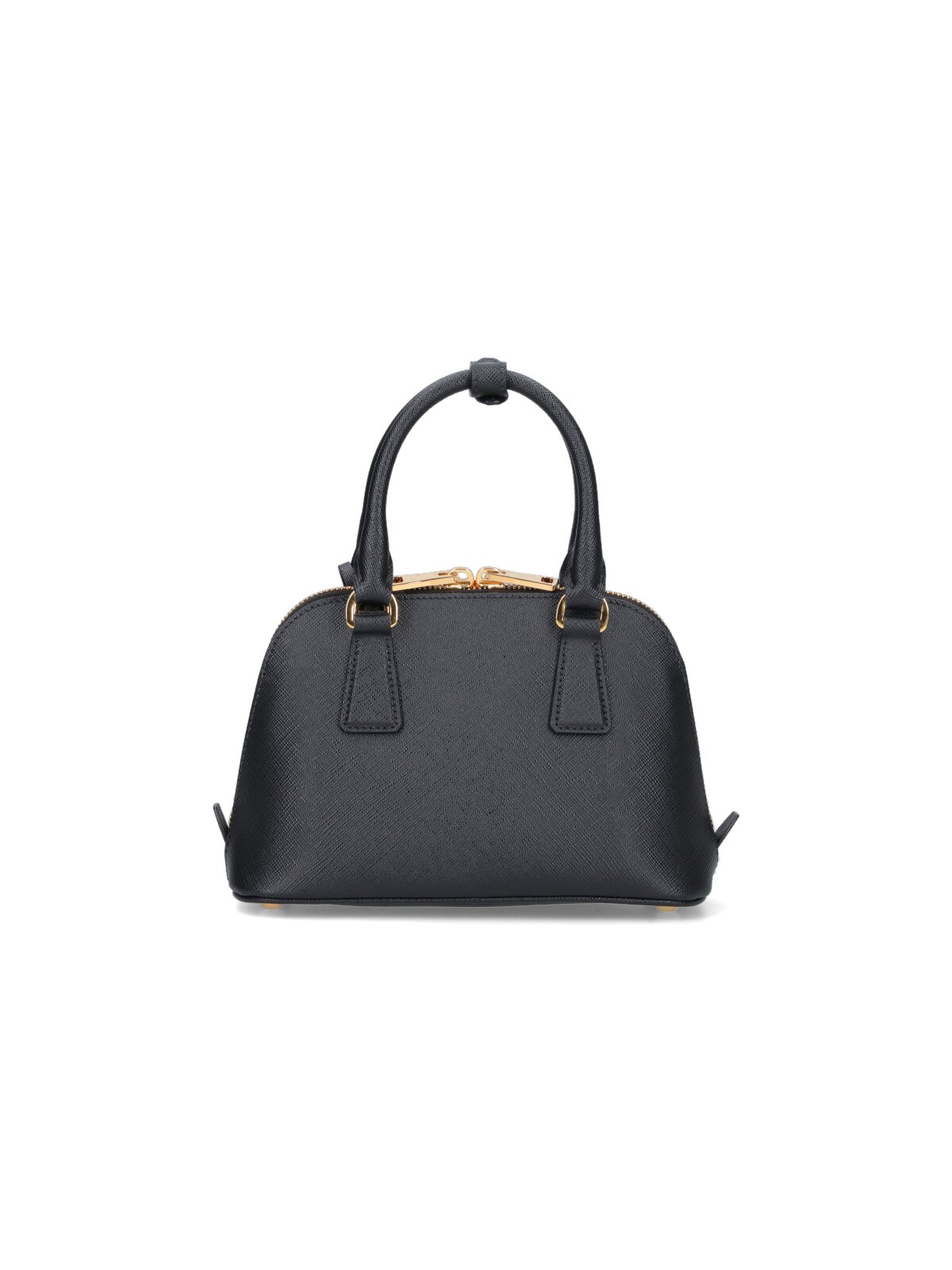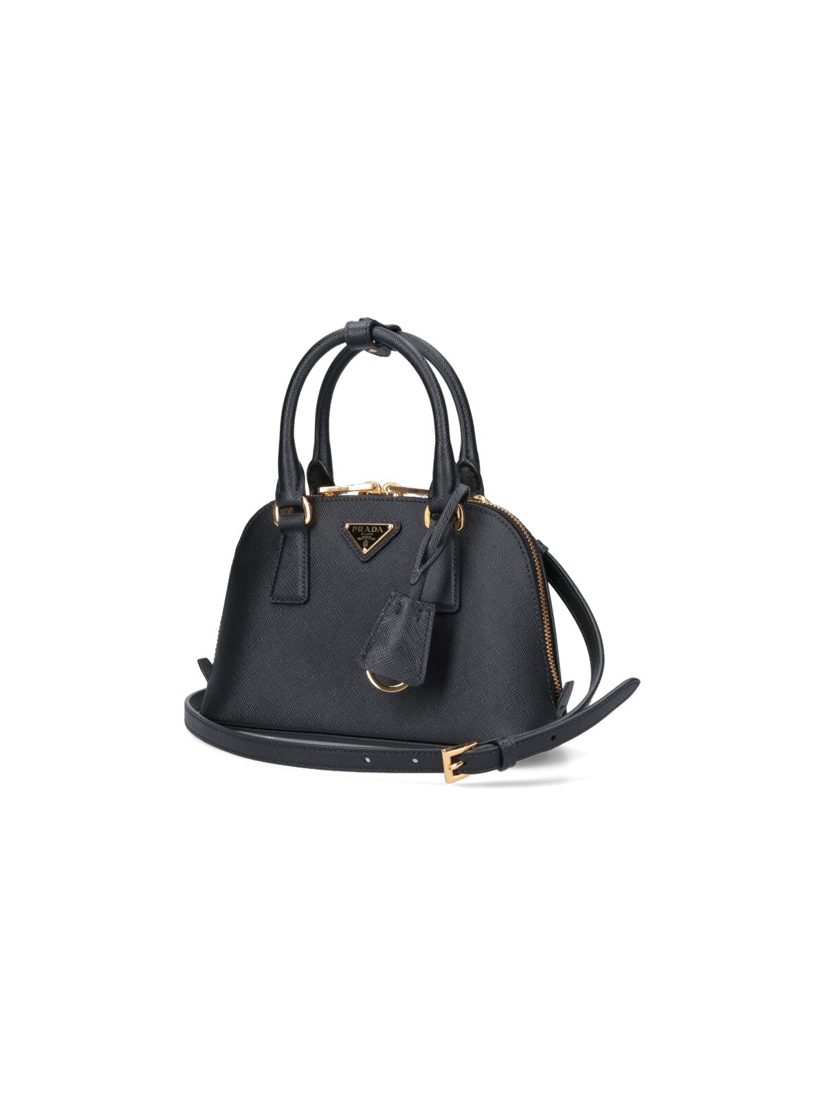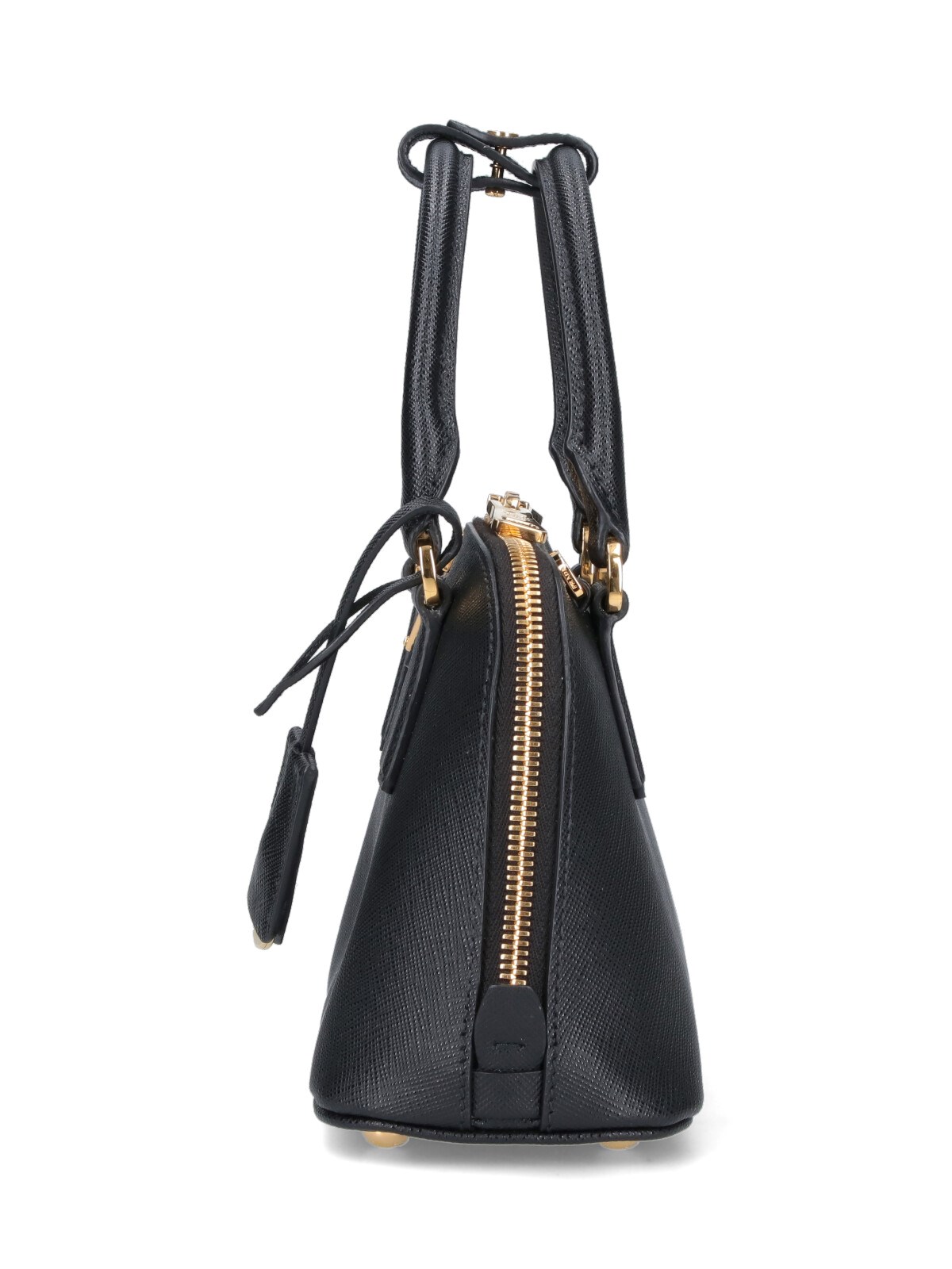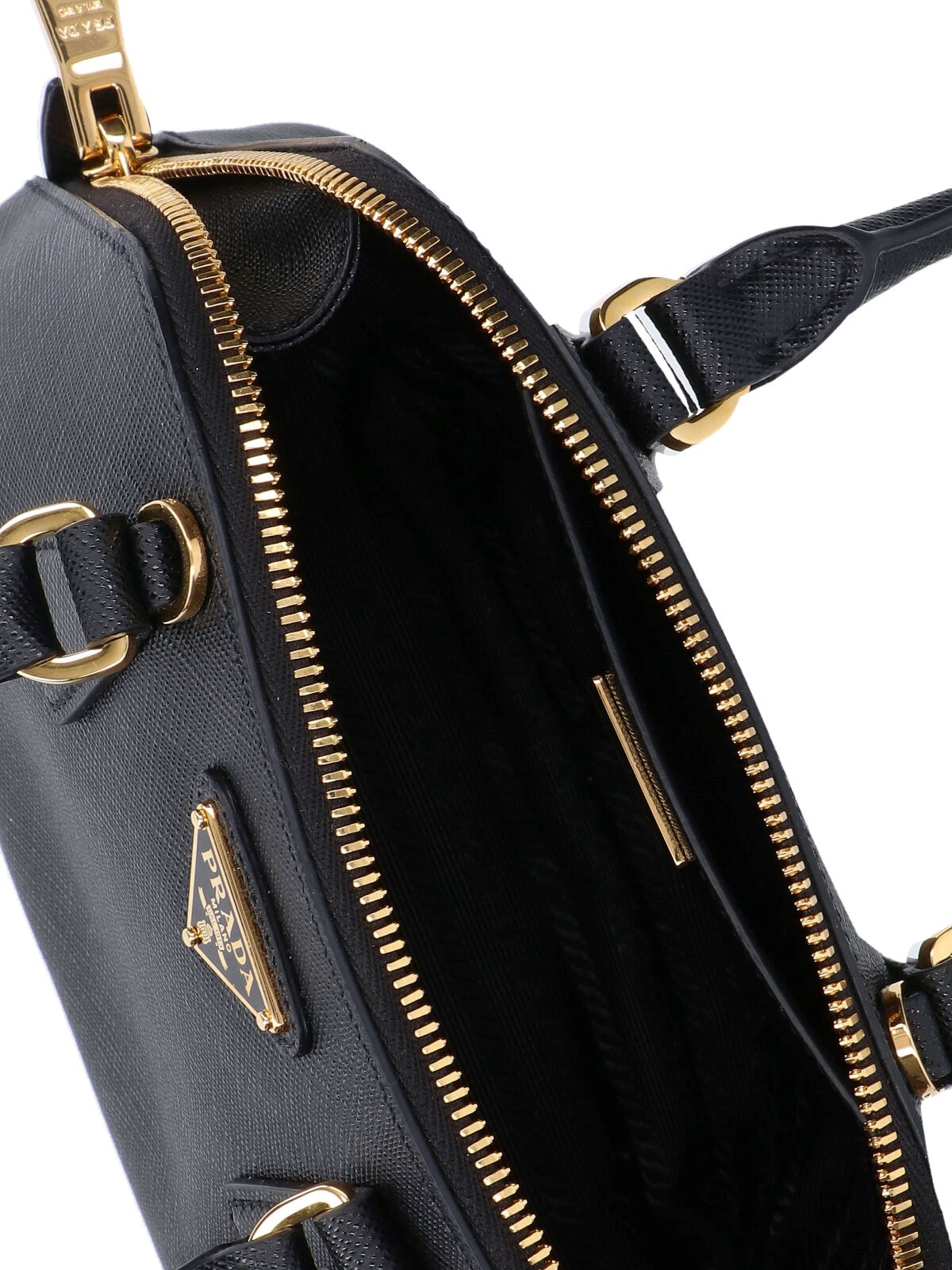 Prada Promenade handbag in black calf leather with top handle, double zip closure, adjustable and removable shoulder strap, gold metal triangle logo detail on the front, padlock charm on the front, gold trim, inner flat pocket, main inner compartment.