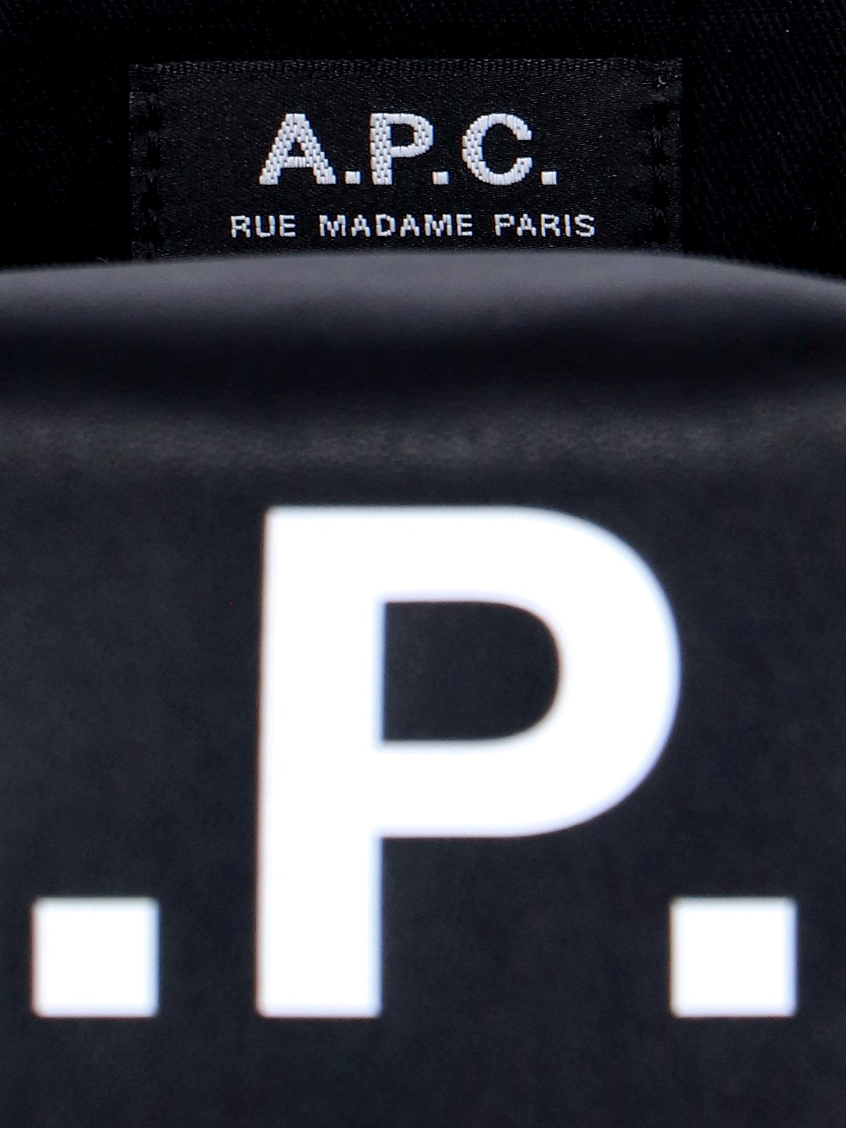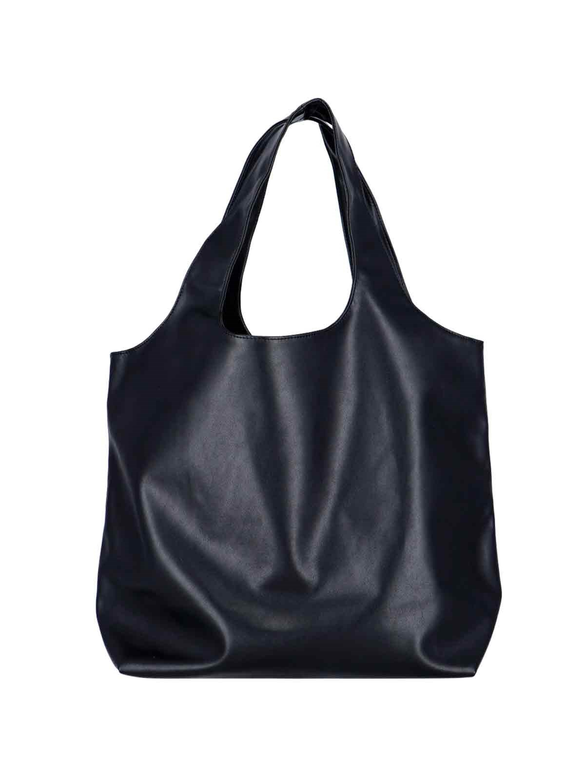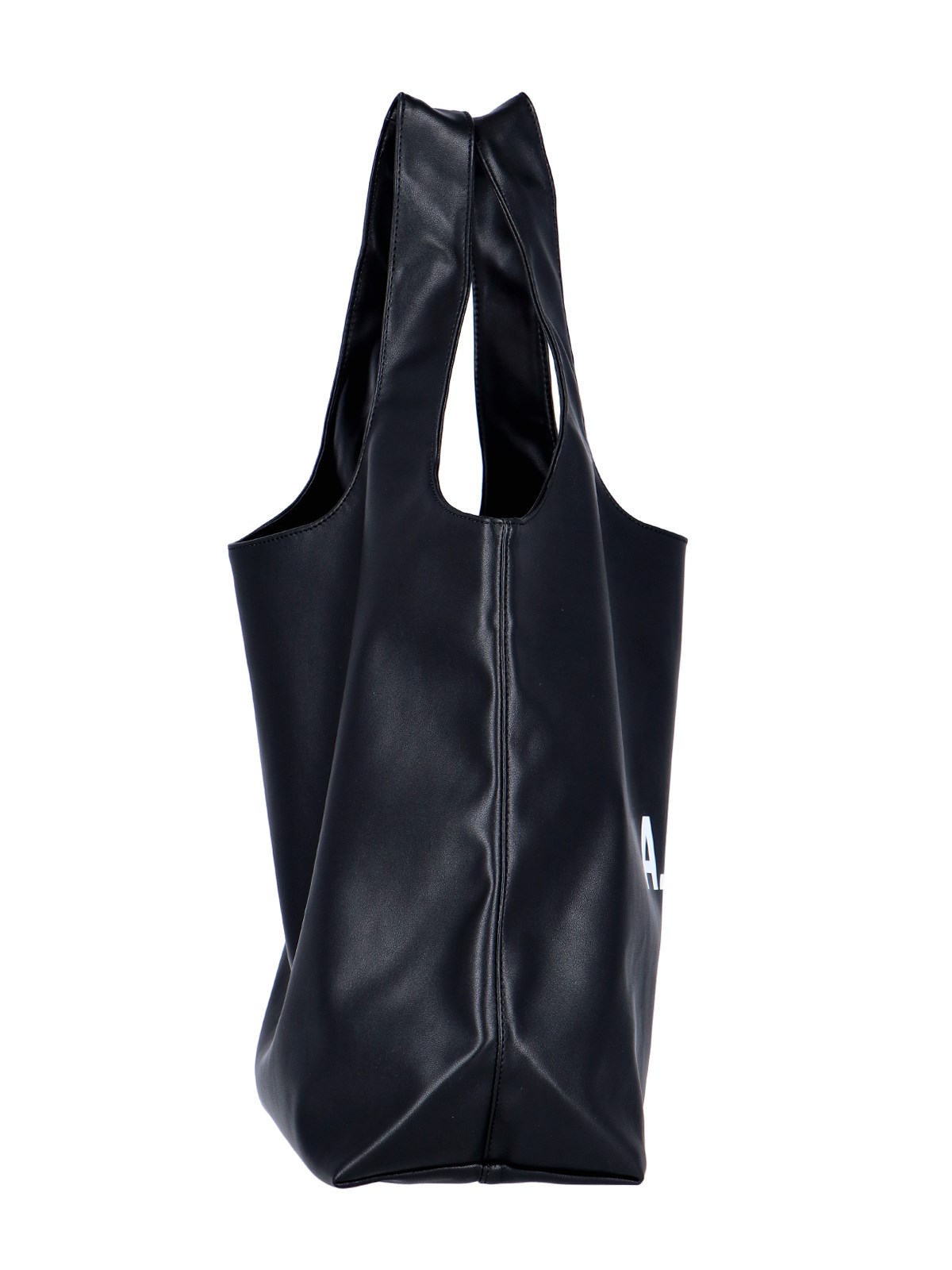 A.P.C. 'Ninon' tote bag with black eco leather, two upper handles, white logo print at the front, a main inner compartment.