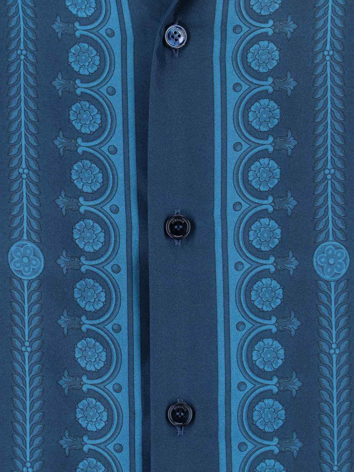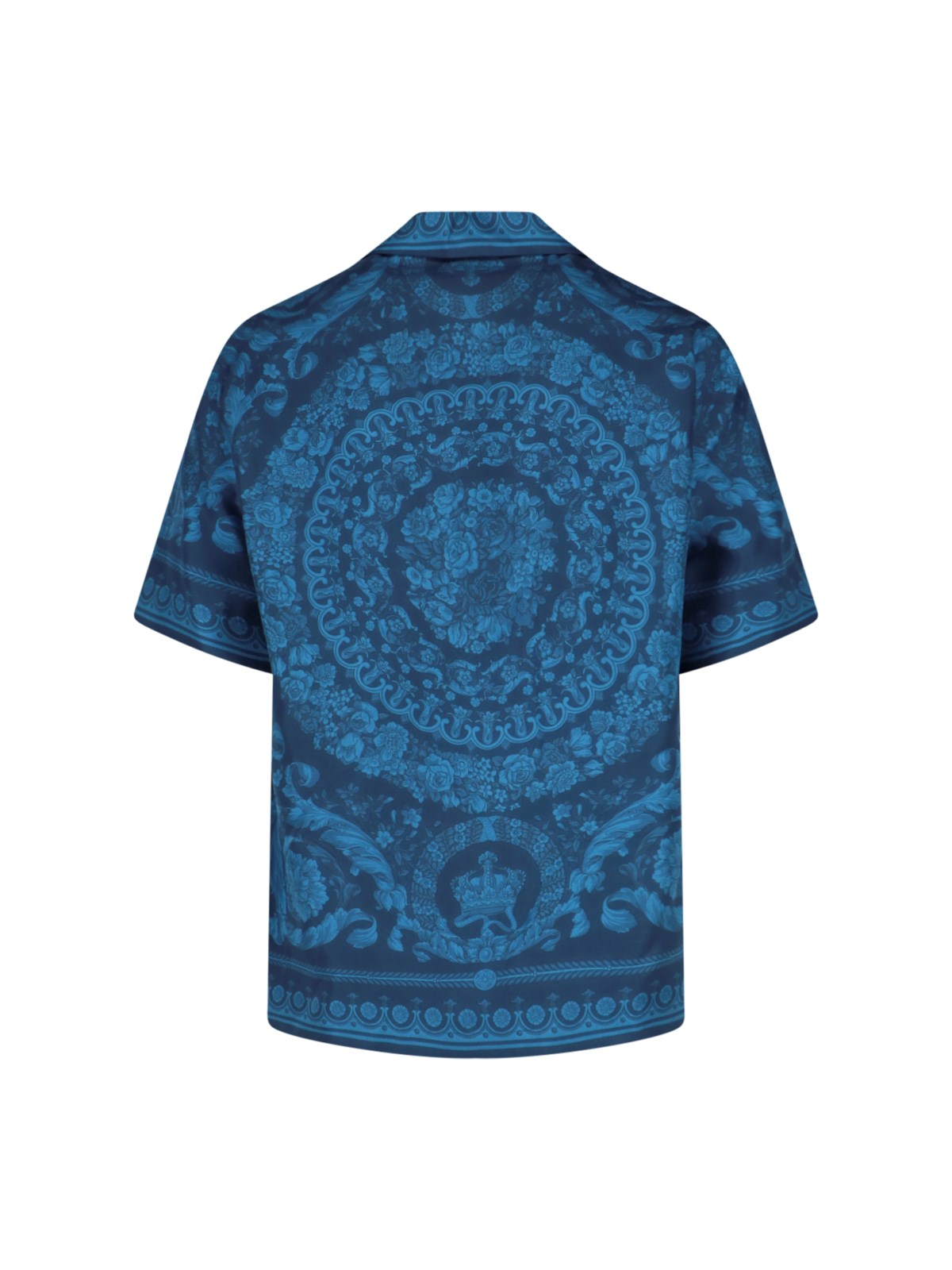 Versace "Barocco" blue silk shirt with Barocco print pattern, collar, button closure, short sleeves, straight hem.