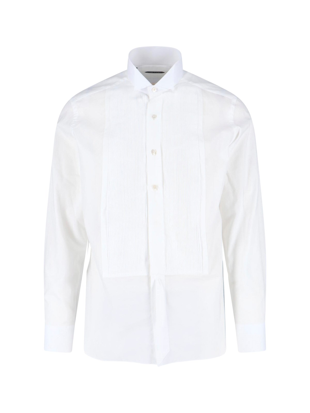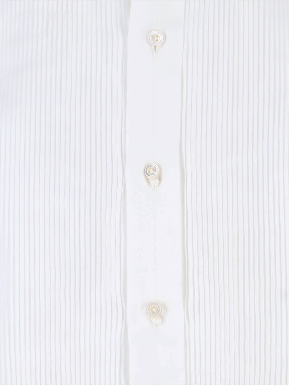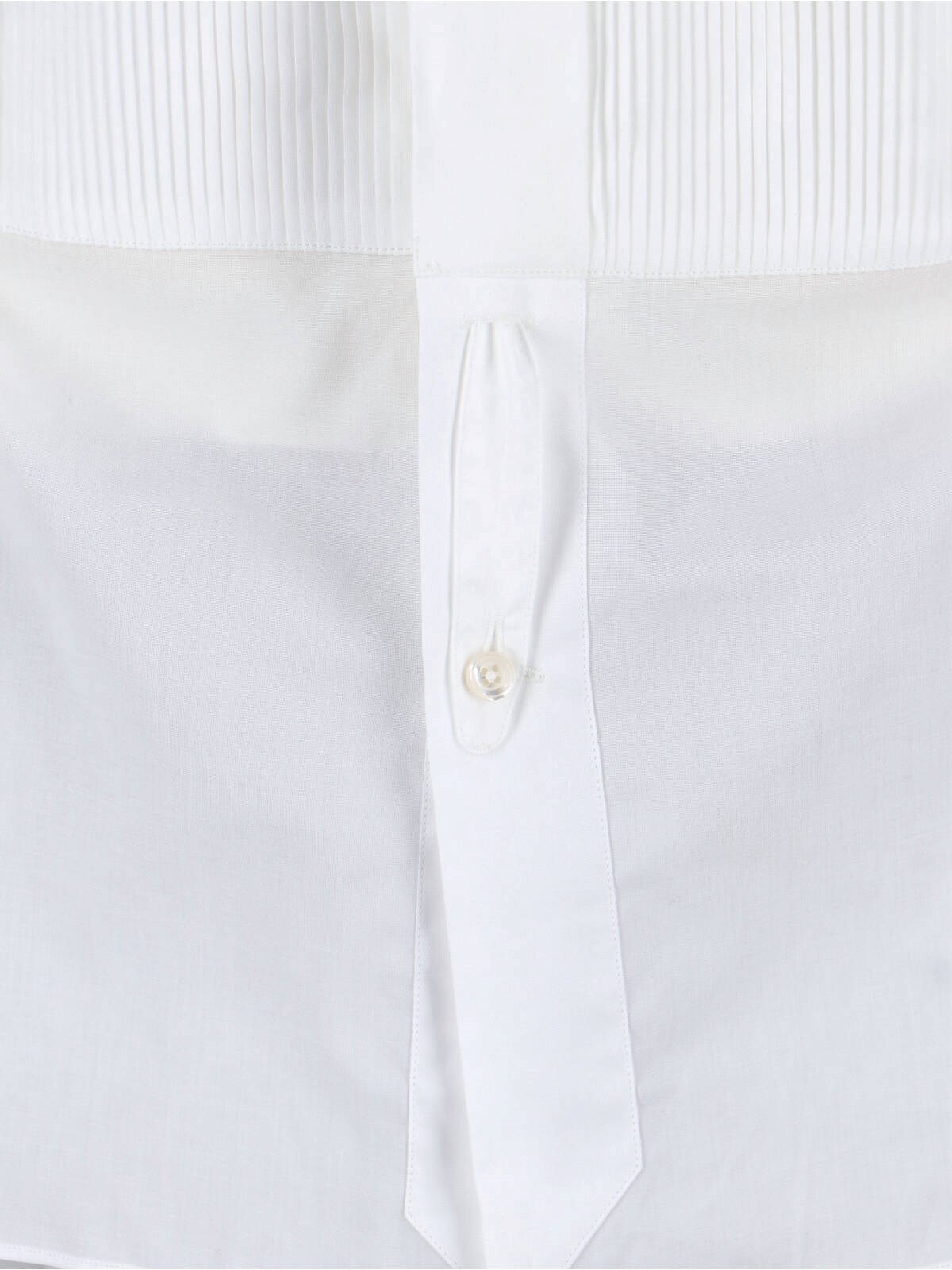 Tom Ford white cotton tuxedo shirt with classic collar, front button closure, long sleeves, pleated detail on the front, button cuffs, curved hem.