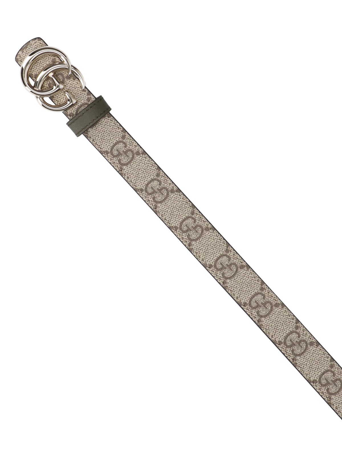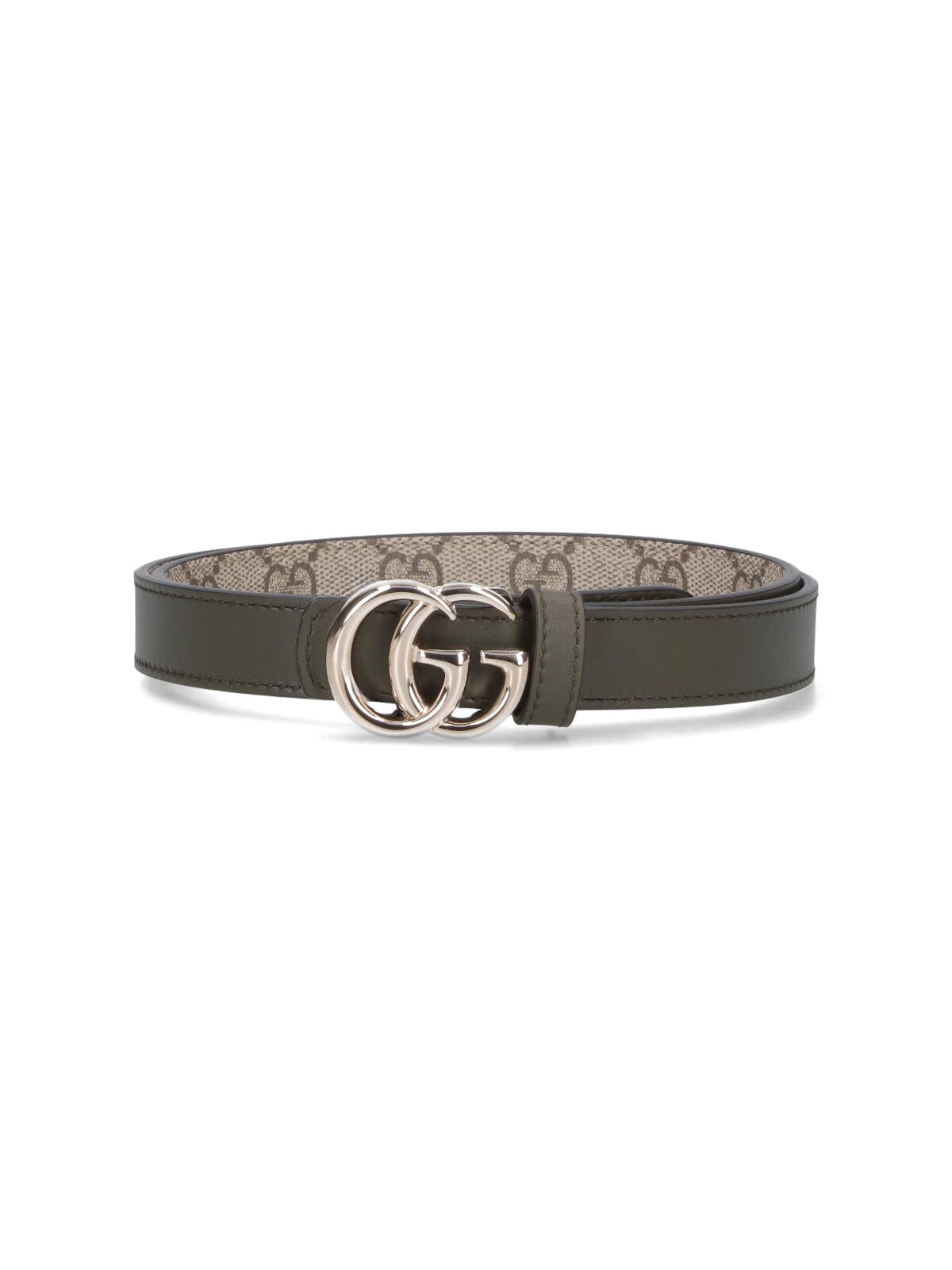Reversible belt "gg marmont" in beige fabric pattern "gg supreme" on one side, and green on the other, logo buckle "gg marmont" in metal front, adjustable.