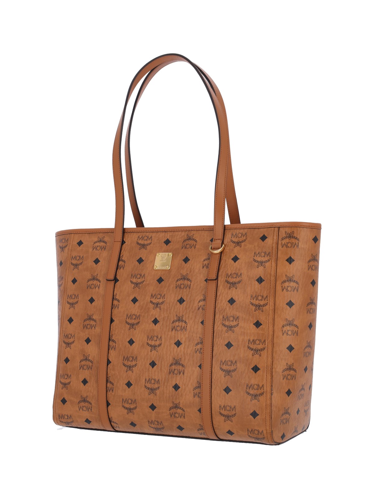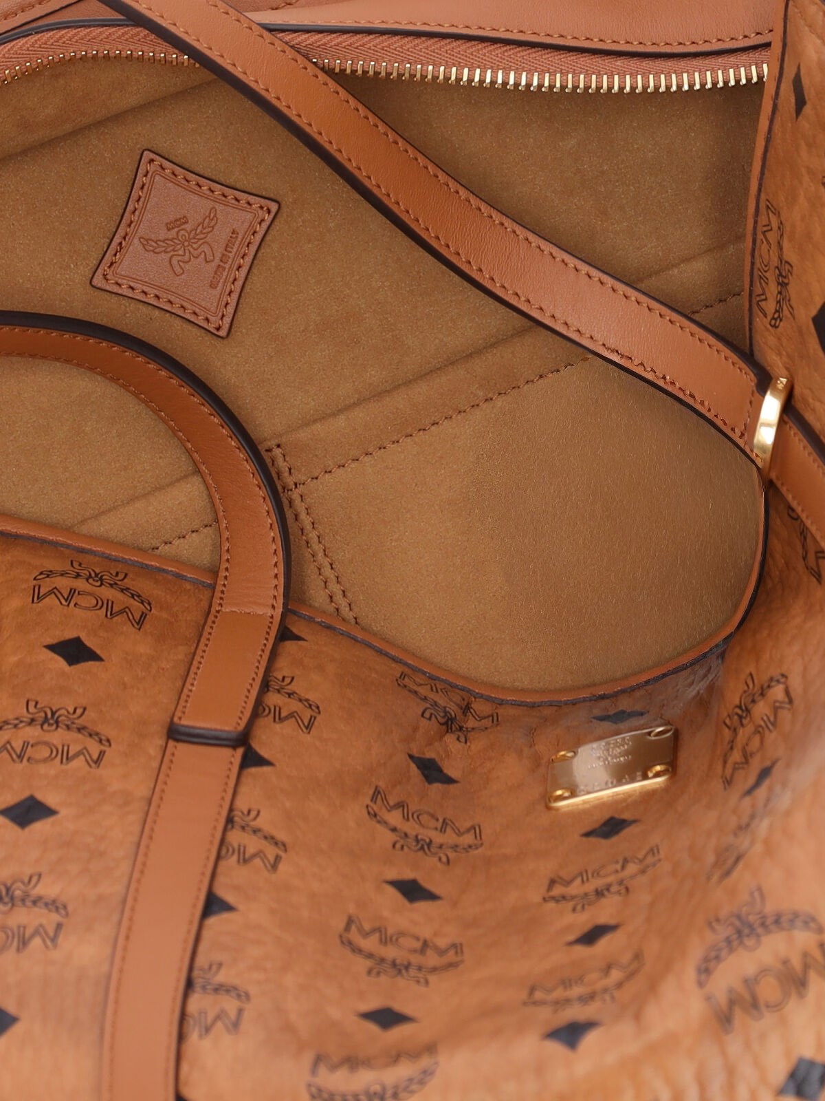 Large tote bag 'LIZ' MCM, in brown 'visetos' with logo print pattern, two handles, zip closure, metal logo plate on the front, a single inner compartment, two inner pockets.