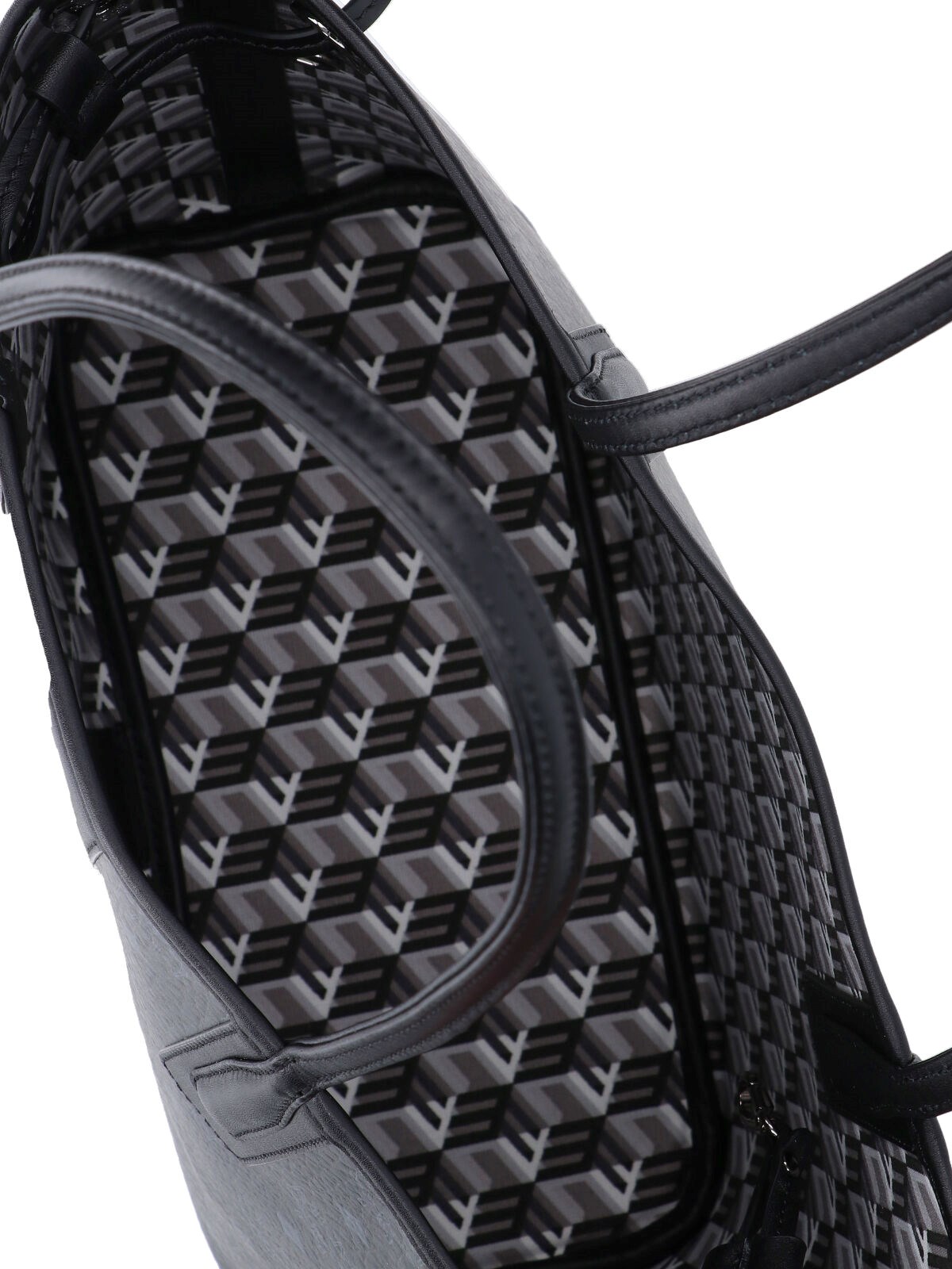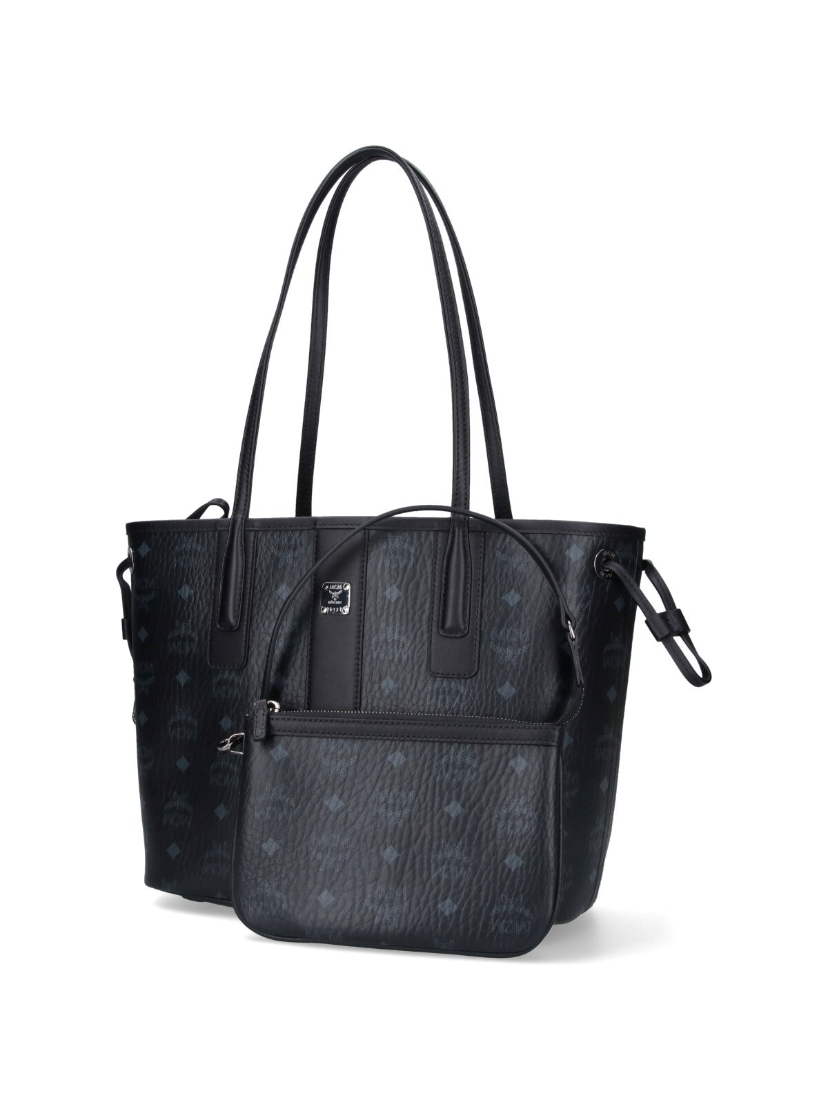 MCM Liz shopper bag in black fabric with top handles, all-over 'MCM' print pattern, silver metal logo detail on the front, interior zip pocket, main inner compartment, and leather trim.
