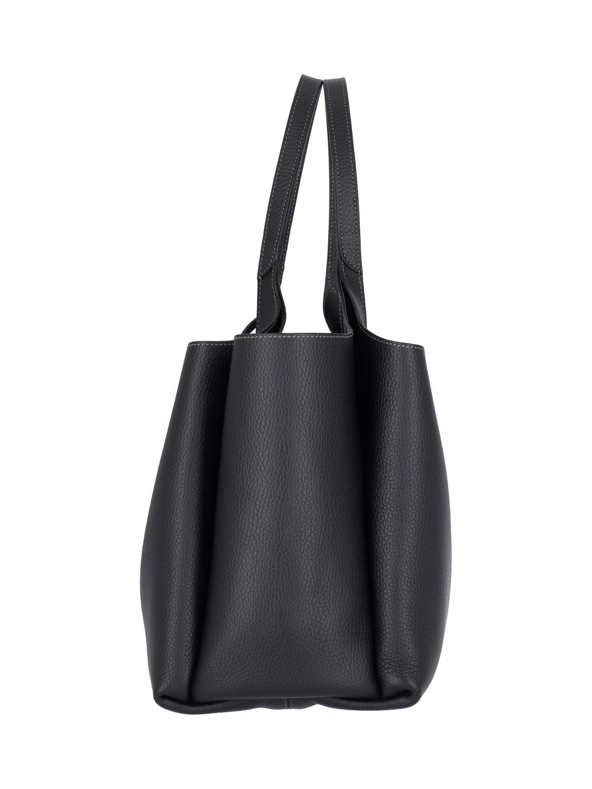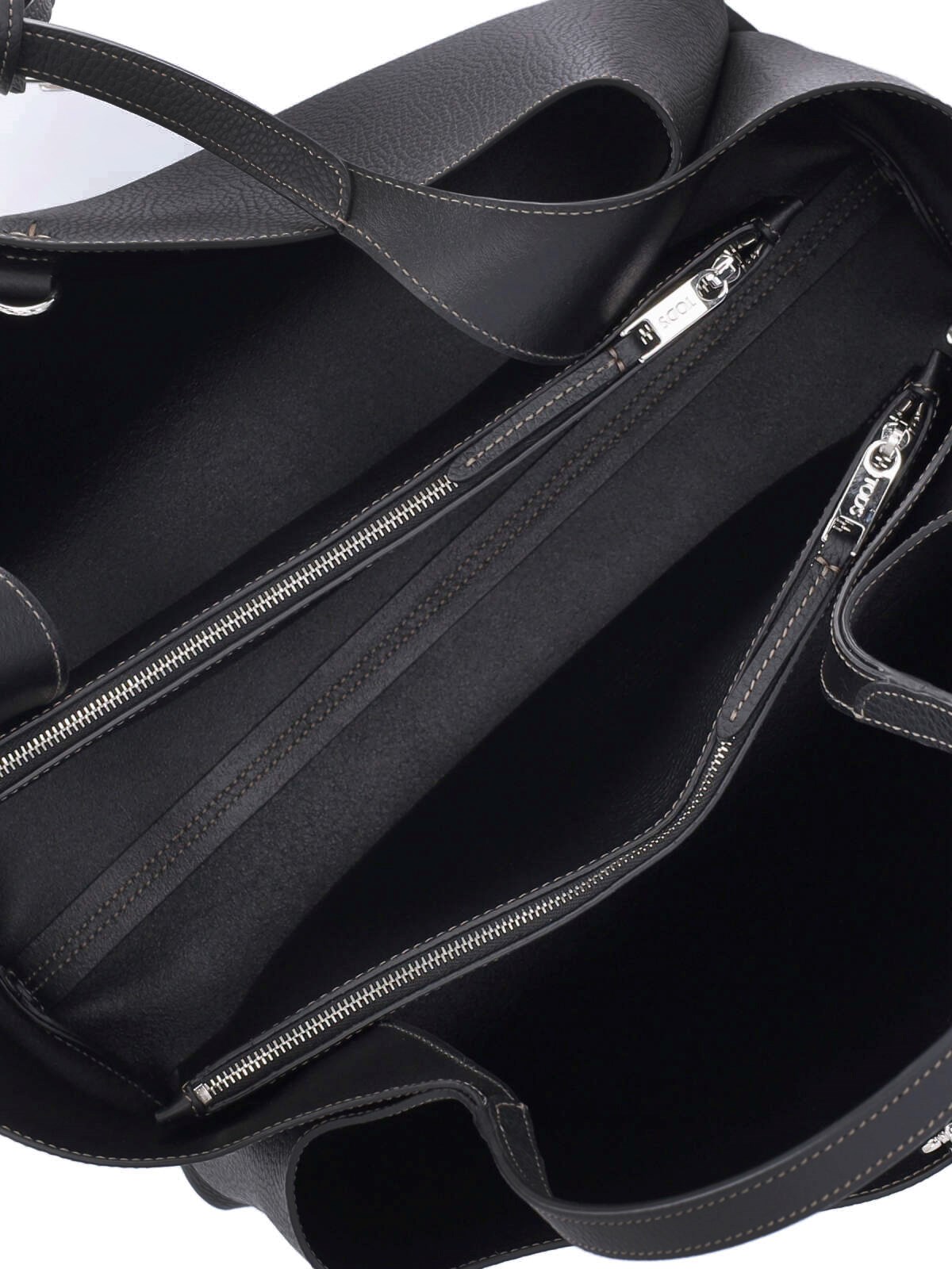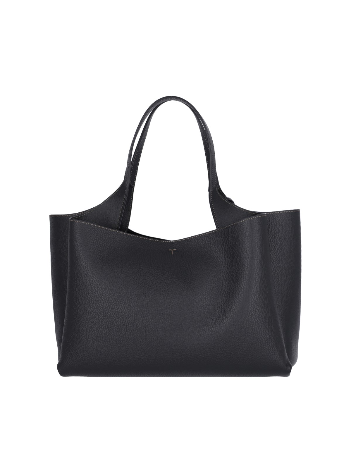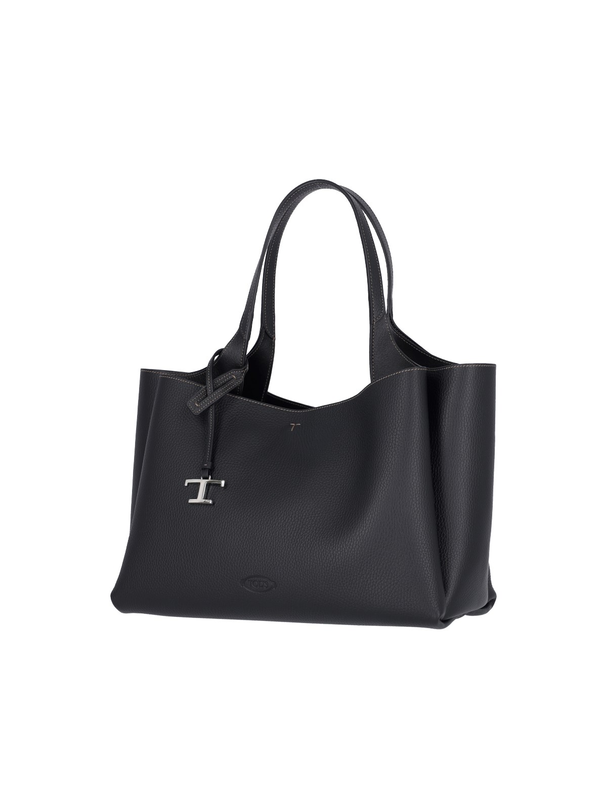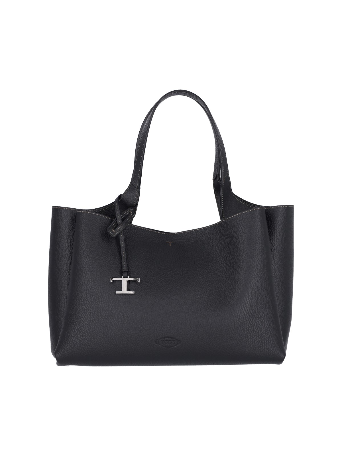Tod¡¯s medium shoulder bag in black hammered leather with two rigid top handles, removable silver metal T Timeless logo charm on the front, embossed logo on the front, T-stitching on the front and back, hook closure, two separate inner compartments, two inner zip pockets, metal feet on the bottom.