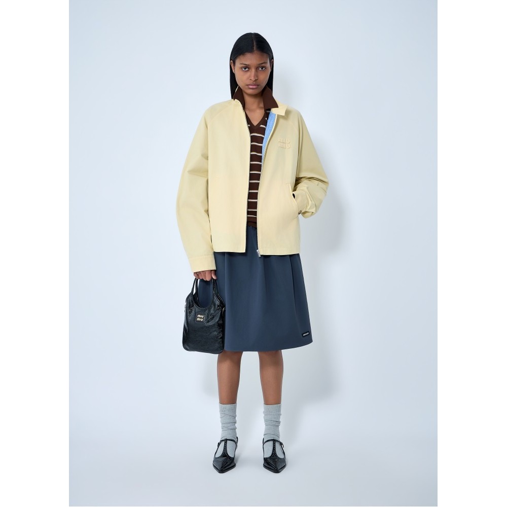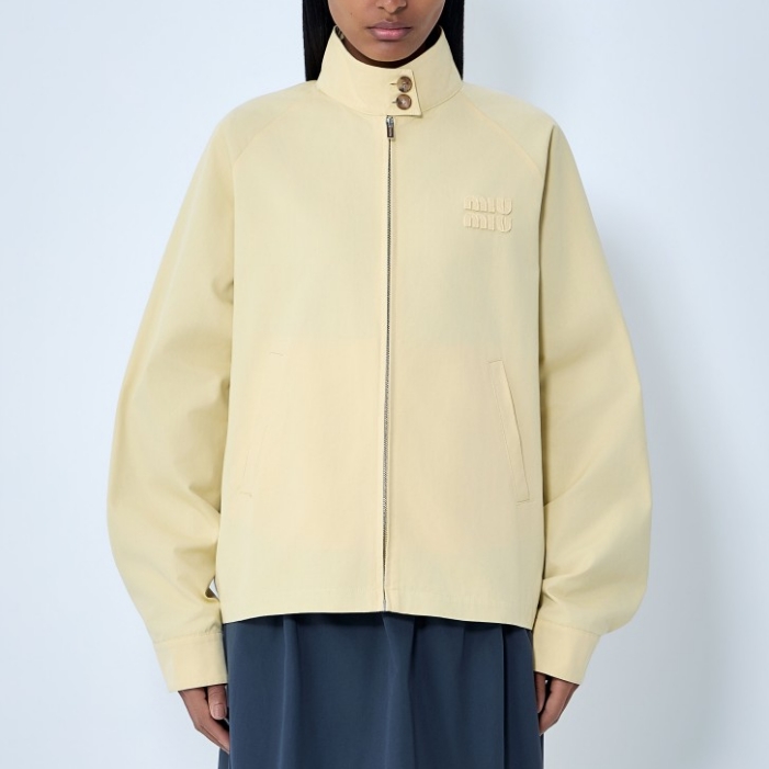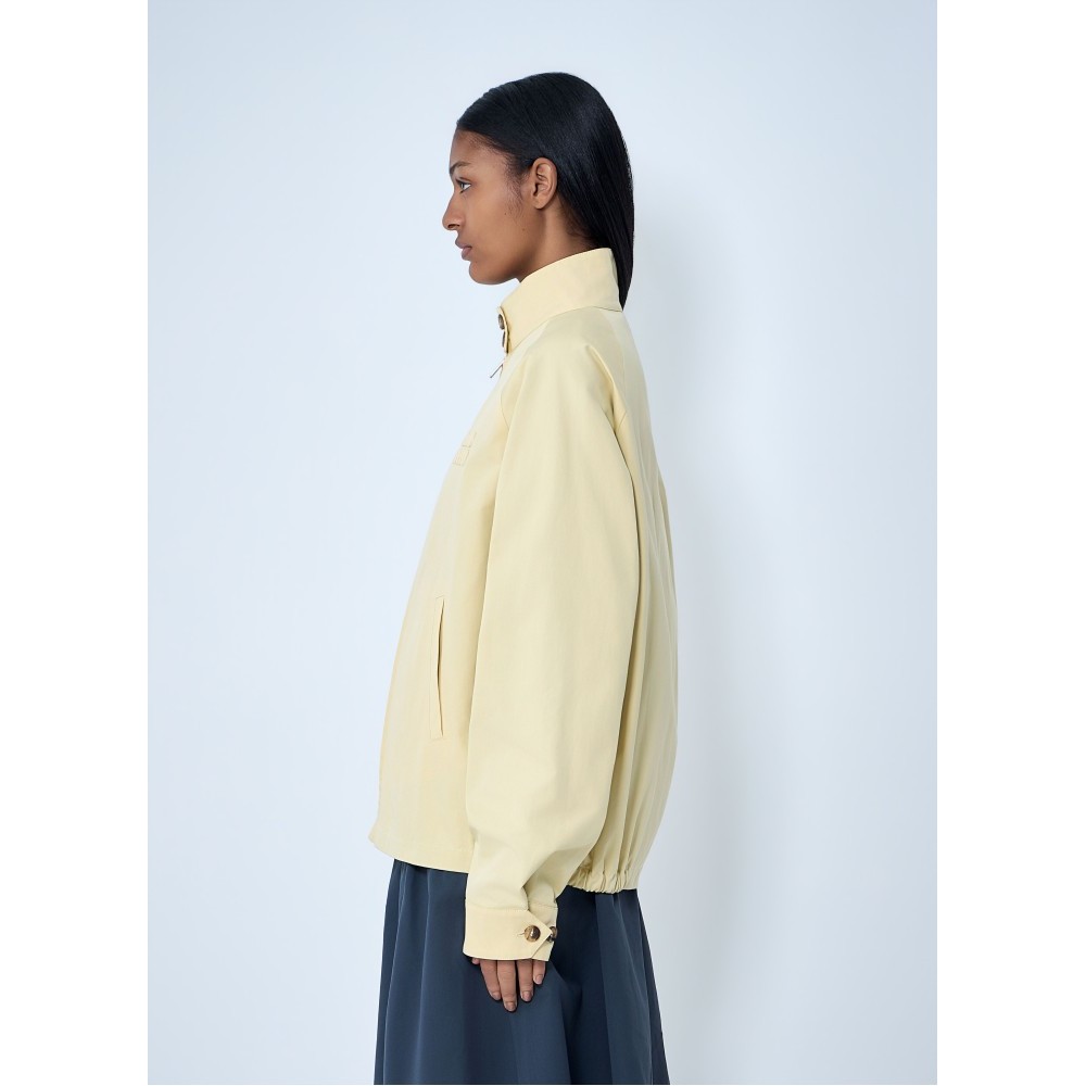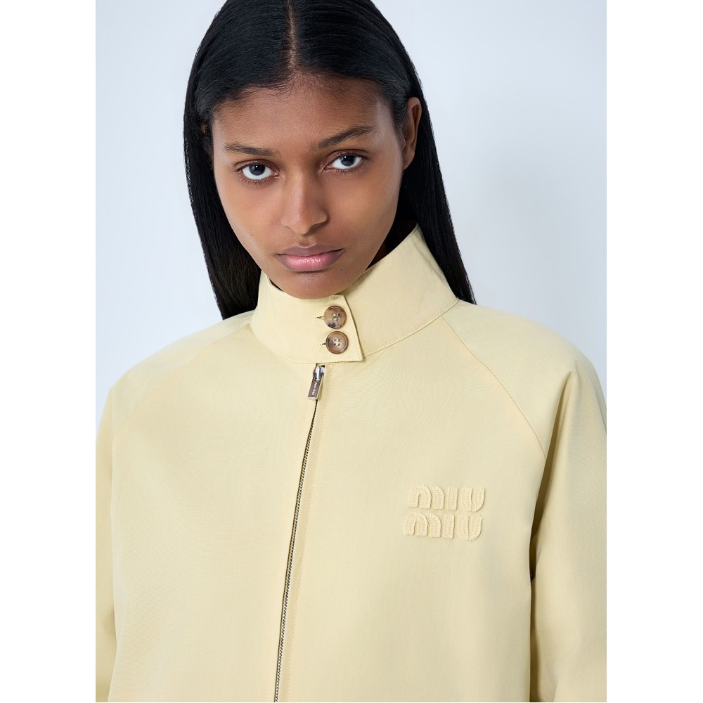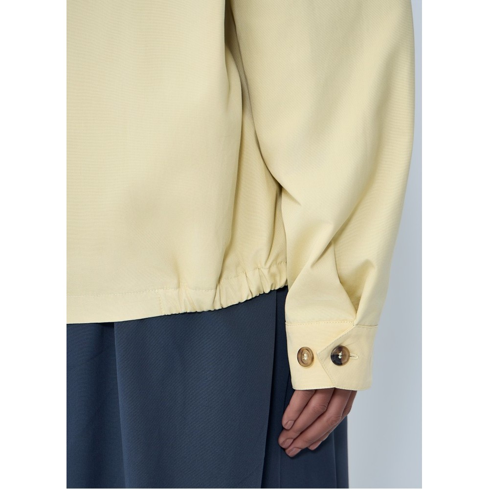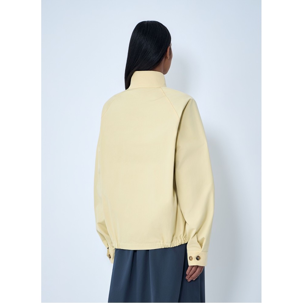 High-neck jacket with front zip and button placket.
