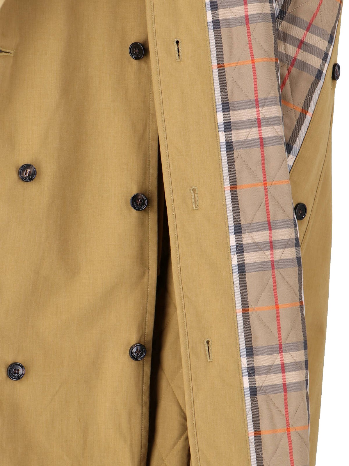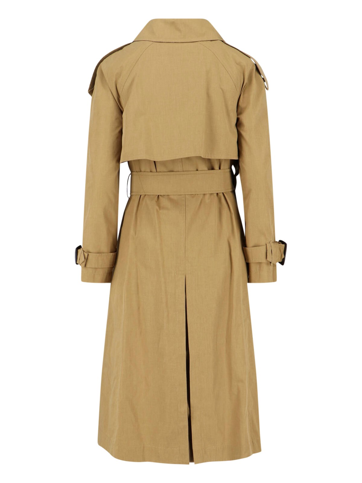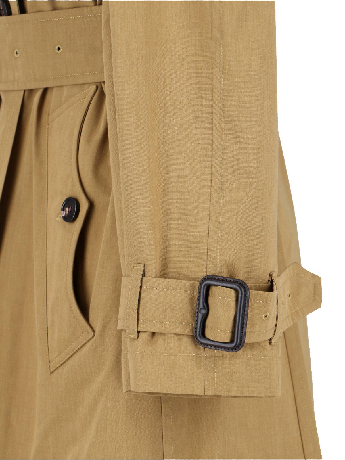 Burberry "Fitzrovia" brown cotton blend trench coat with collar, double-breasted button closure, hook closure, shoulder straps, side button welt pockets, shoulder windbreak, back vent, front buckle belt, straight hem.