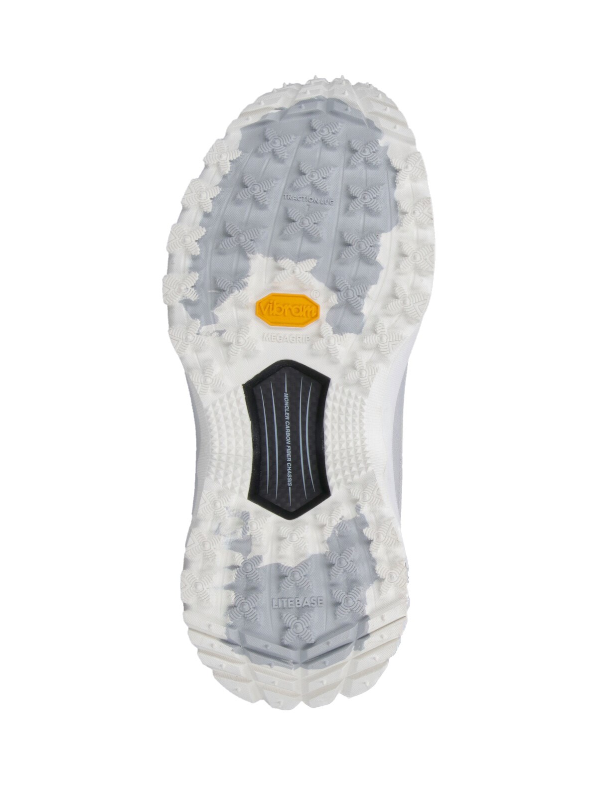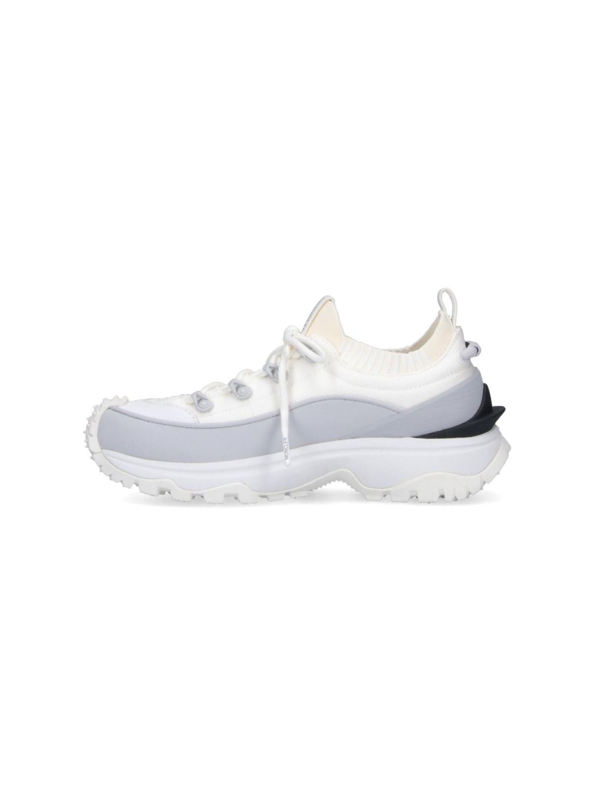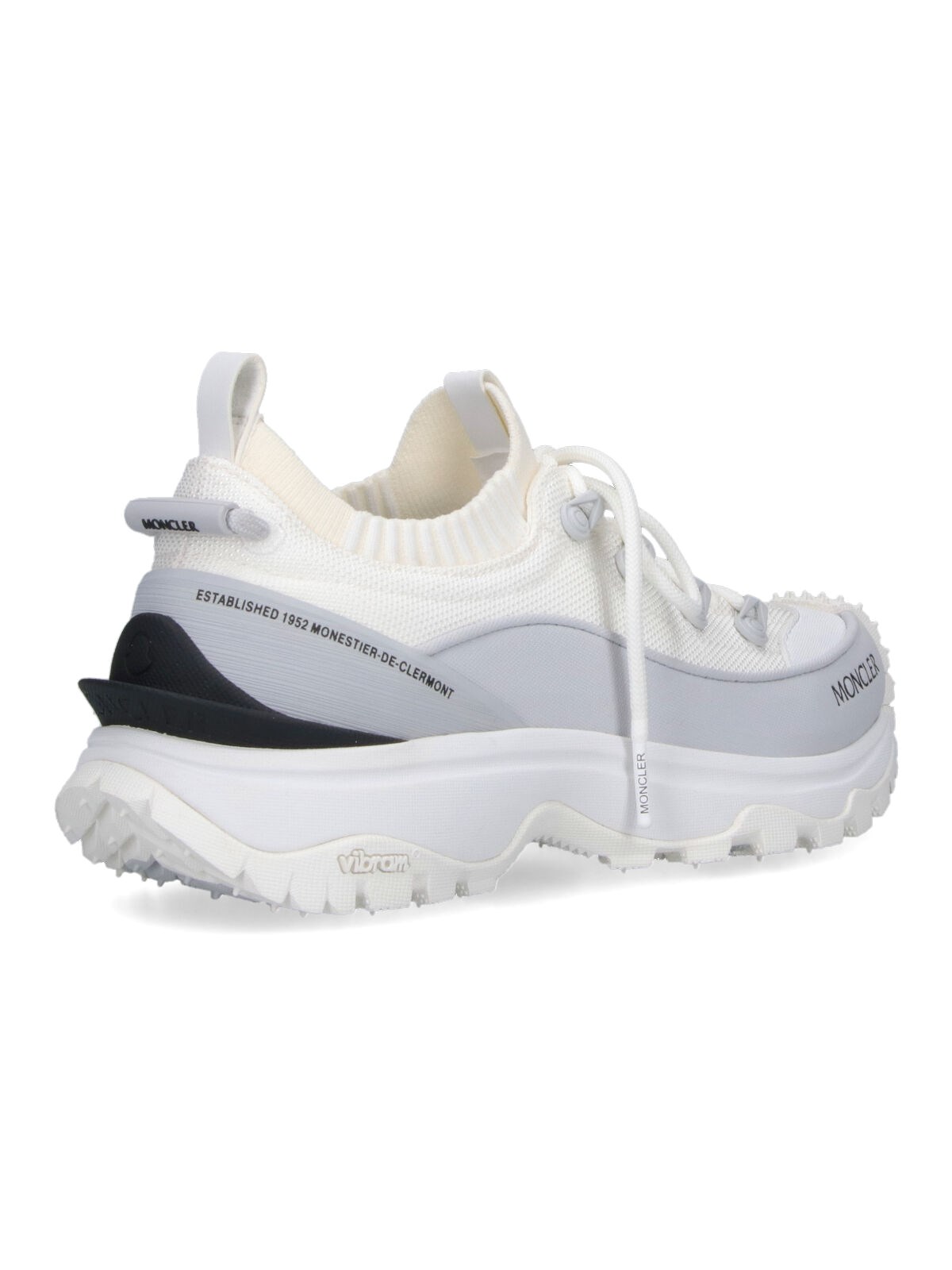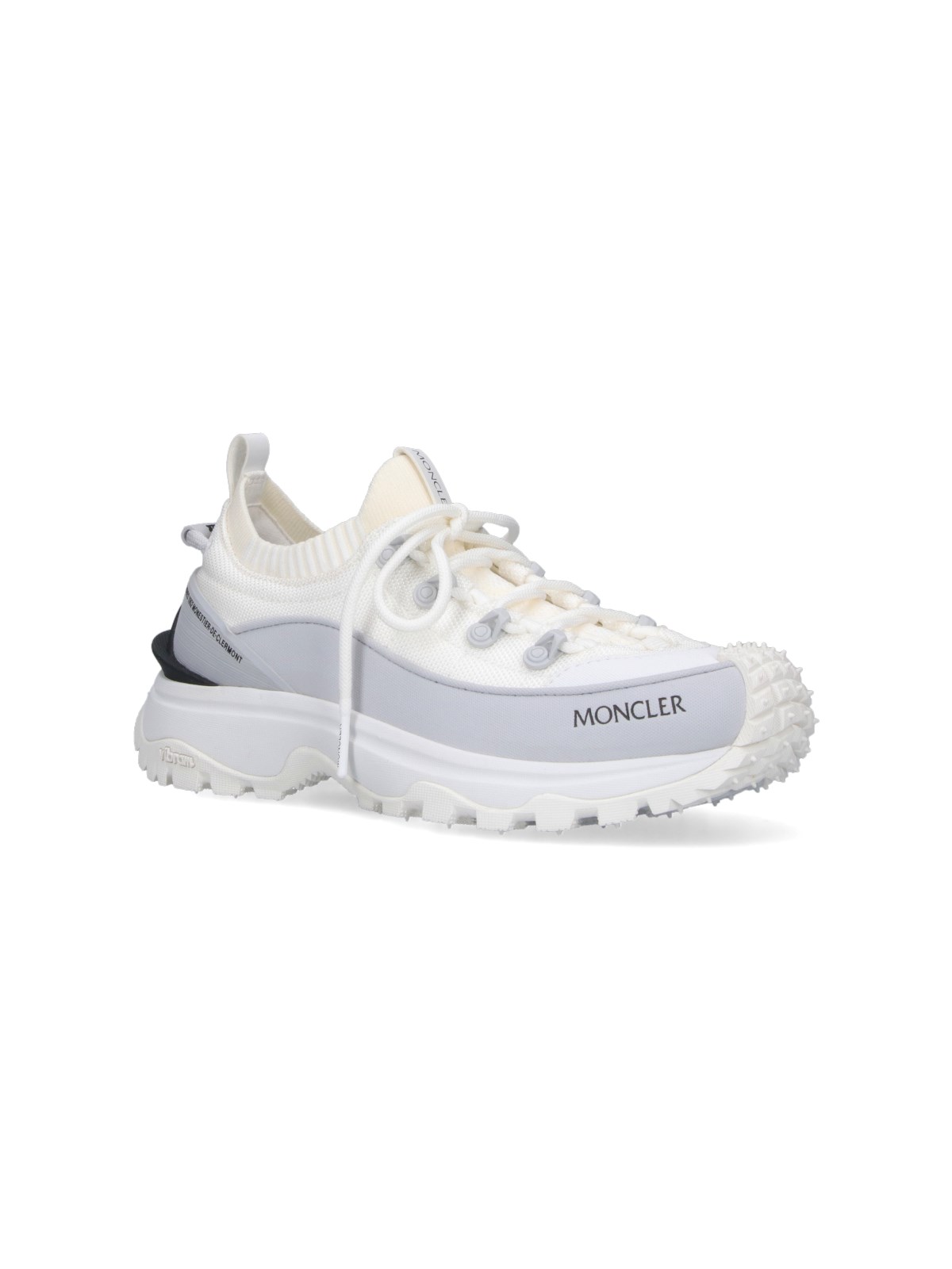 Moncler Trailgrip Lite3 white mesh sneakers with round toe, laces, adjustable drawstring, contrasting side logo, contrast trim, and Vibram¢ç textured rubber sole.