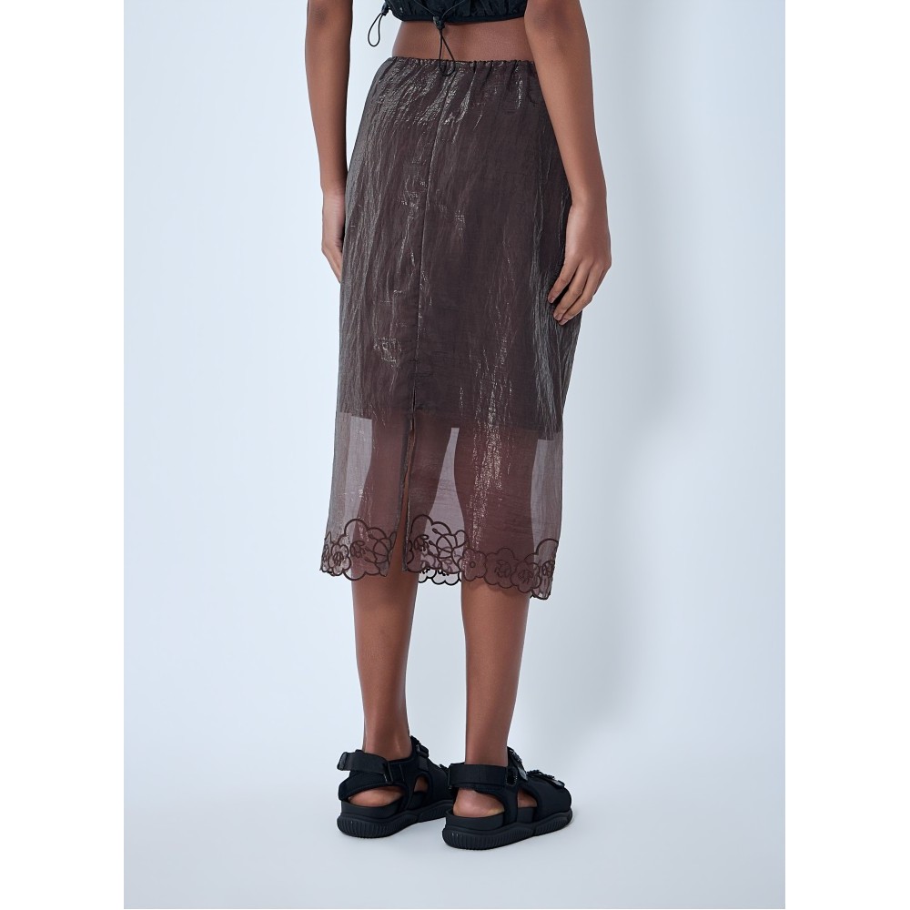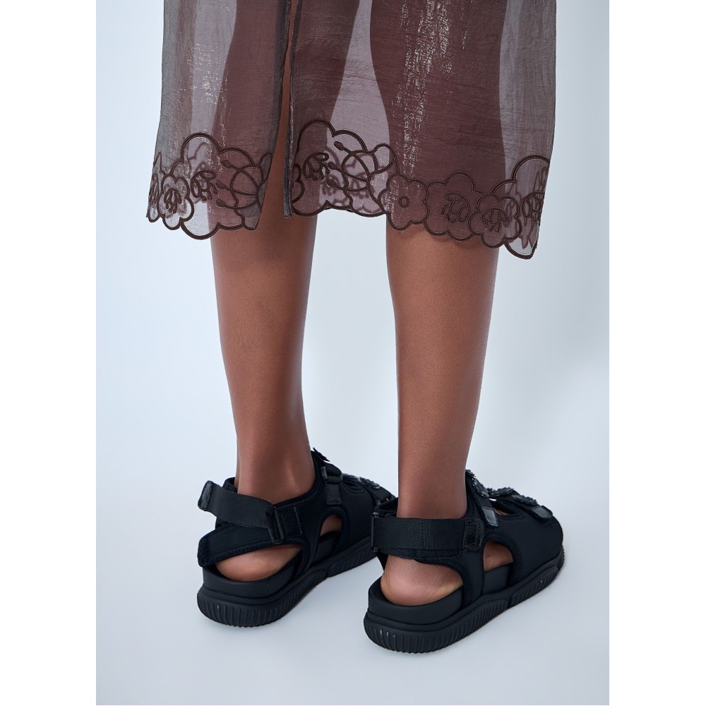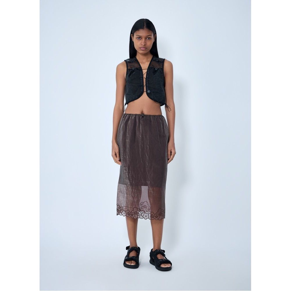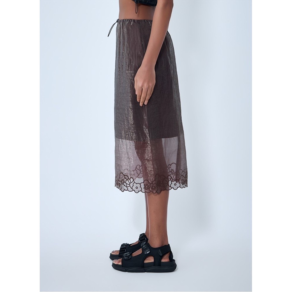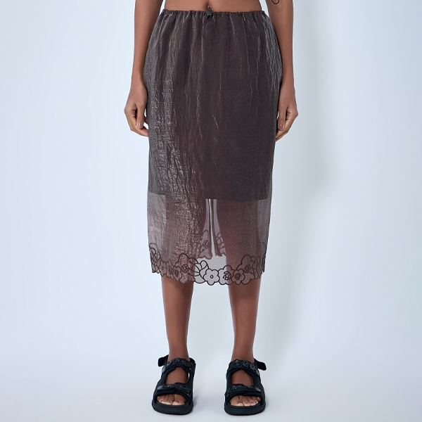Sheer overlay skirt with floral embroidery at hem.