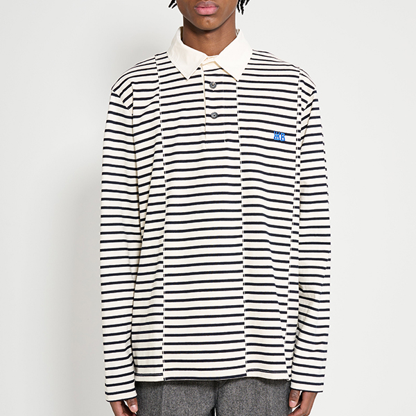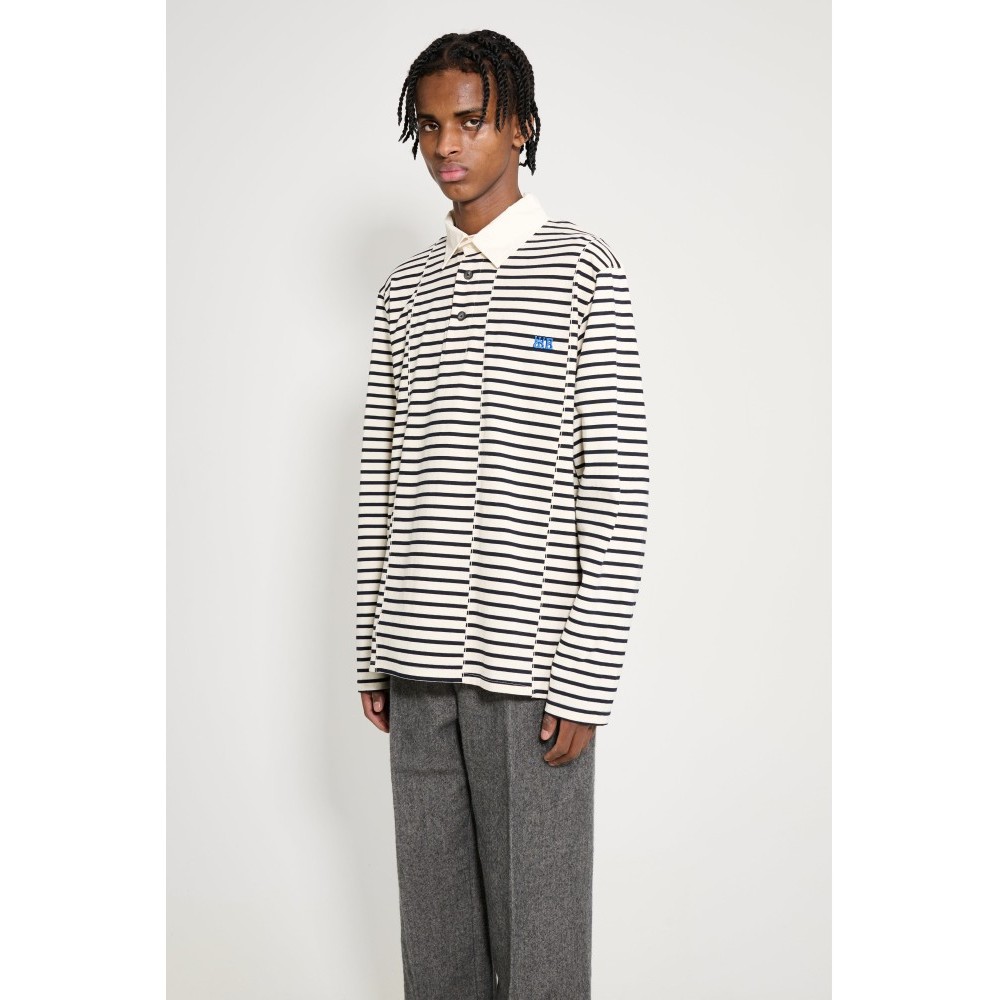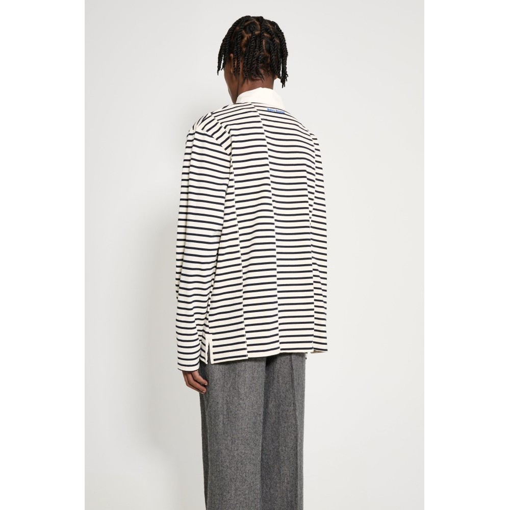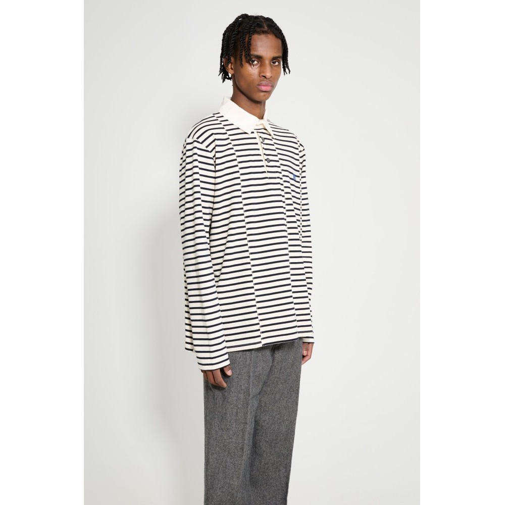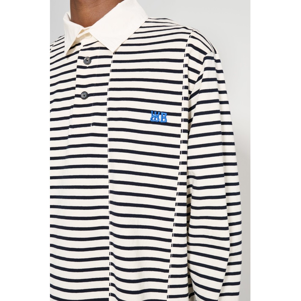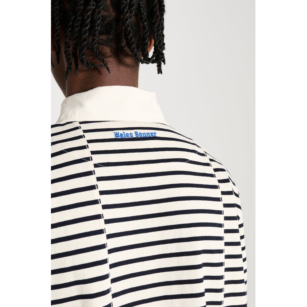 Polo shirt from Wales Bonner. Knitted from organic cotton in an ivory white and navy blue stripe with a contrast shoulder panel. The regular fit body falls below the hip. A classic polo collar tops the buttoned placket. Elasticated cuffs draw in the long sleeves and frame the monogram embroidery on the chest.