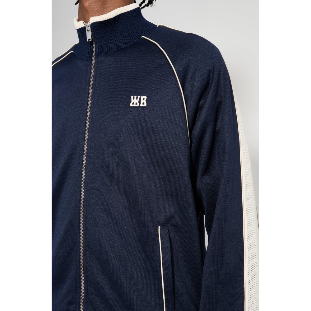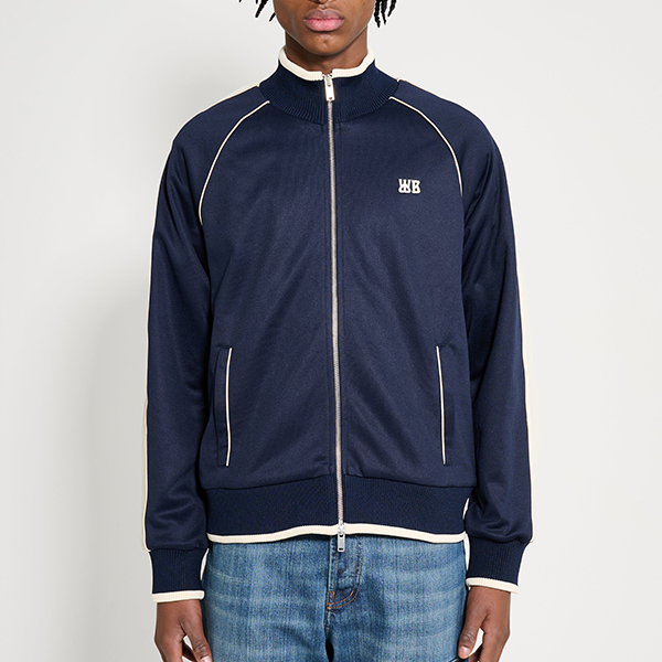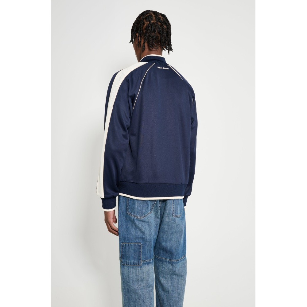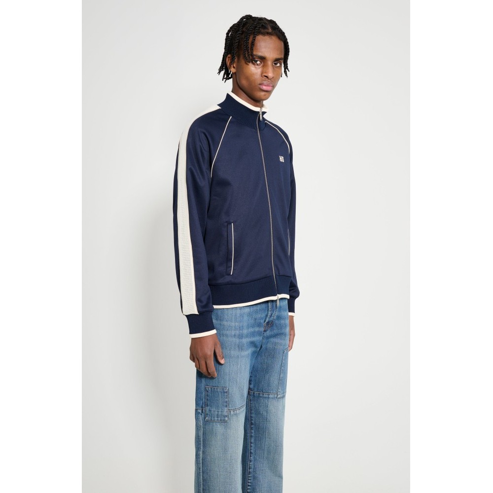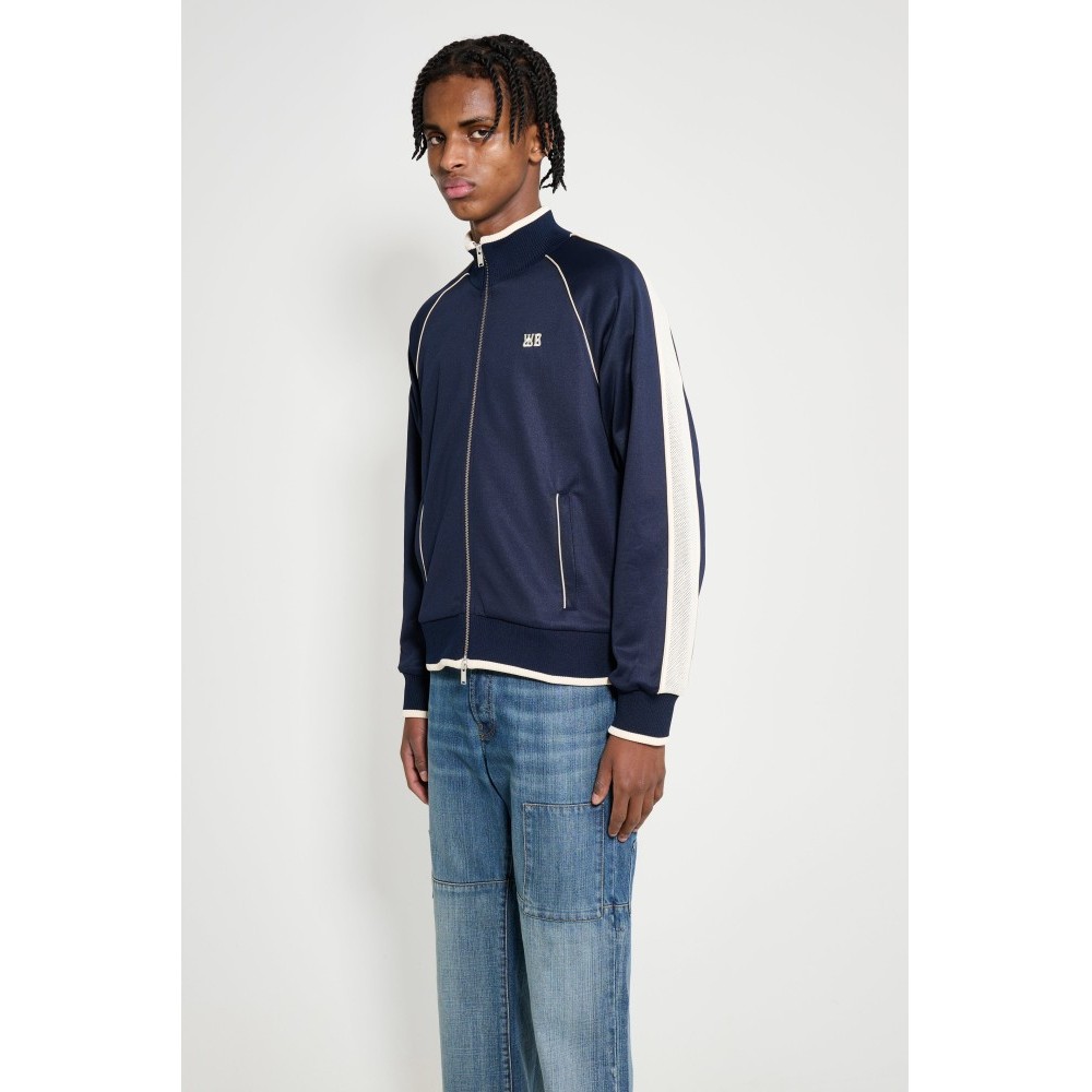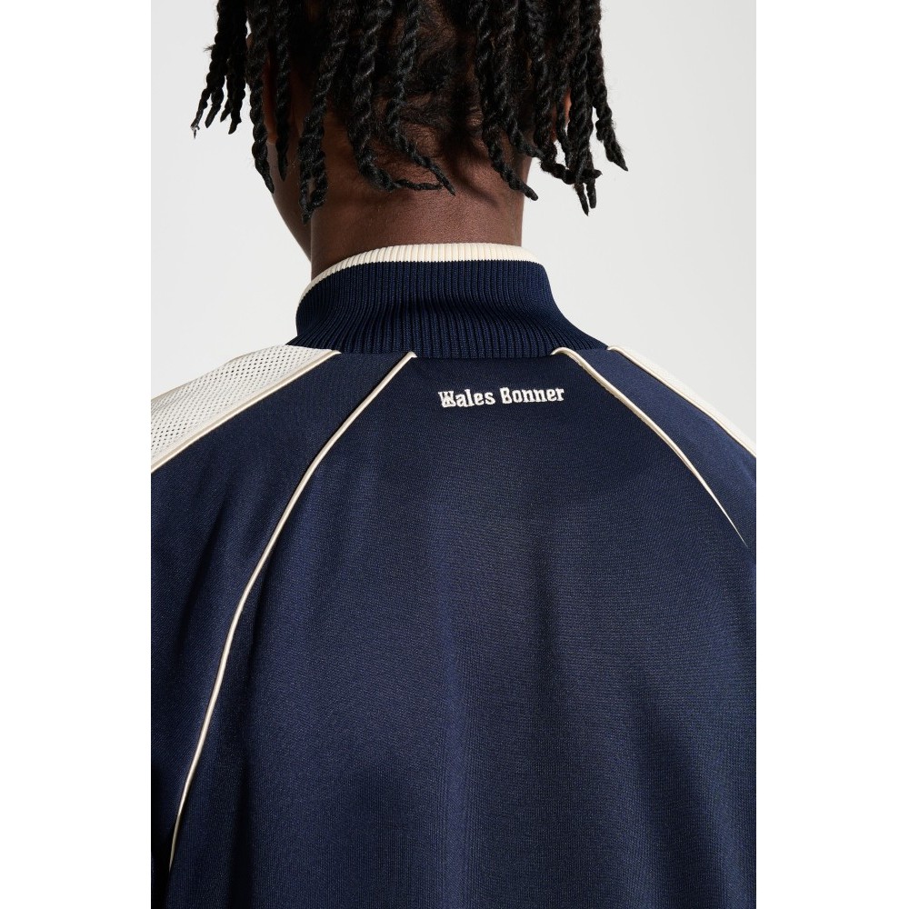 Track top from Wales Bonner. Presented in navy blue and ivory white with contrast panels running along the sleeves and body. A stand collar frames the neckline and anchors the full-length front zip. Ribbed cuffs and hem finish the edges. Side slip pockets are integrated into the lower front.