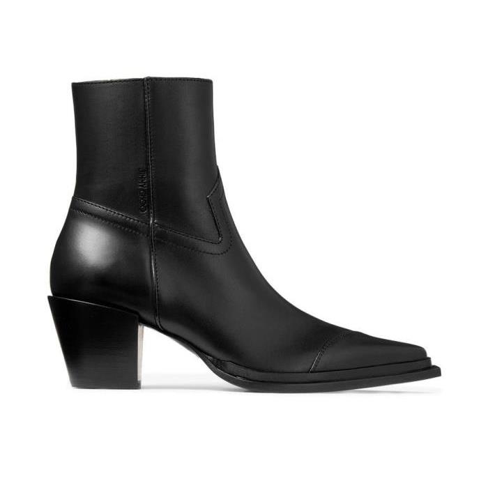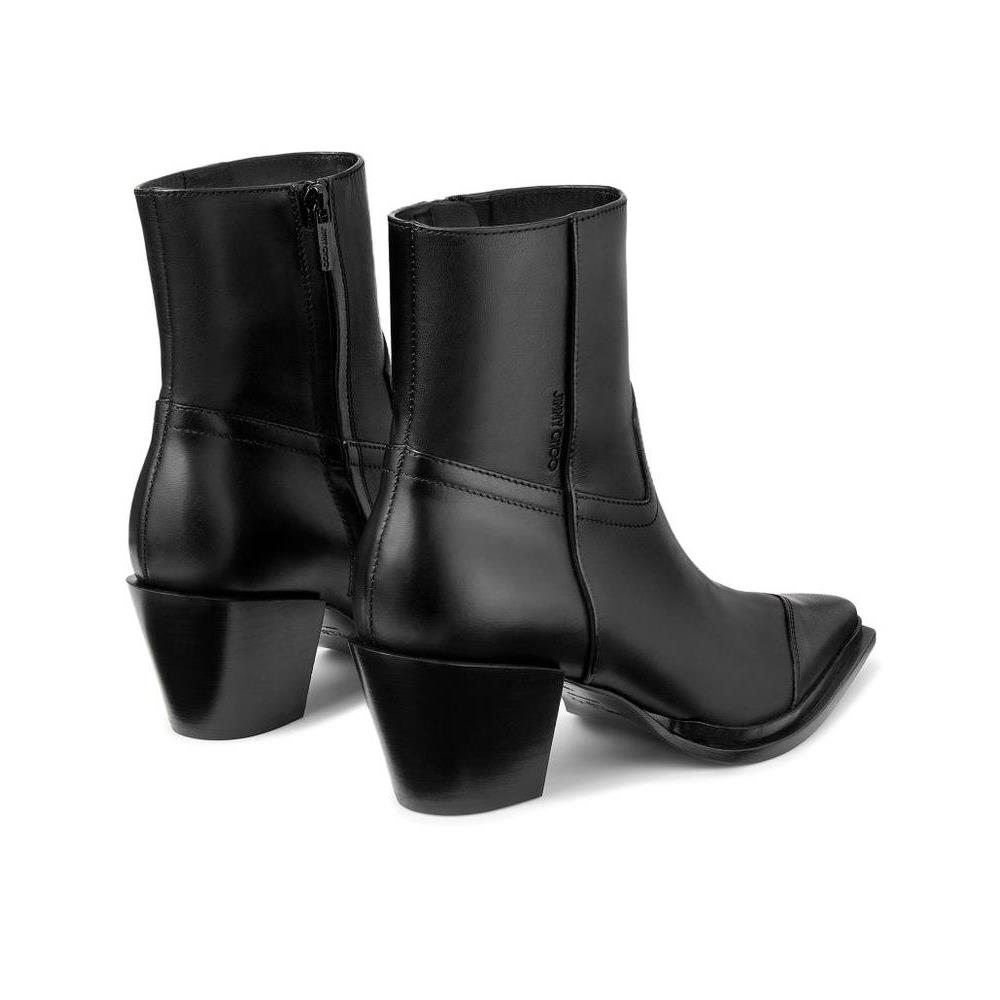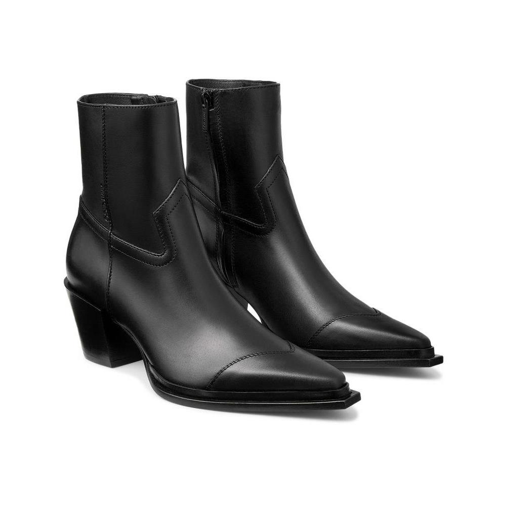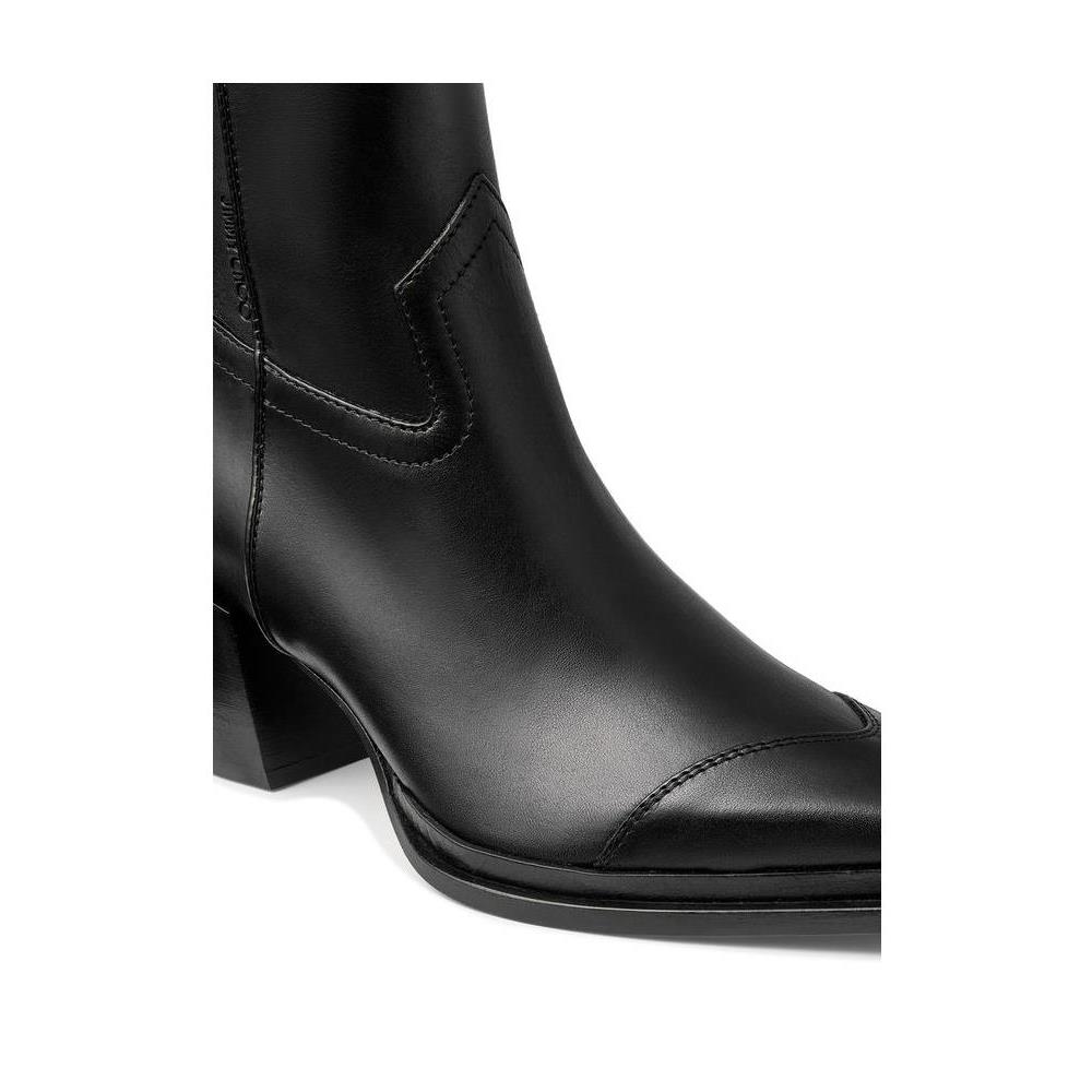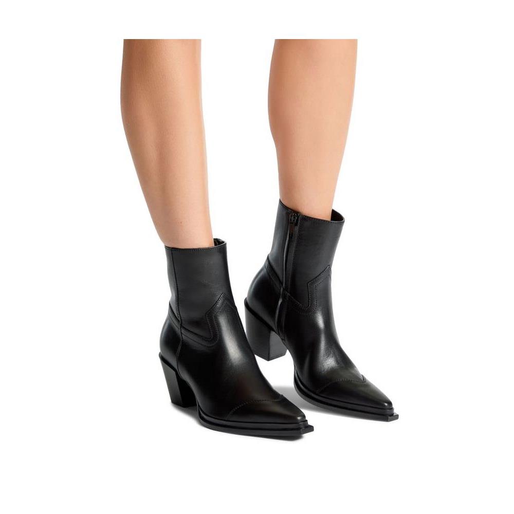 Description : Boots, logo on the side, engraved logo, smooth leather, block heel, medium heel, closed, pointed toe, leather outer sole, chelsea boots.