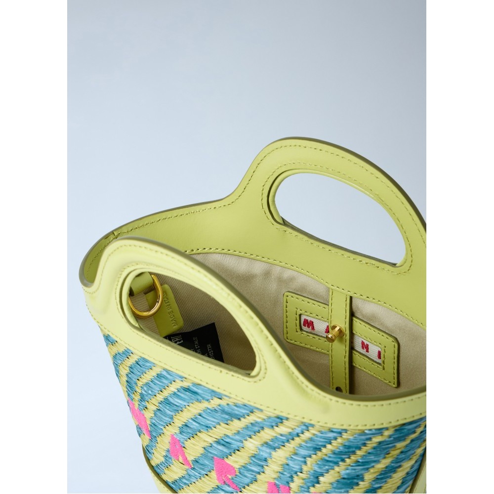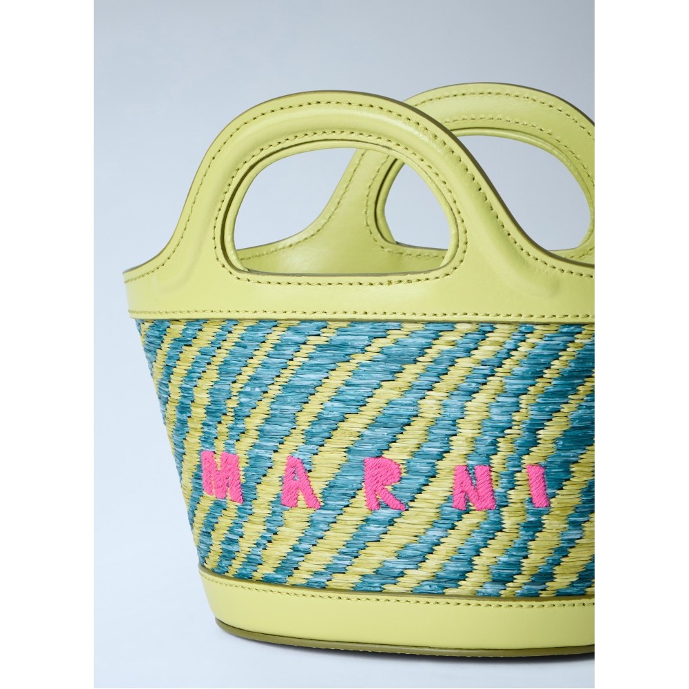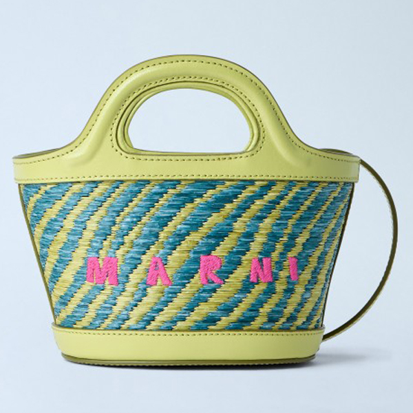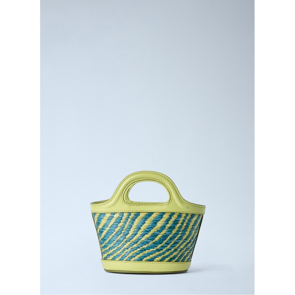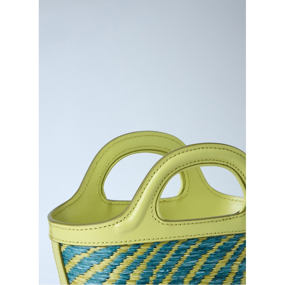 Woven leather bag with structured top handles.