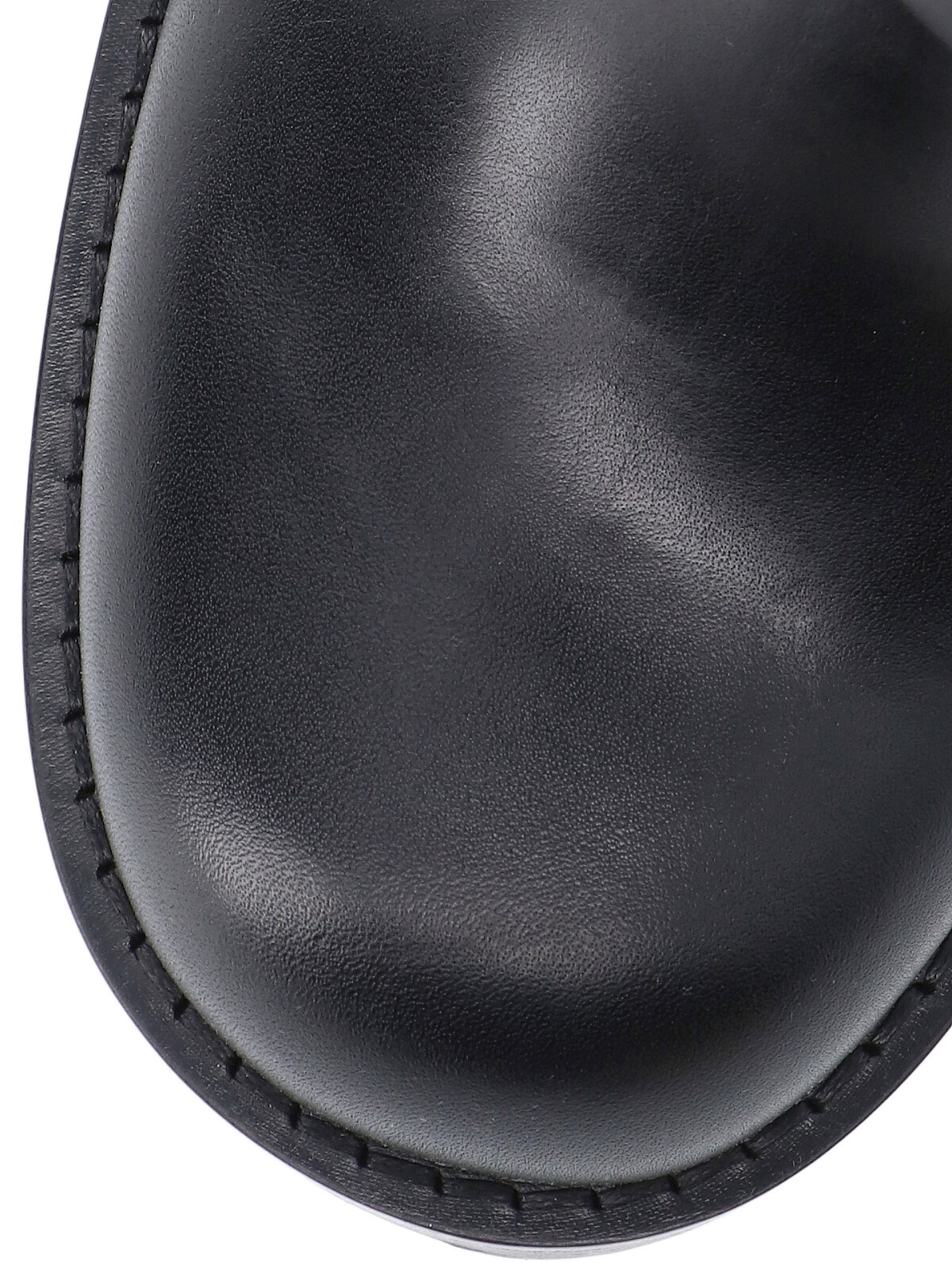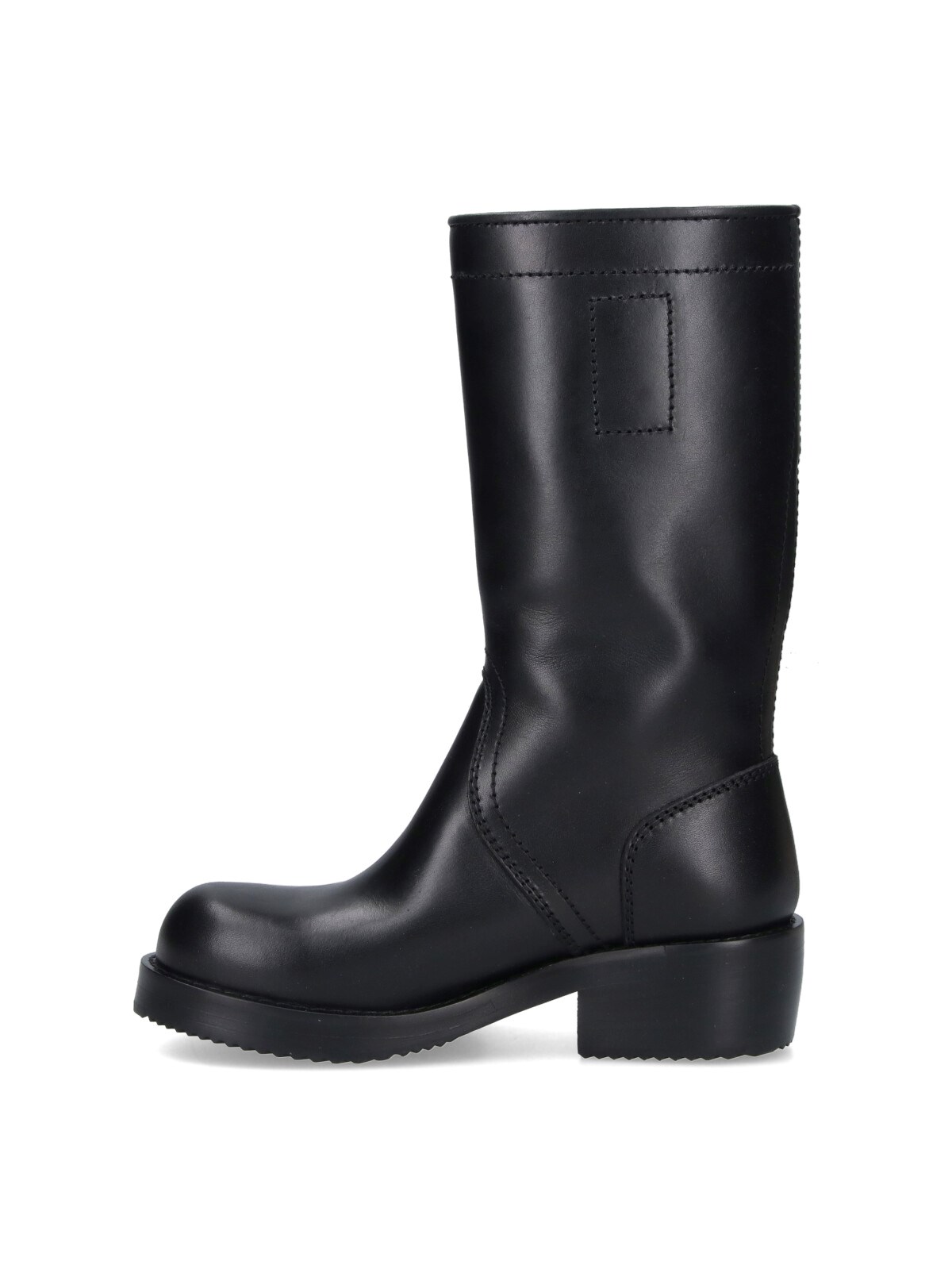 Dries Van Noten black leather boots with round toe, adjustable silver metal buckle strap, exposed stitching detail, slip-on fit, rubber sole.