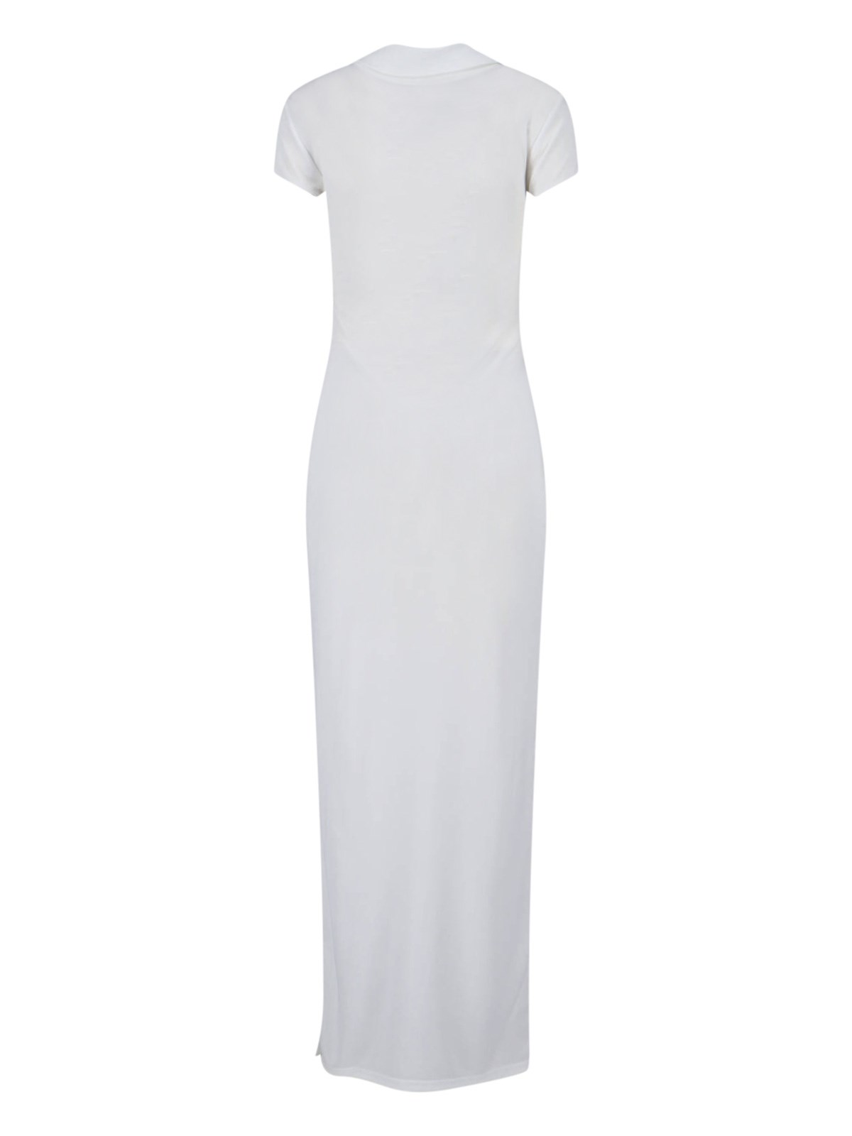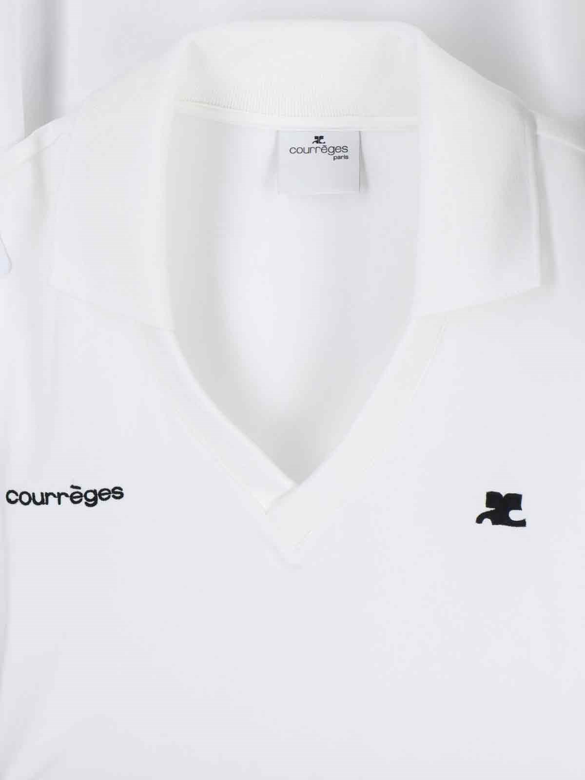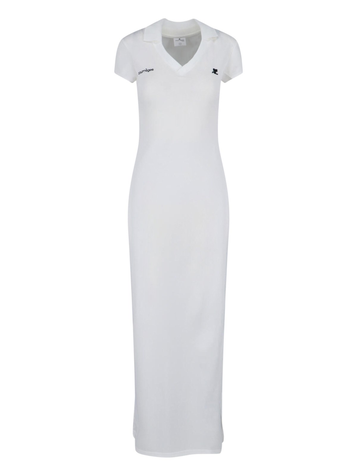 Maxi courreges polo dress in white fabric with V-neck, collar, short sleeves, contrasting logo on the front, straight hem.