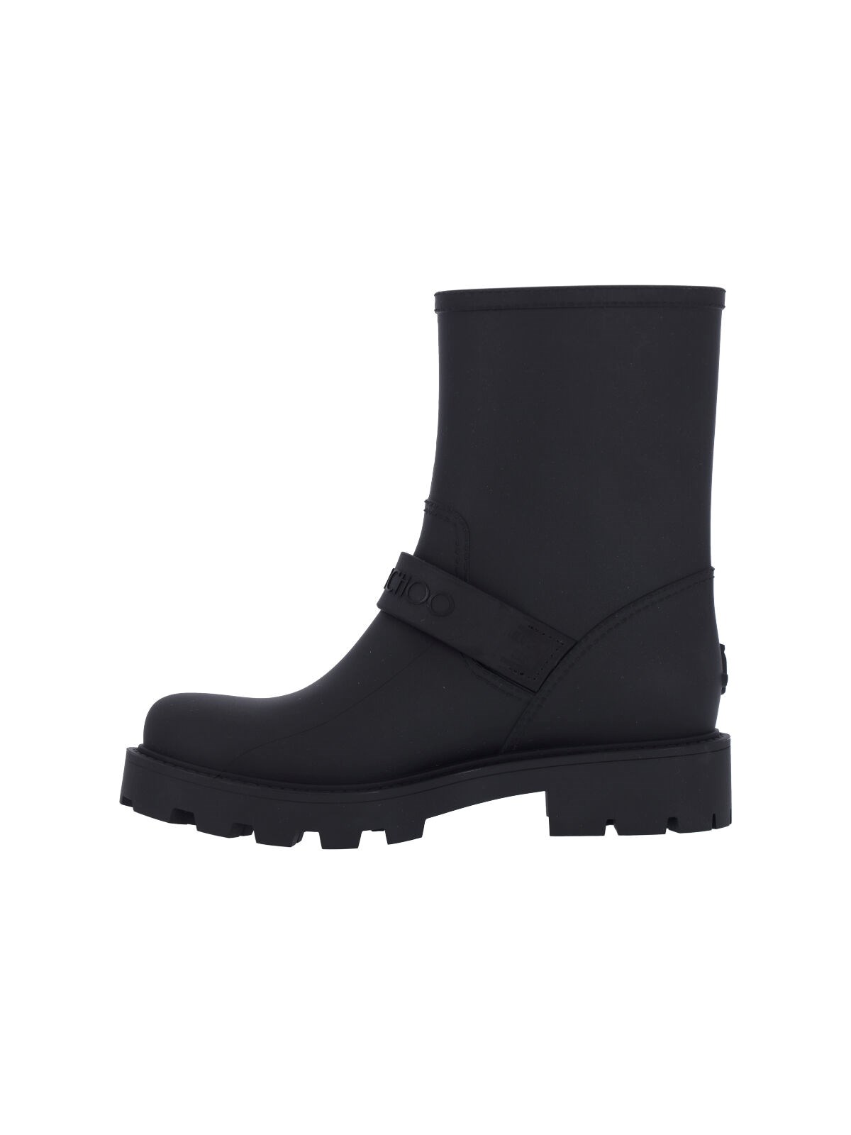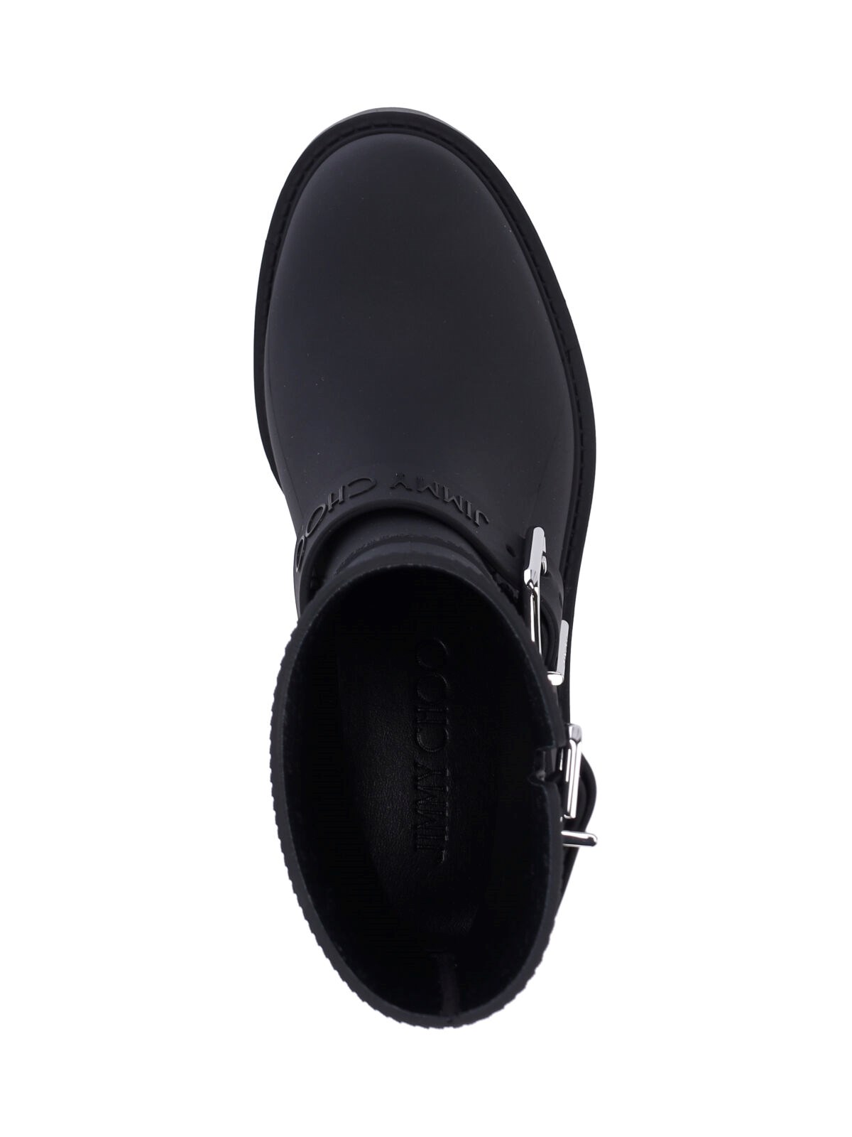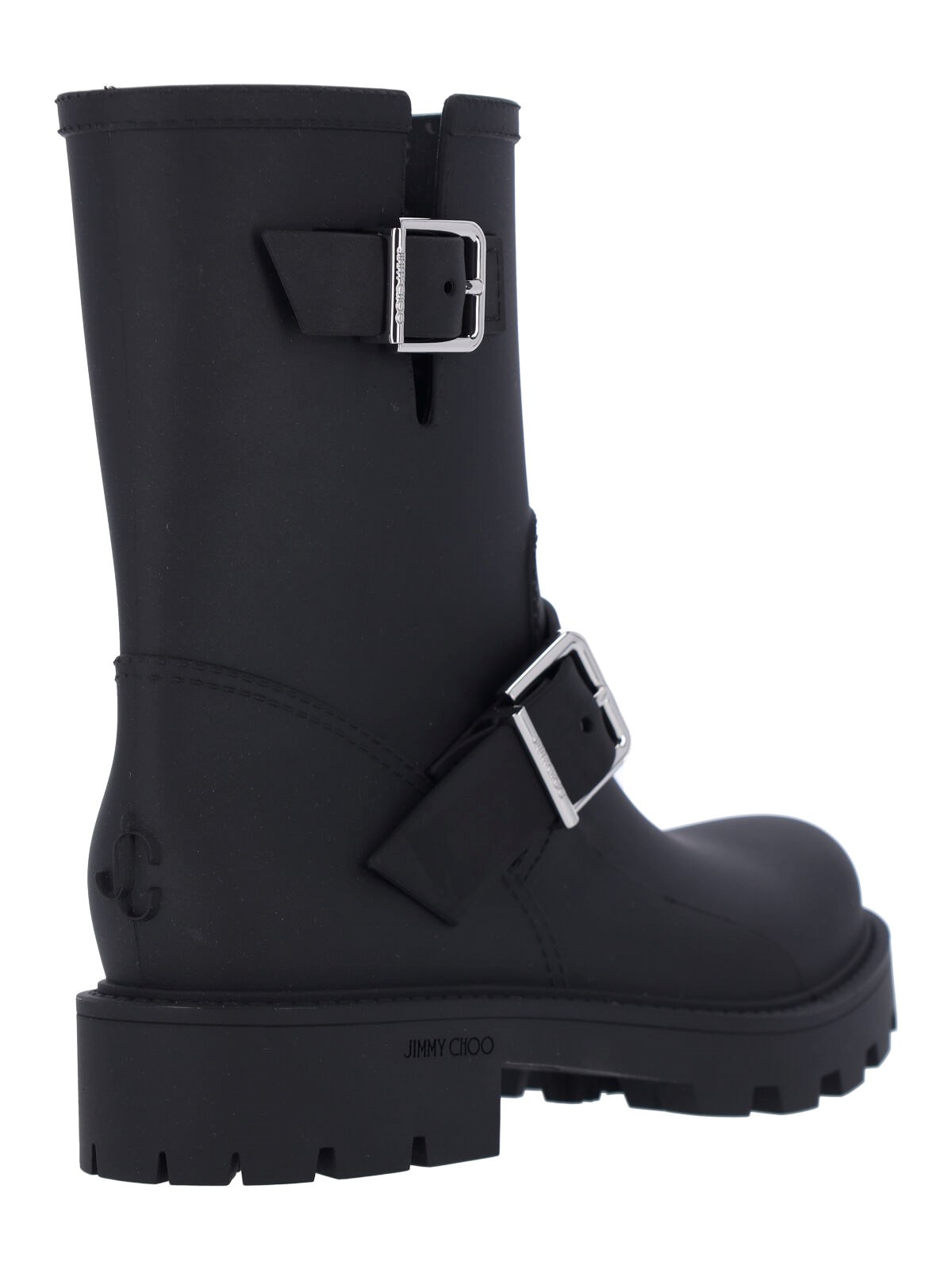 Jimmy Choo biker rain black rubber ankle boots with round toe, silver metal buckles on the sides, tone-on-tone logo embossed on the front, and rubber sole.