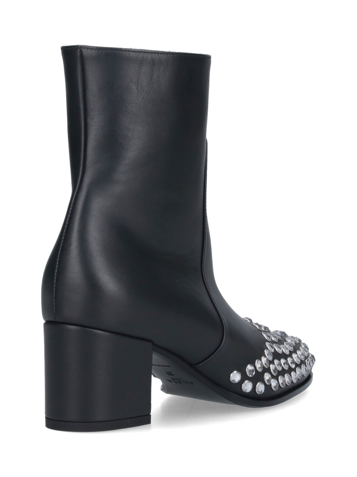 Alaia low ankle boots with black leather rhinestones, round toe, silver rhinestone details, side zip closure, slip-on fit, square heel, leather sole.