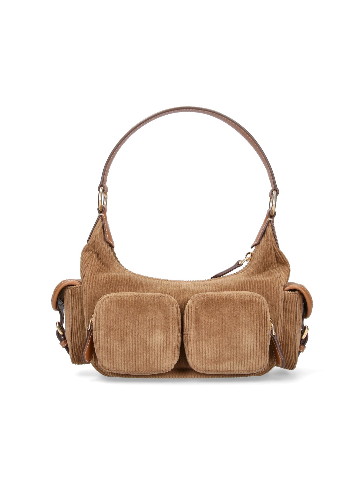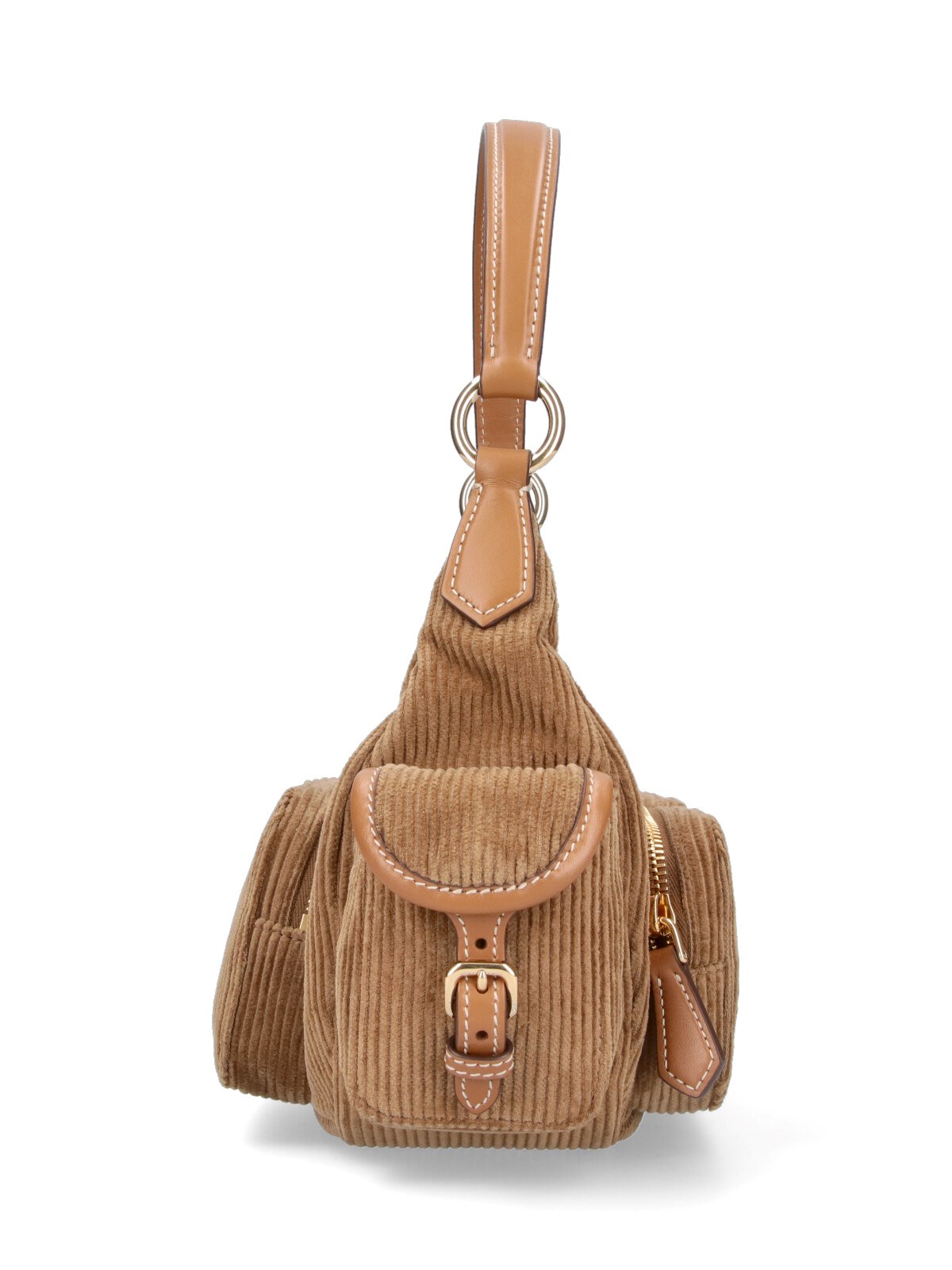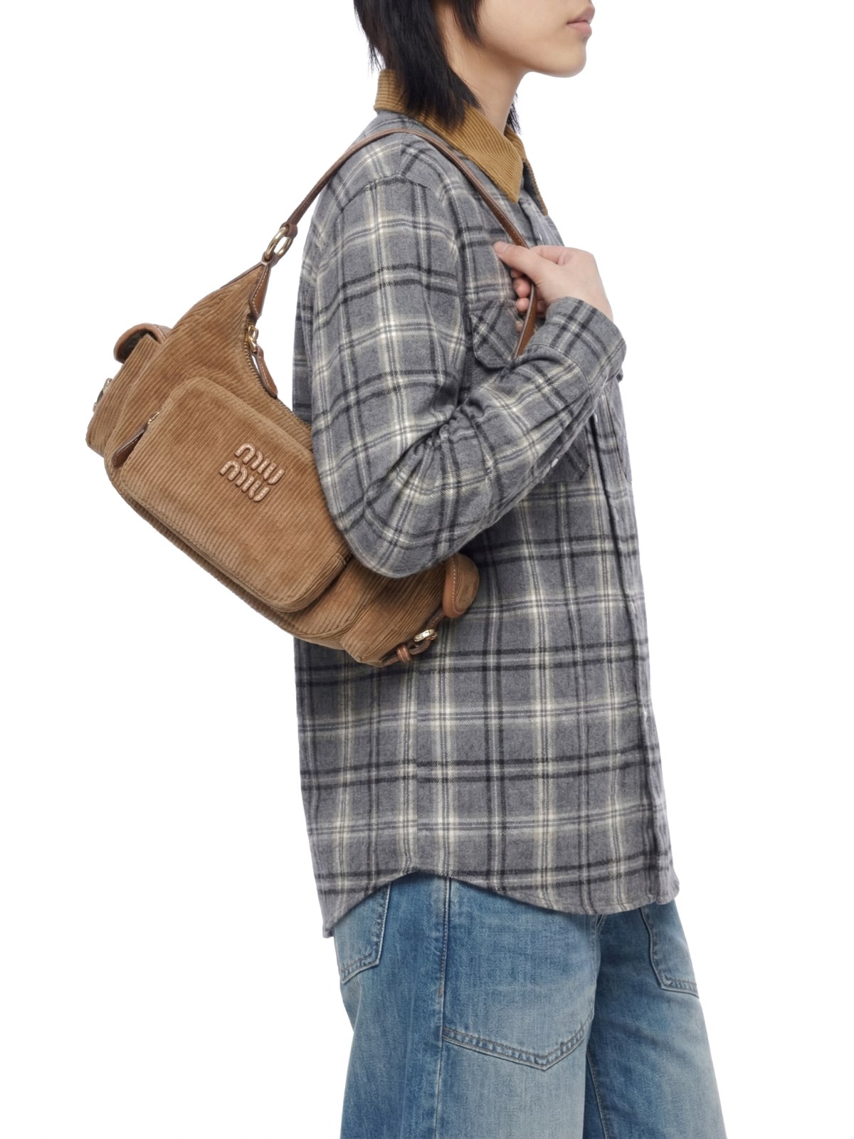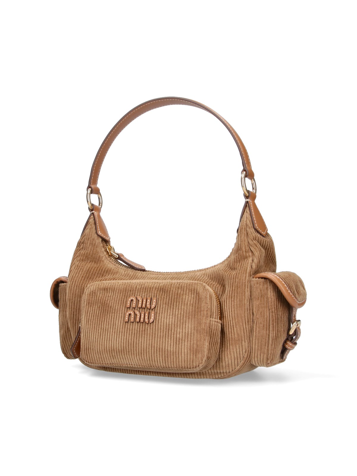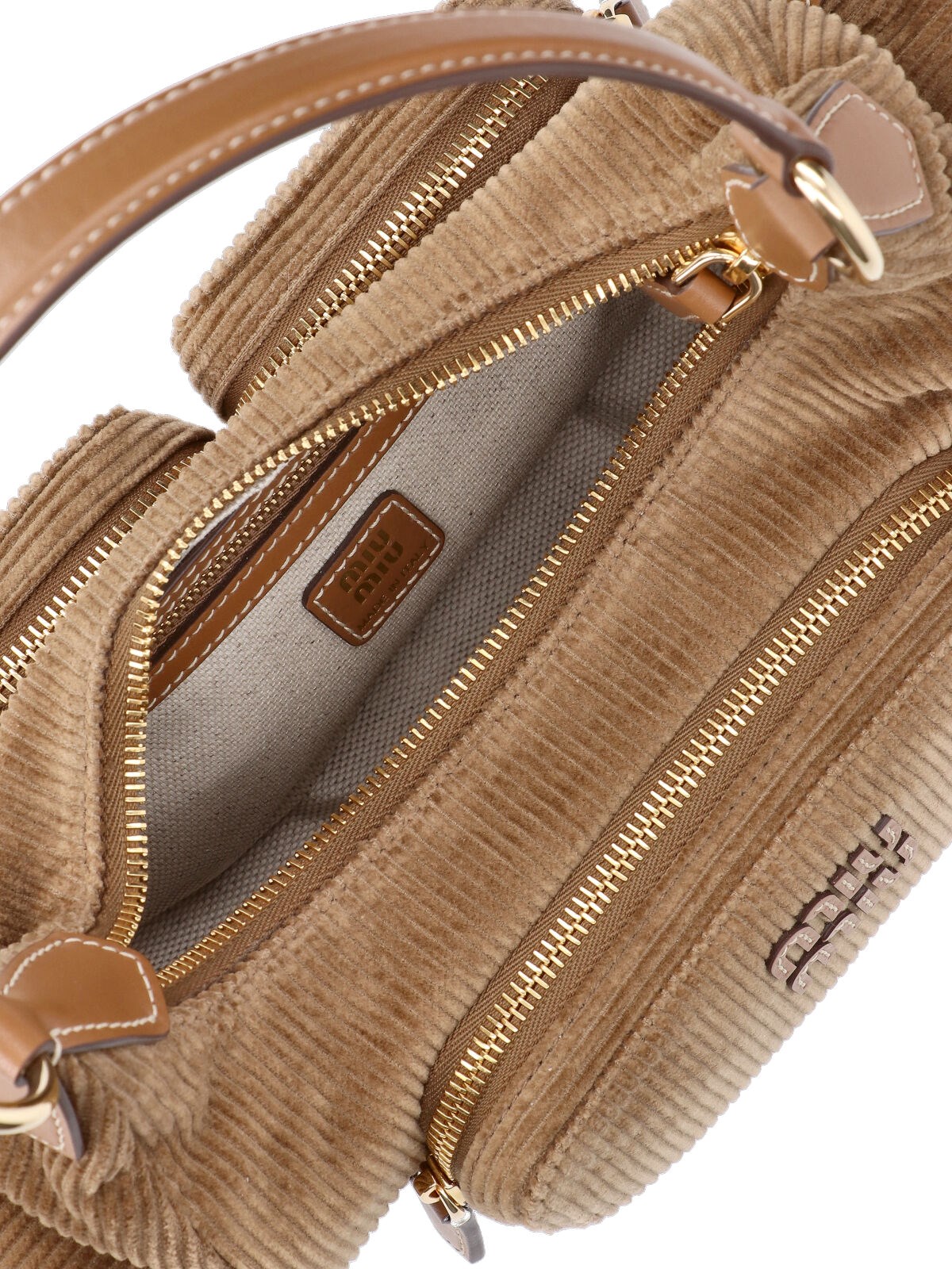 shoulder bag 'pocket' miu miu in brown velvet, ribbed workmanship, one top handle, top zip closure, one front zip cargo pocket, two back zip pockets, two side buckle cargo pockets, tone-on-tone logo lettering on the front, one internal zip pocket, one main internal compartment.