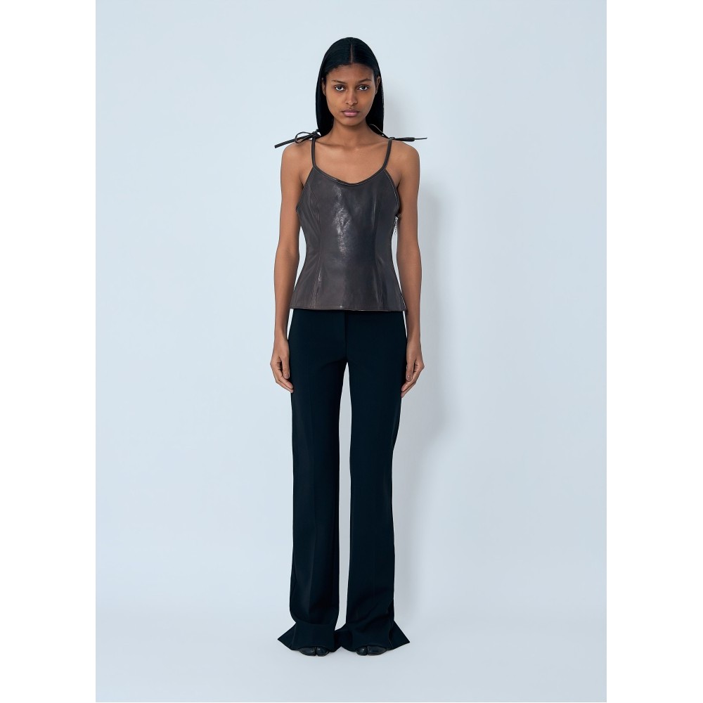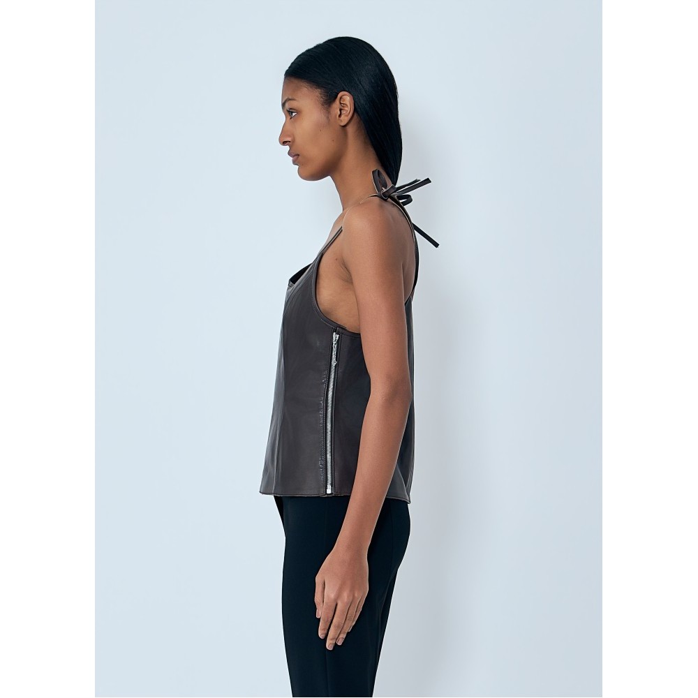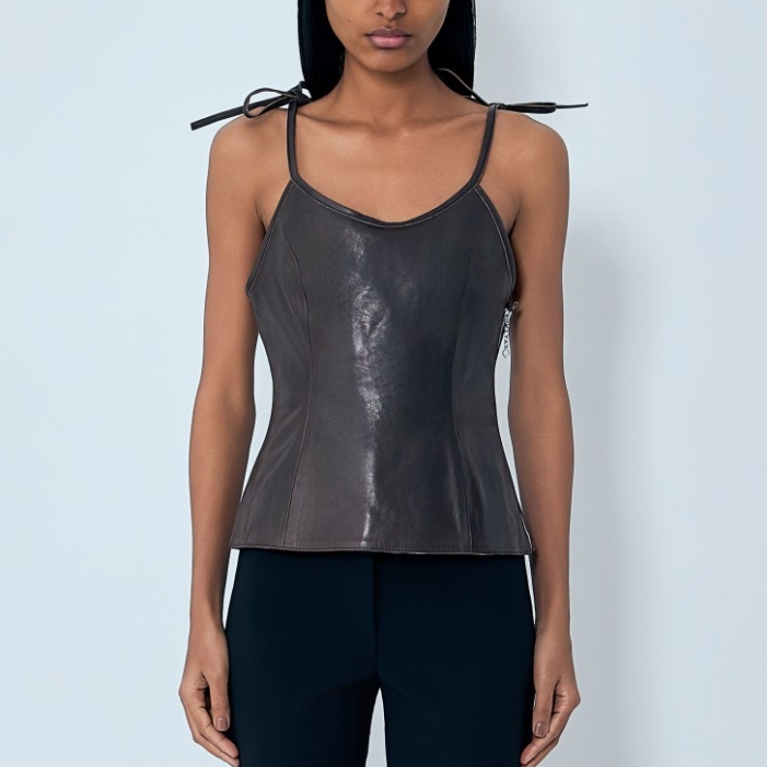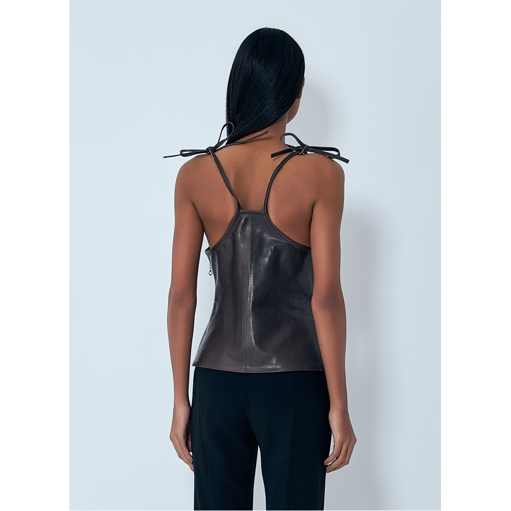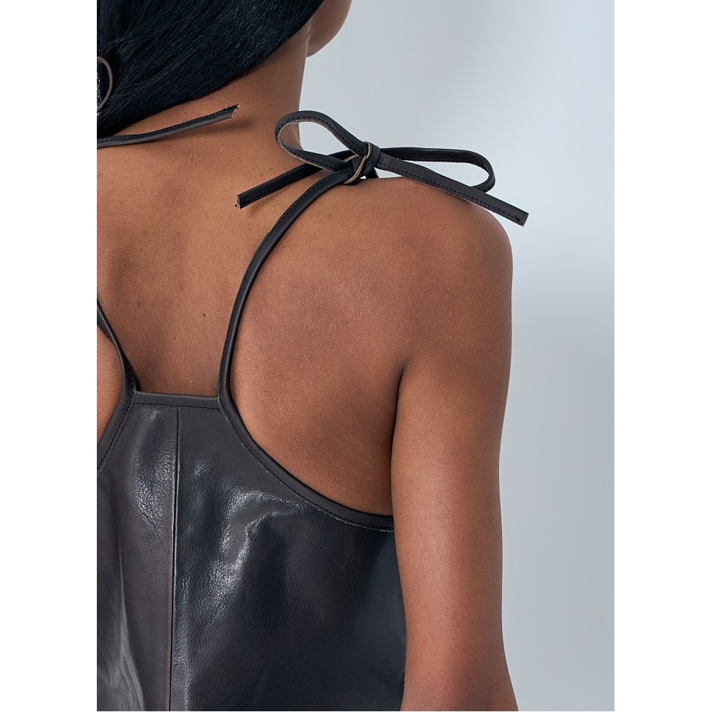 Leather corset top with tie shoulder straps.
