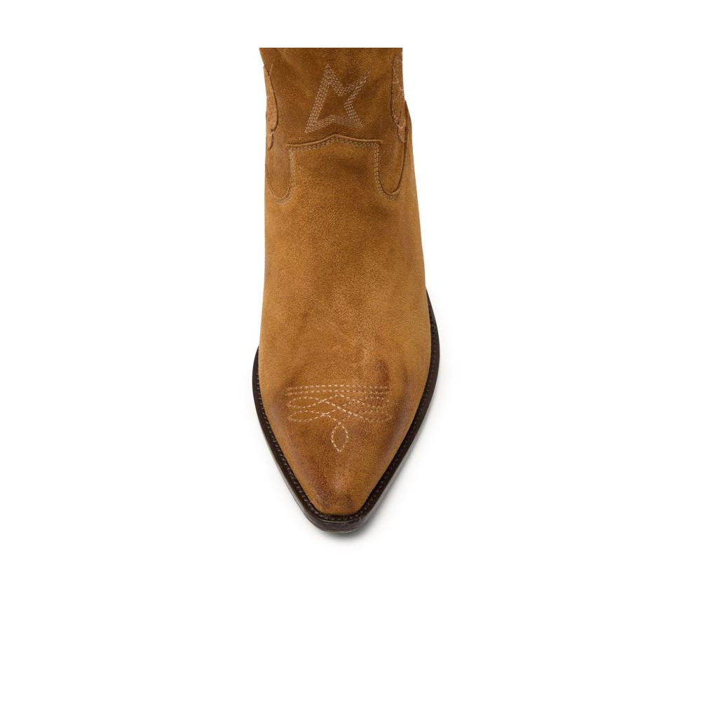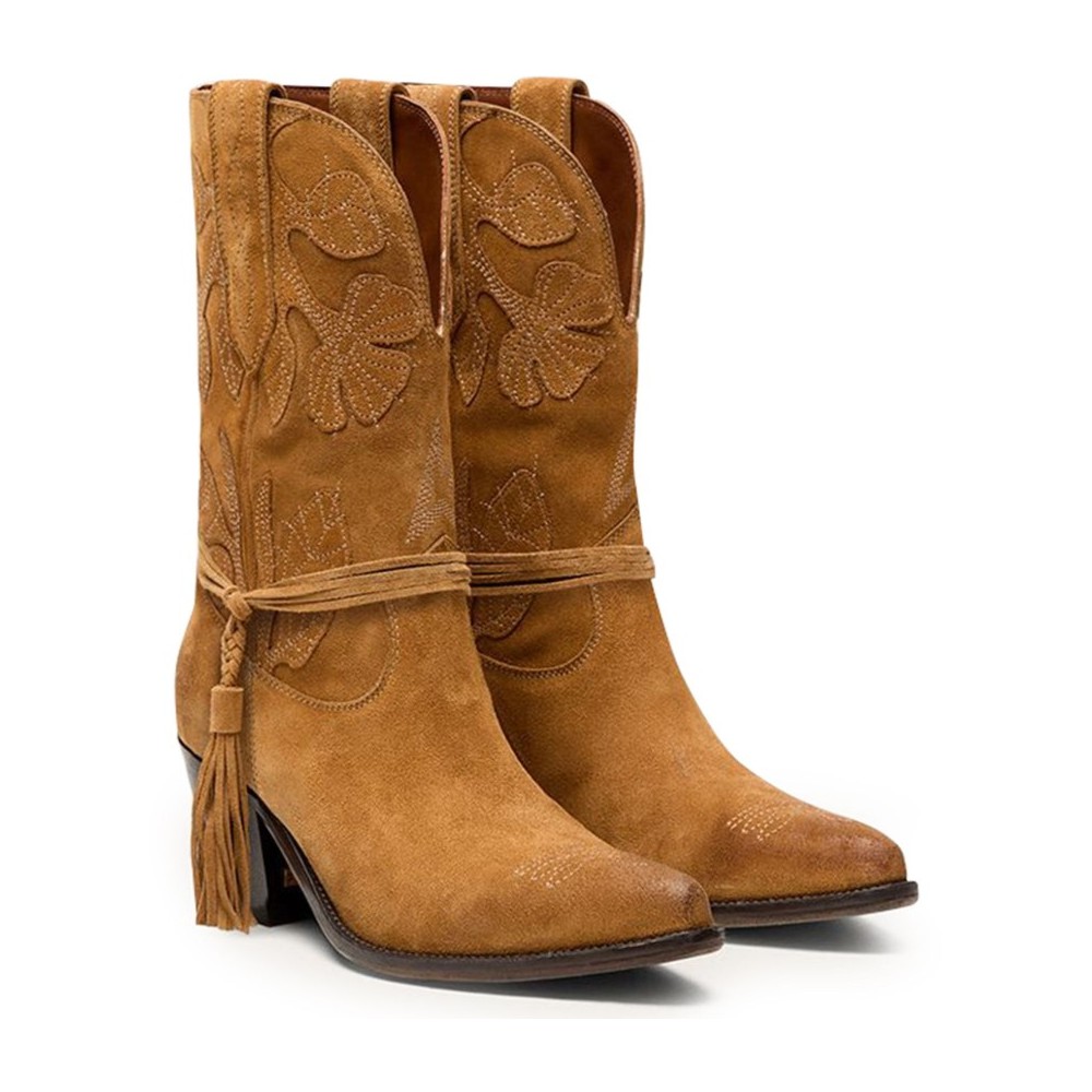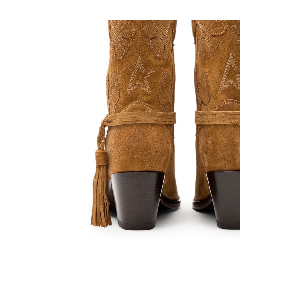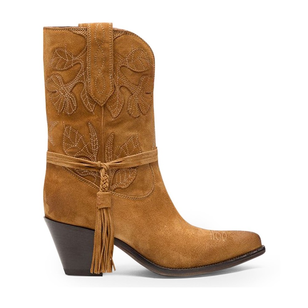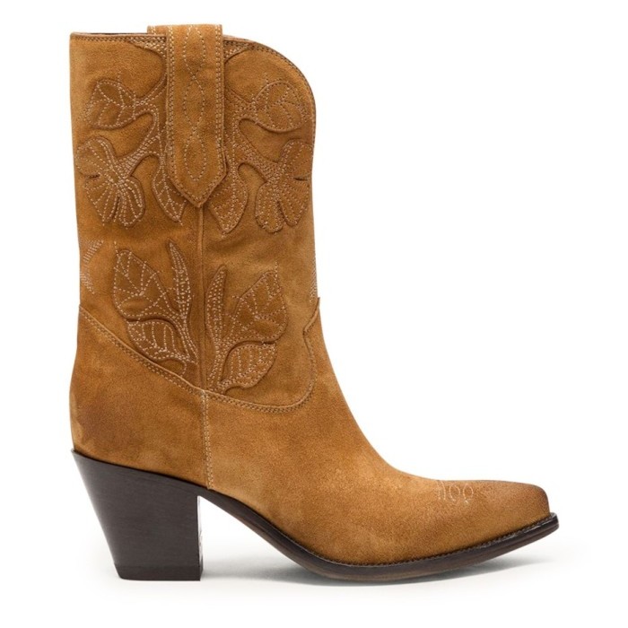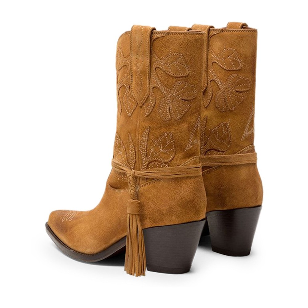 Description : Boots, suede, block heel, medium heel, pointed toe, cowboy boots, visible stitching, embroidered.