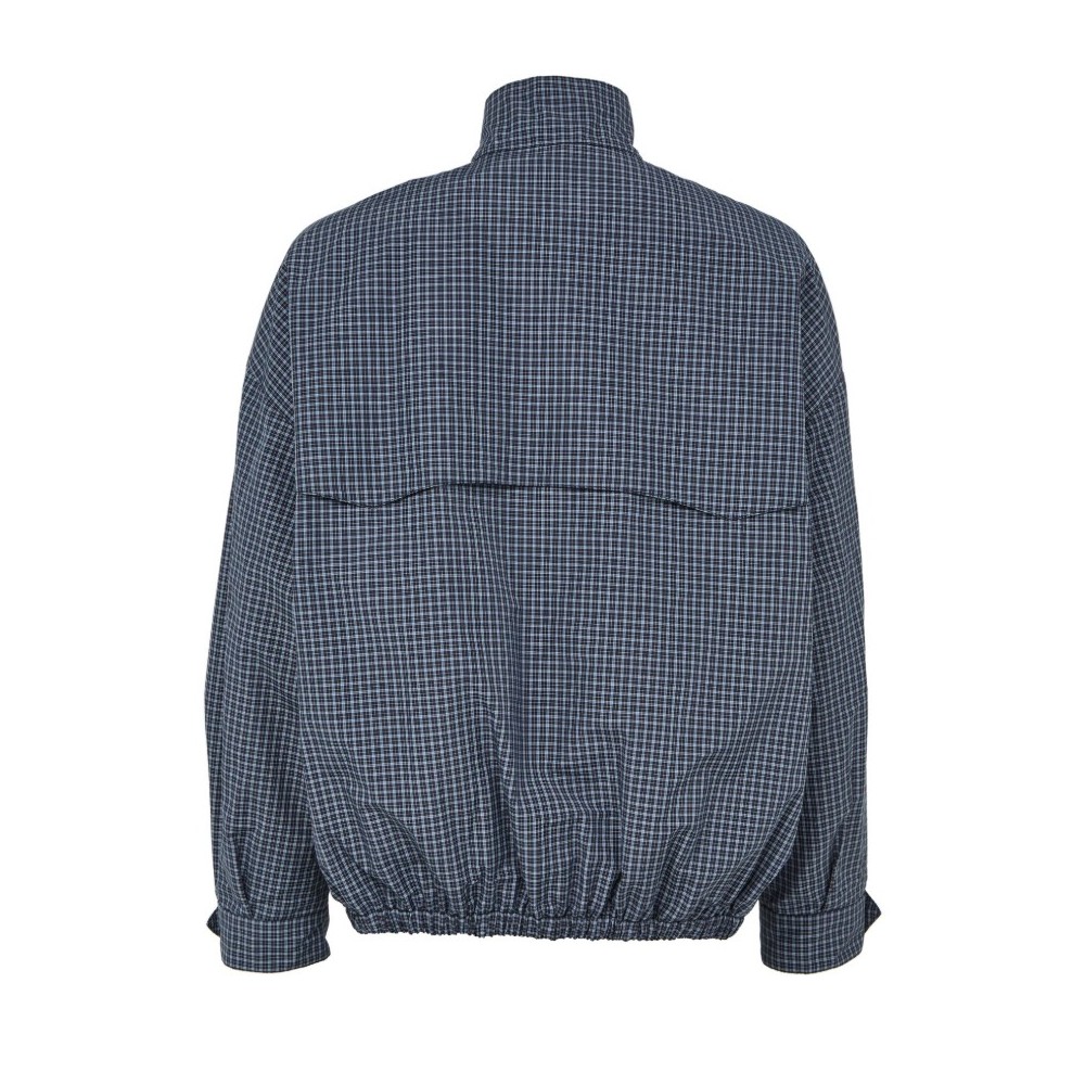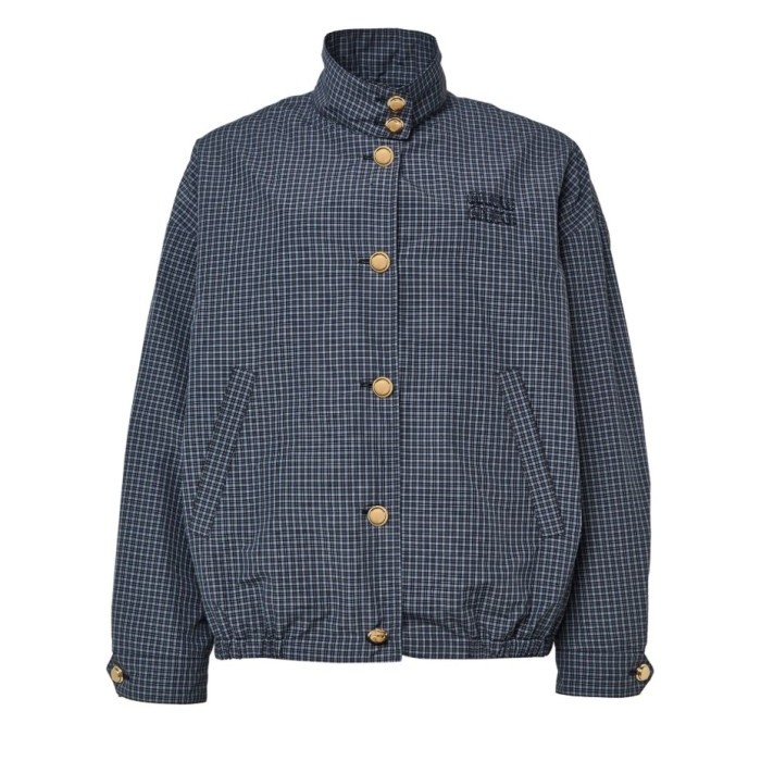 Description : Embroidered 'Miu Miu' logo, chest logo, checked pattern, short, high neck, long-sleeved, side pockets, button fastening, gold finish.
