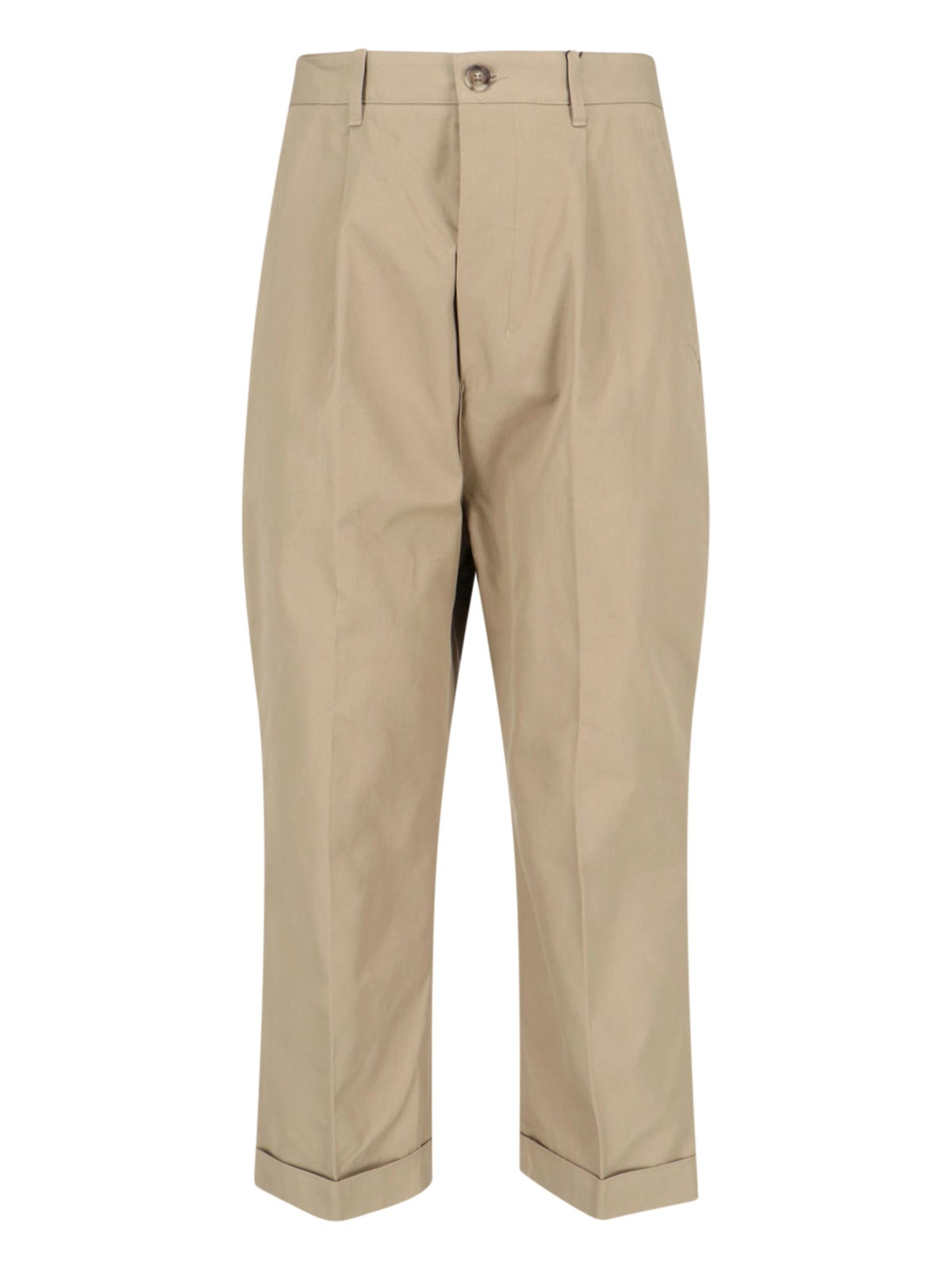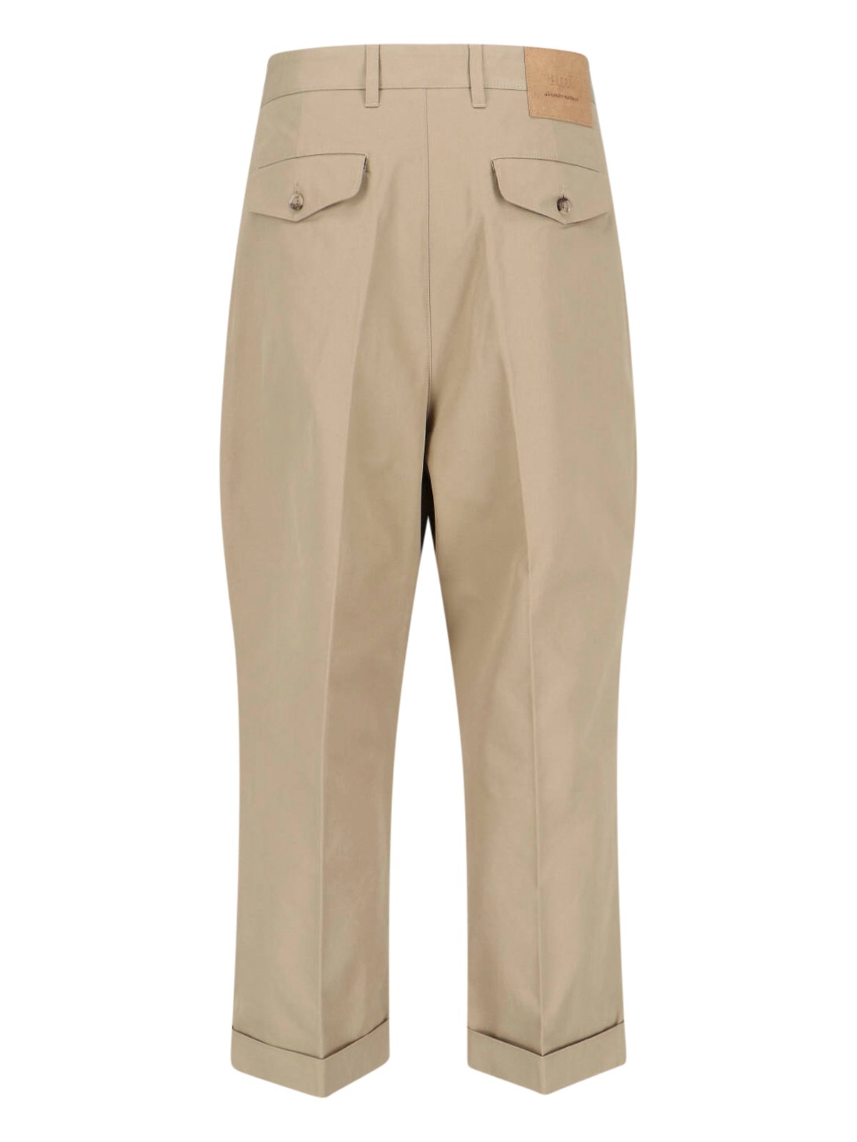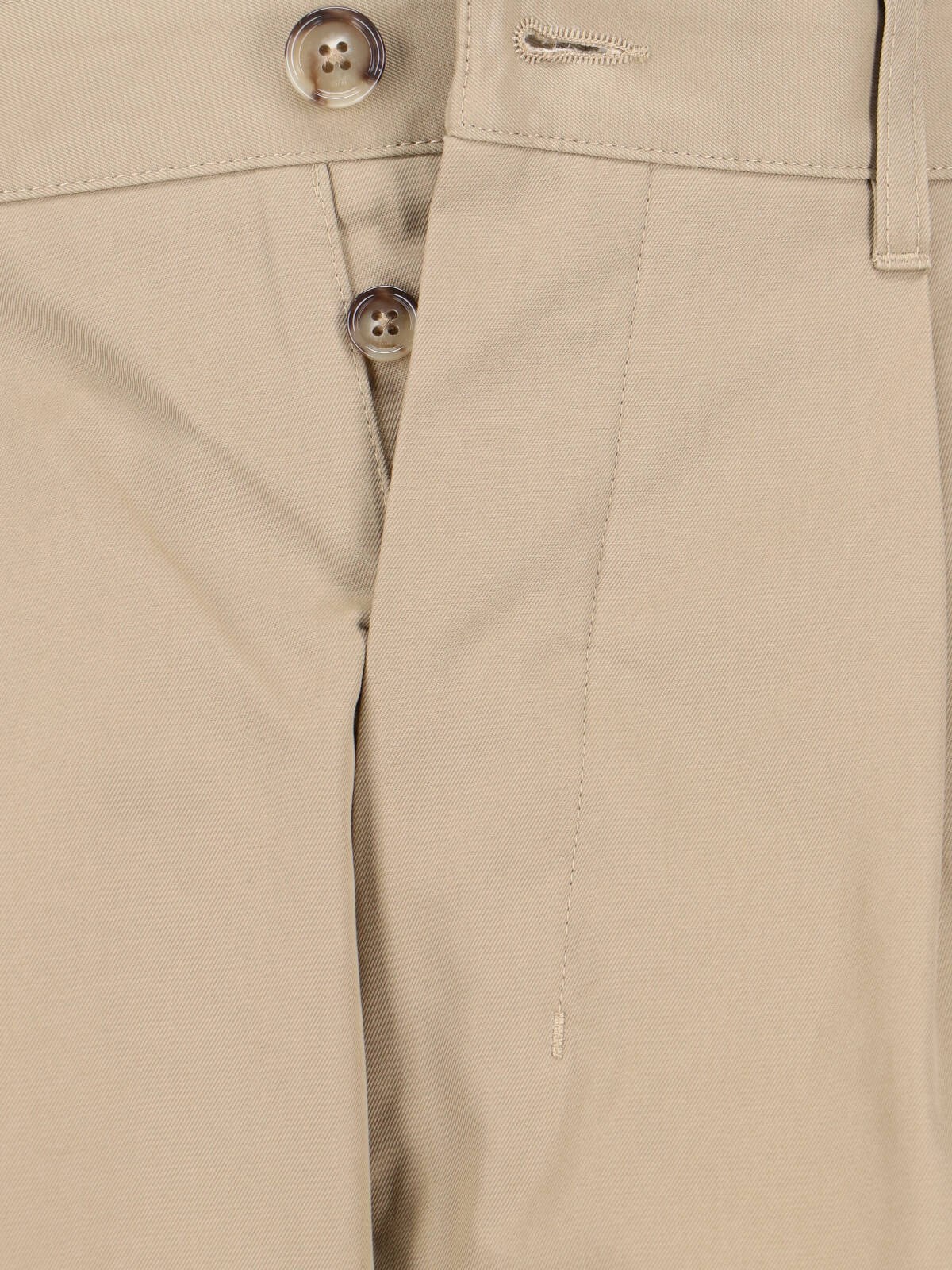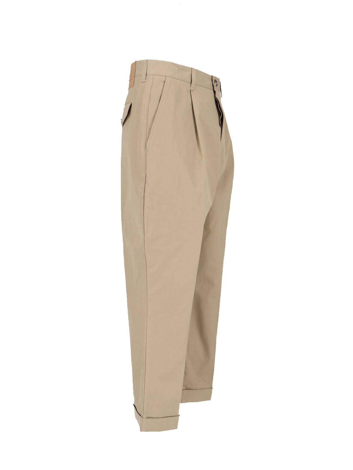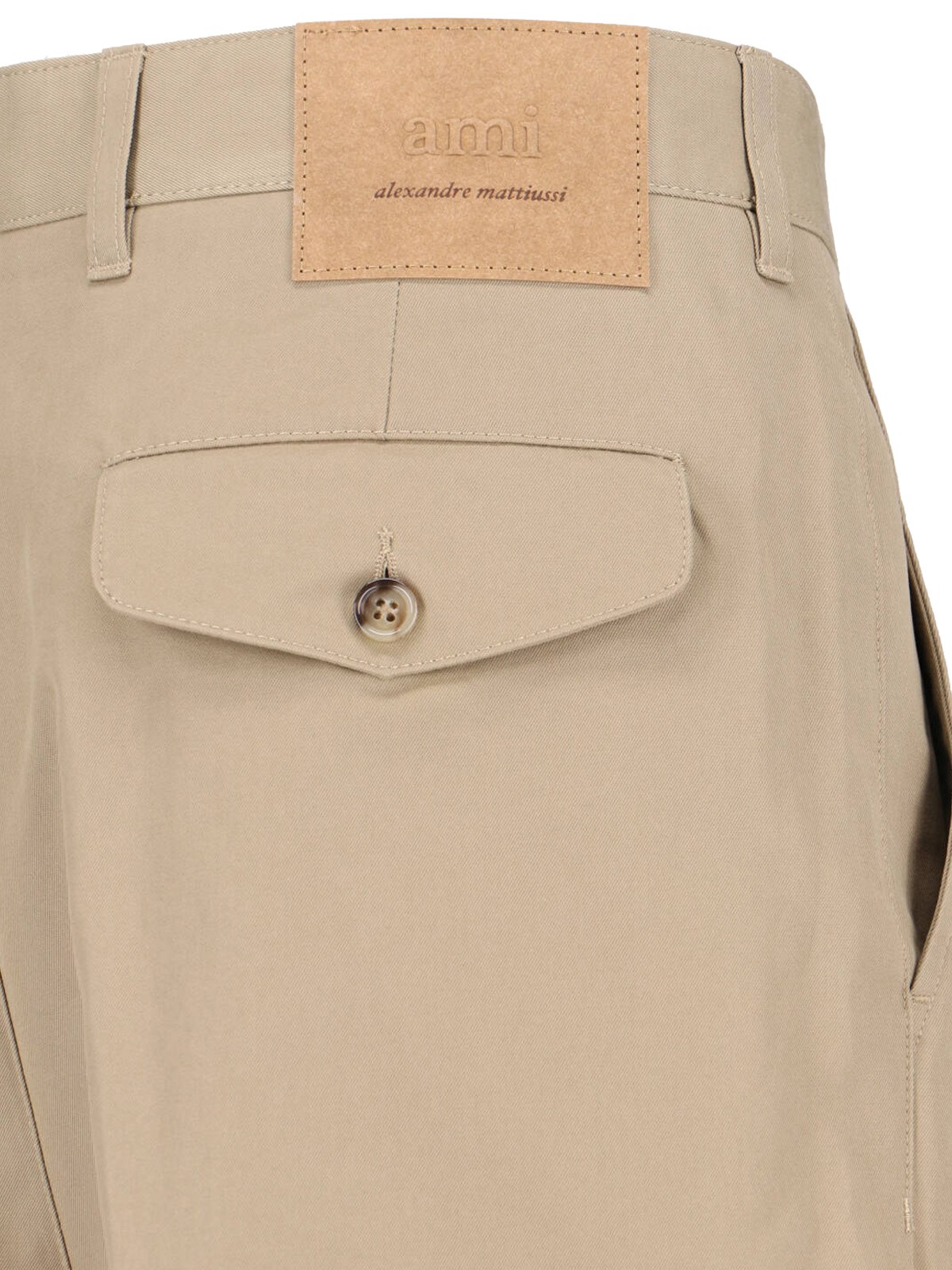 Ami beige cotton pants with mid waist, belt loops, front pin tucks, button closure, two side pockets, suede logo patch on the back, two back button pockets, straight leg.
