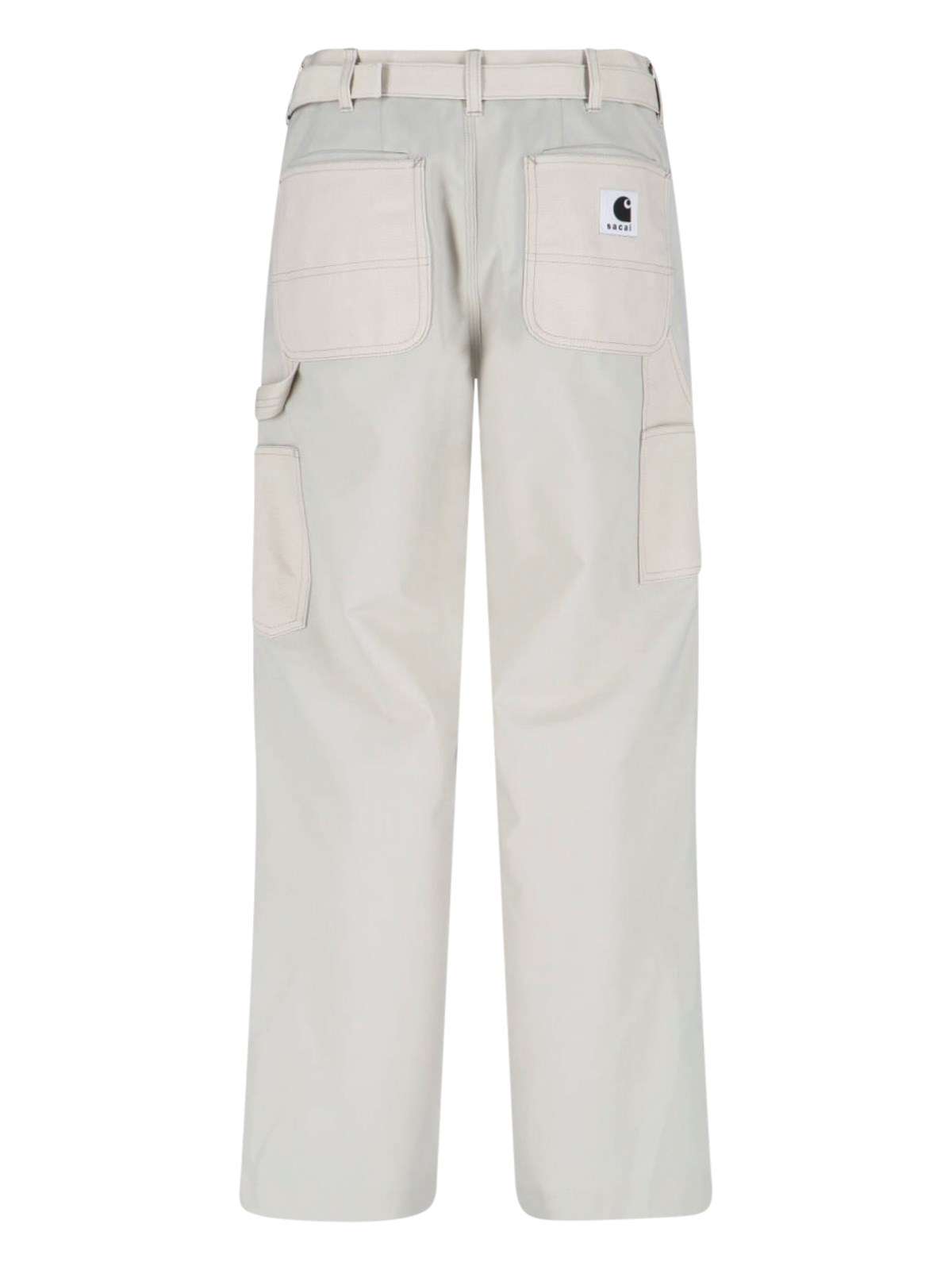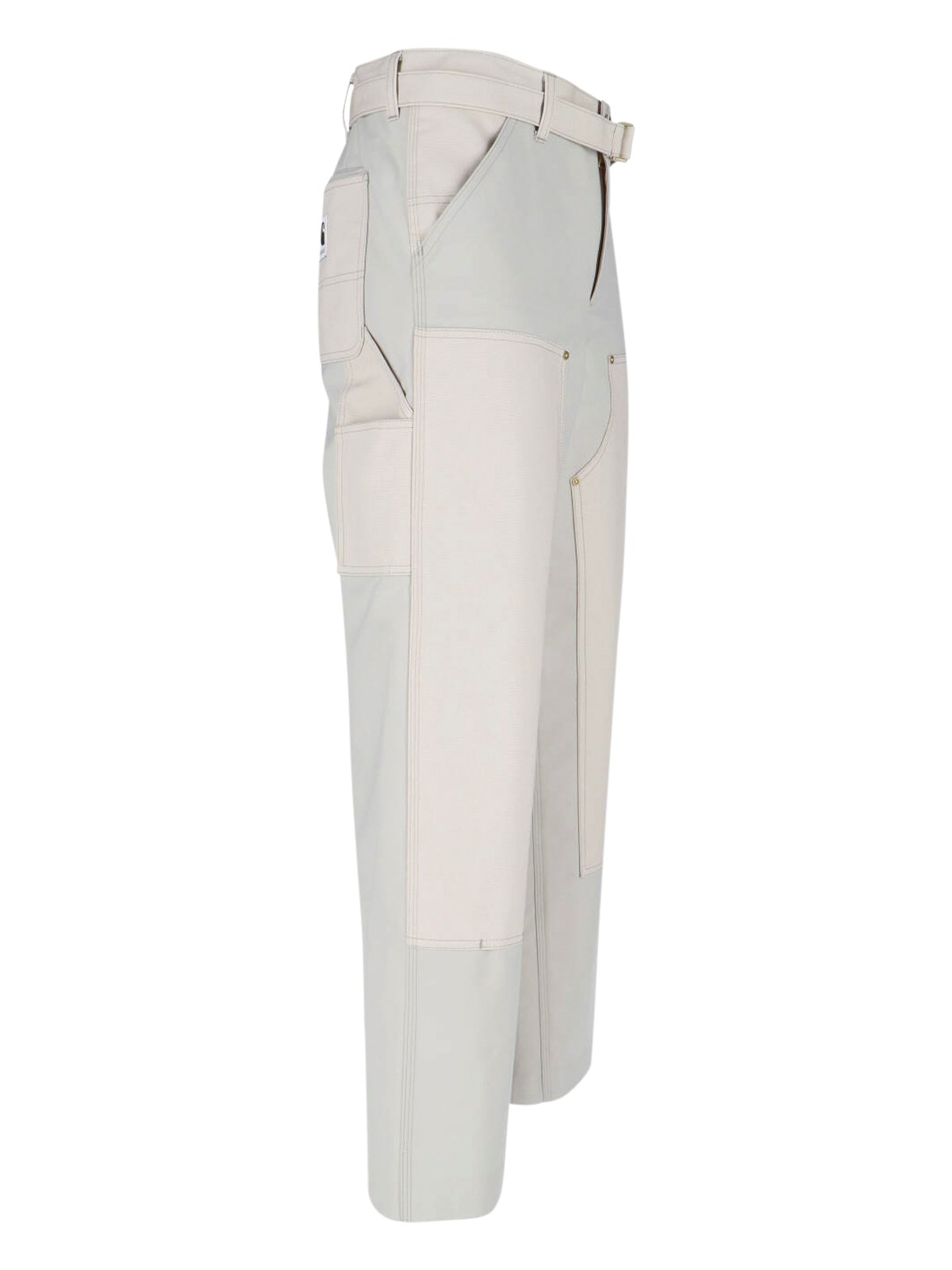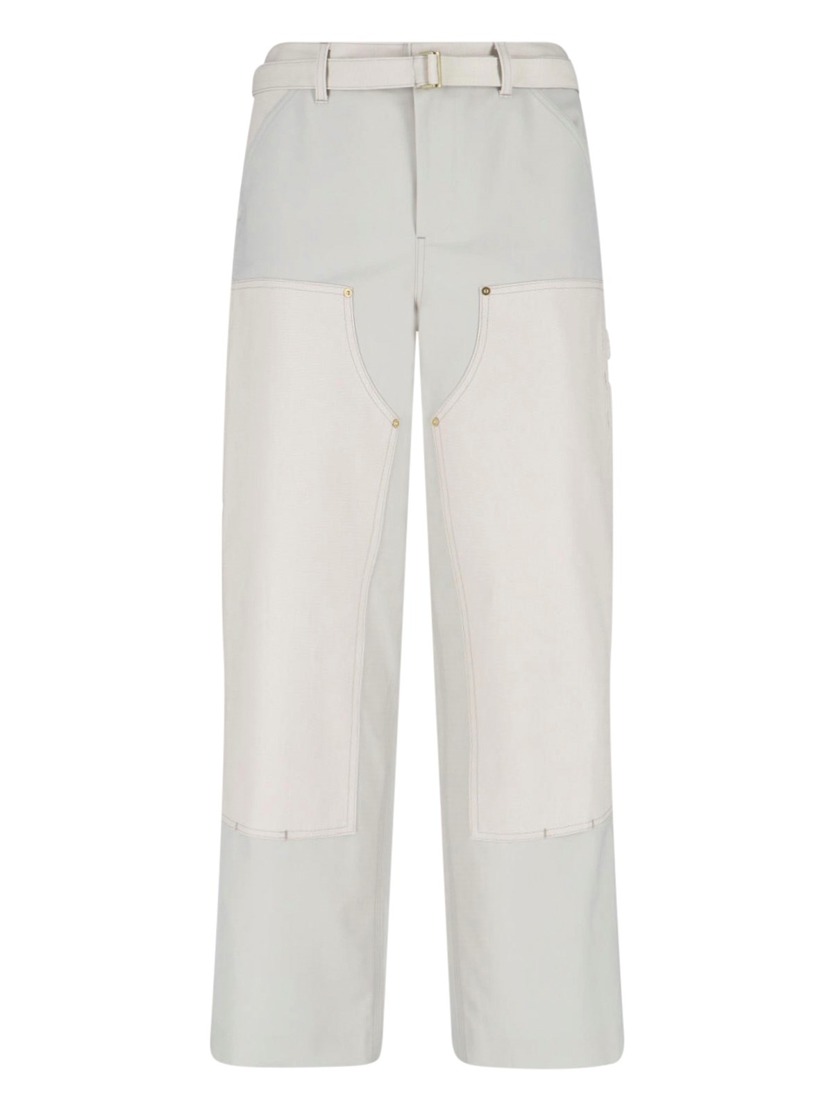 Sacai X Carhartt WIP Double Knee pants in white fabric and wool, mid waist, button and zip closure, buckle belt, two slanted side pockets, two back pockets, back logo patch, straight leg.