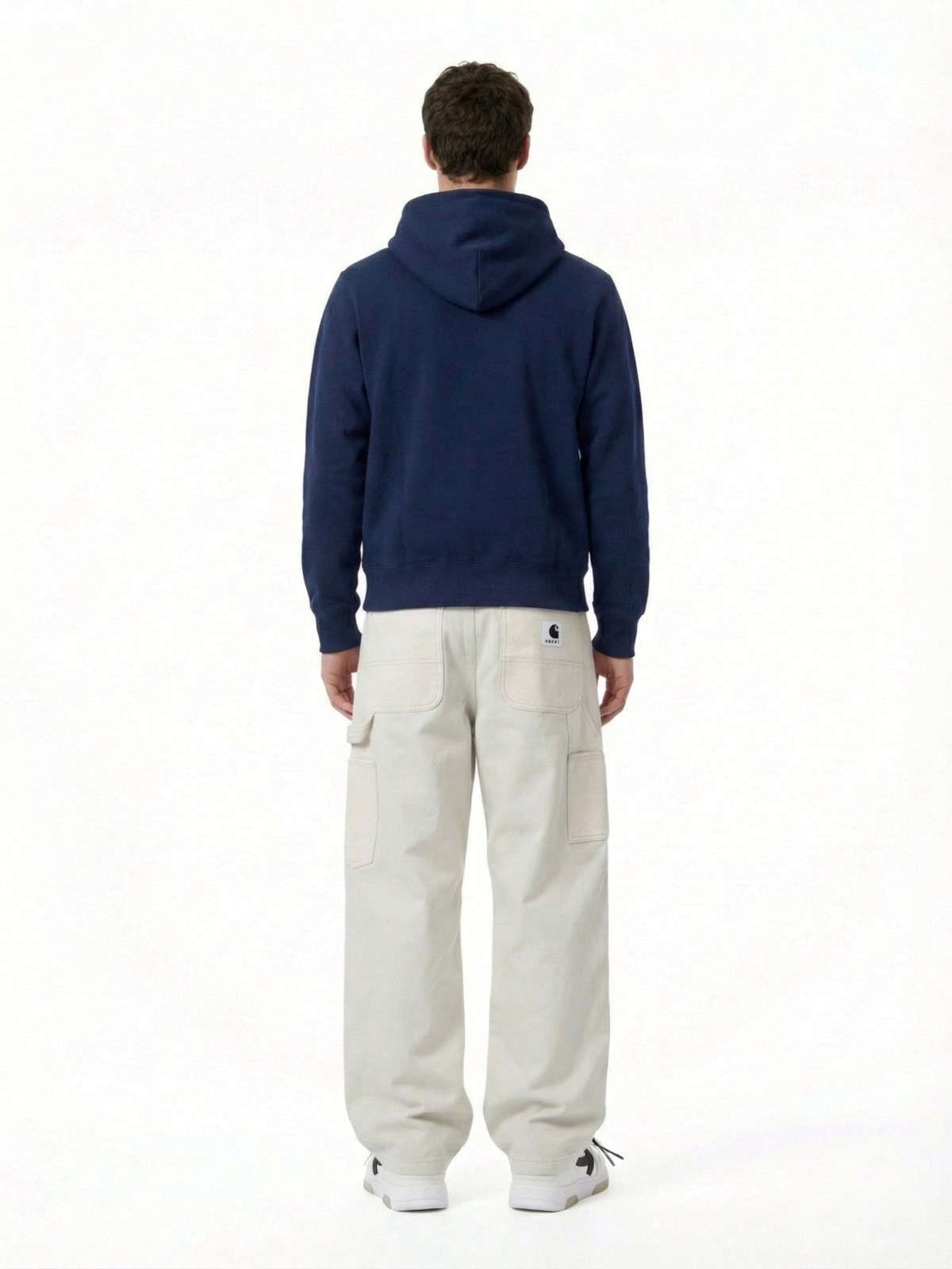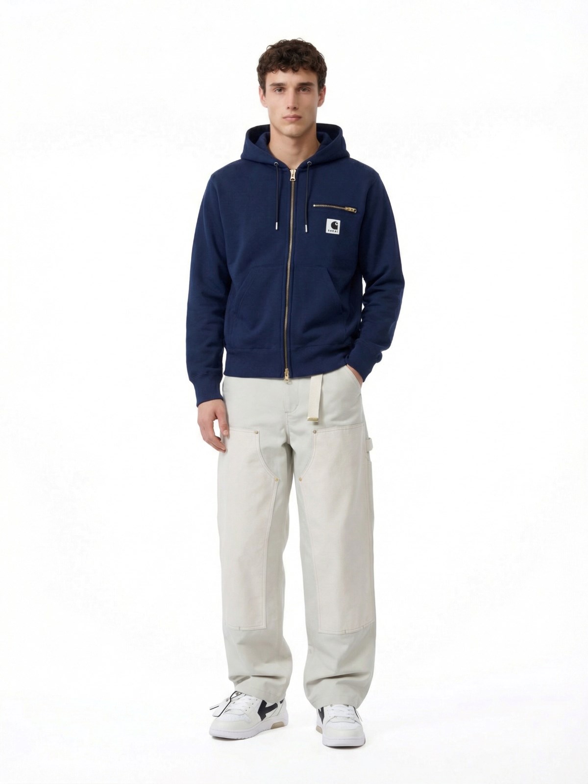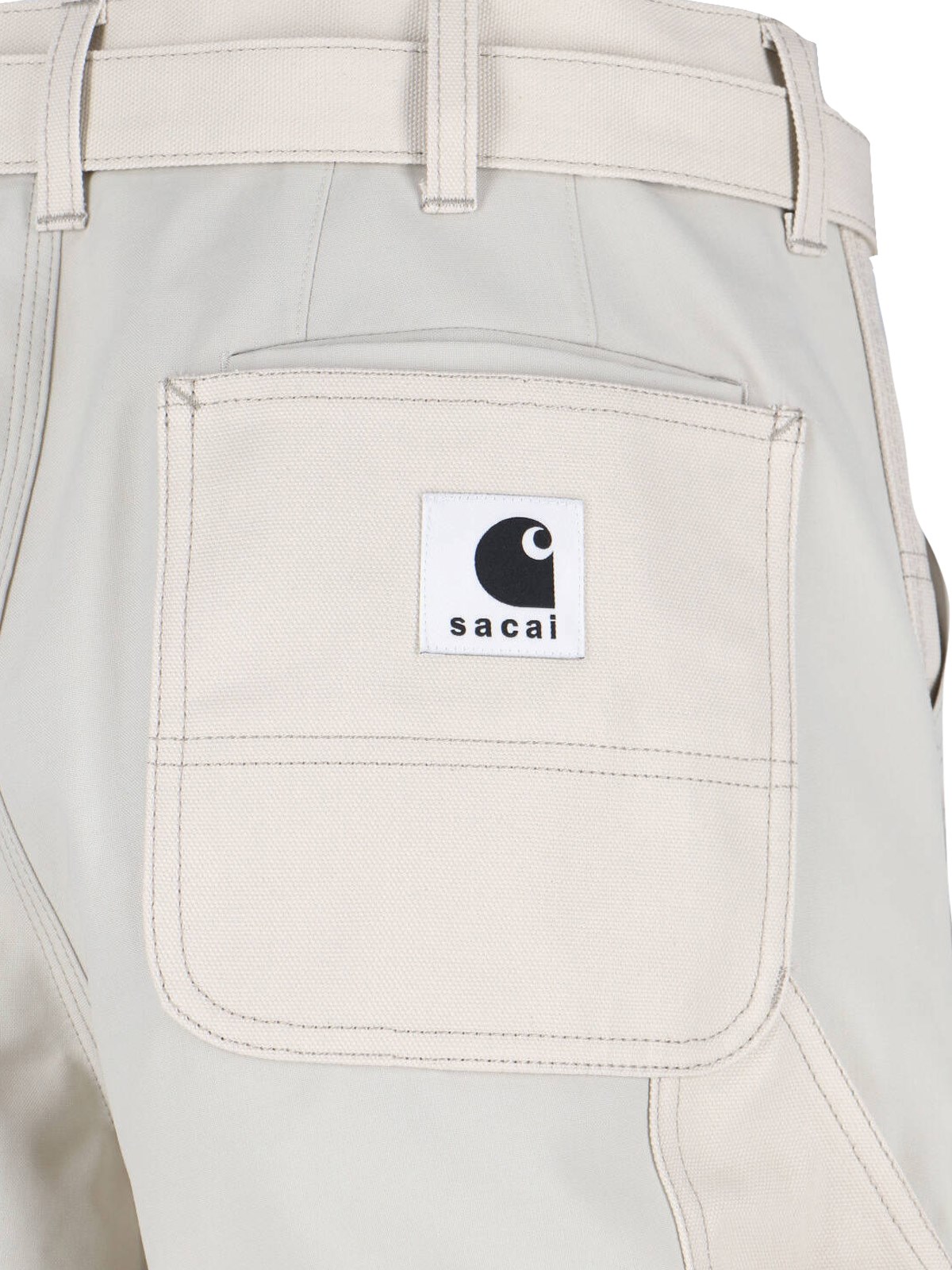Sacai X Carhartt WIP Double Knee pants in white fabric and wool, mid waist, button and zip closure, buckle belt, two slanted side pockets, two back pockets, back logo patch, straight leg.