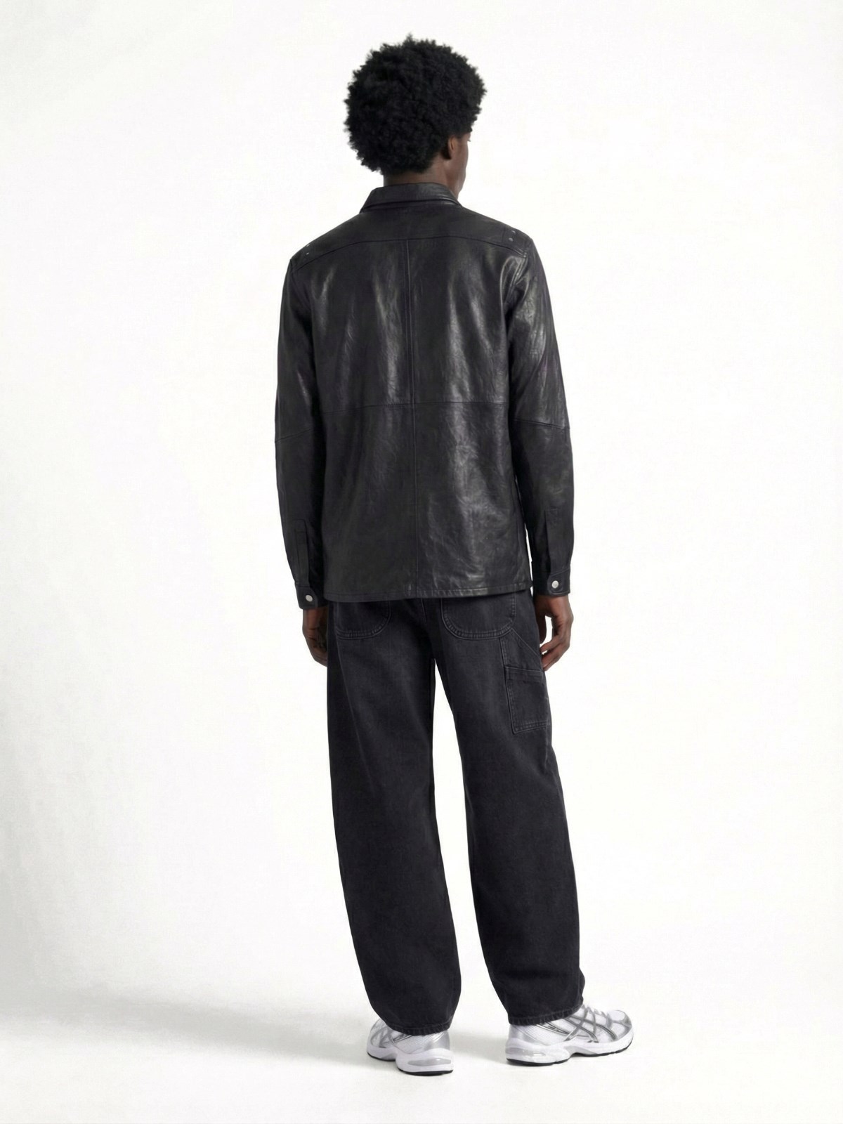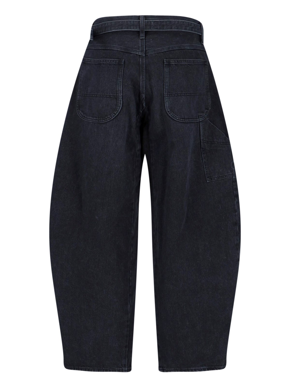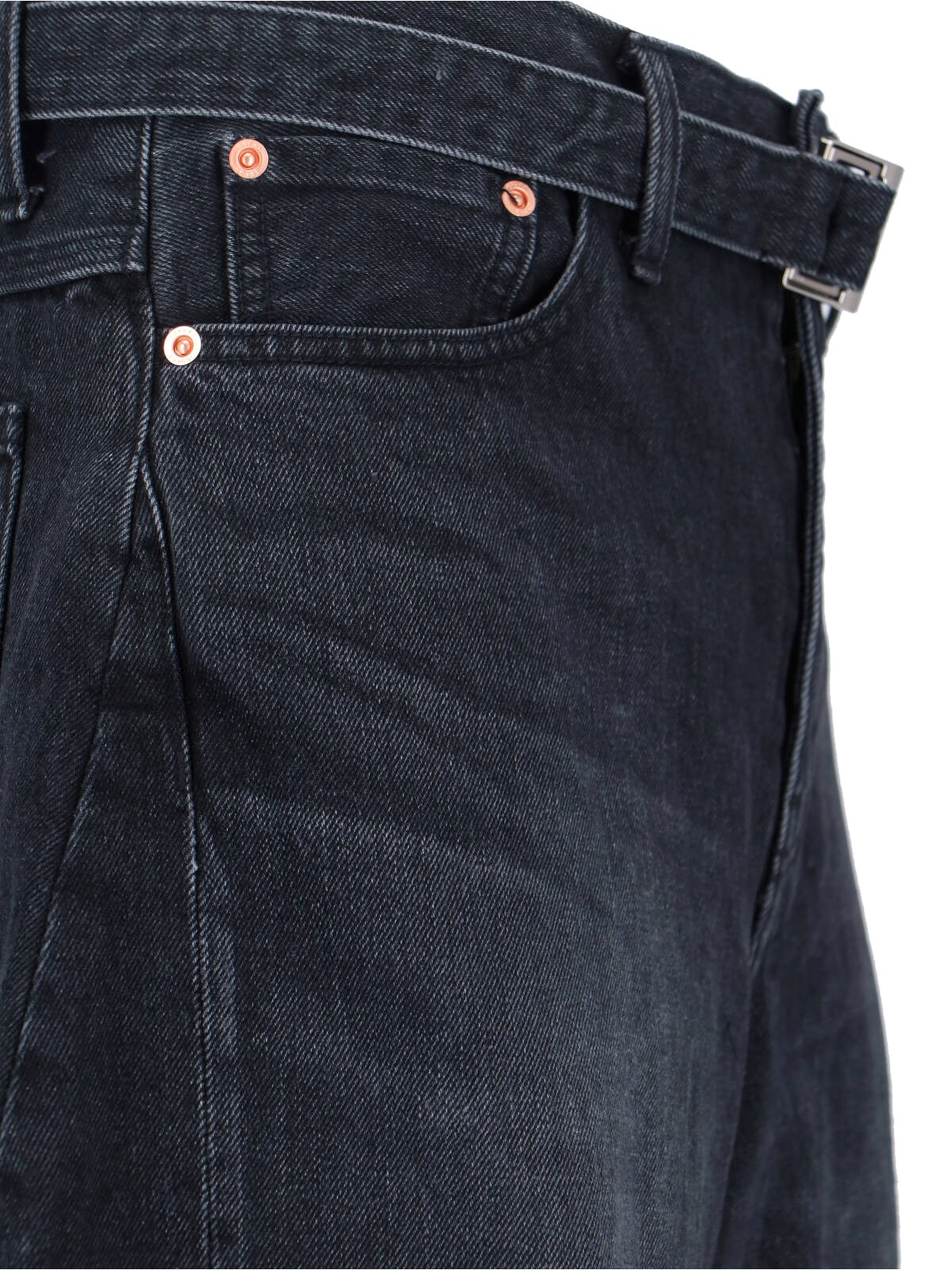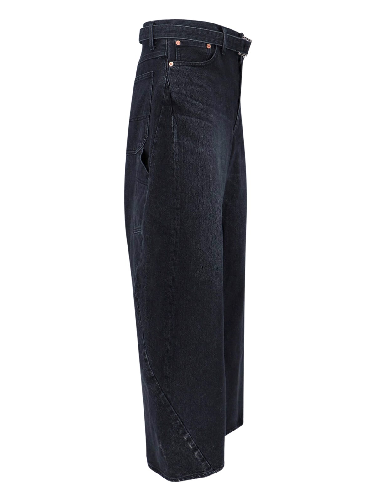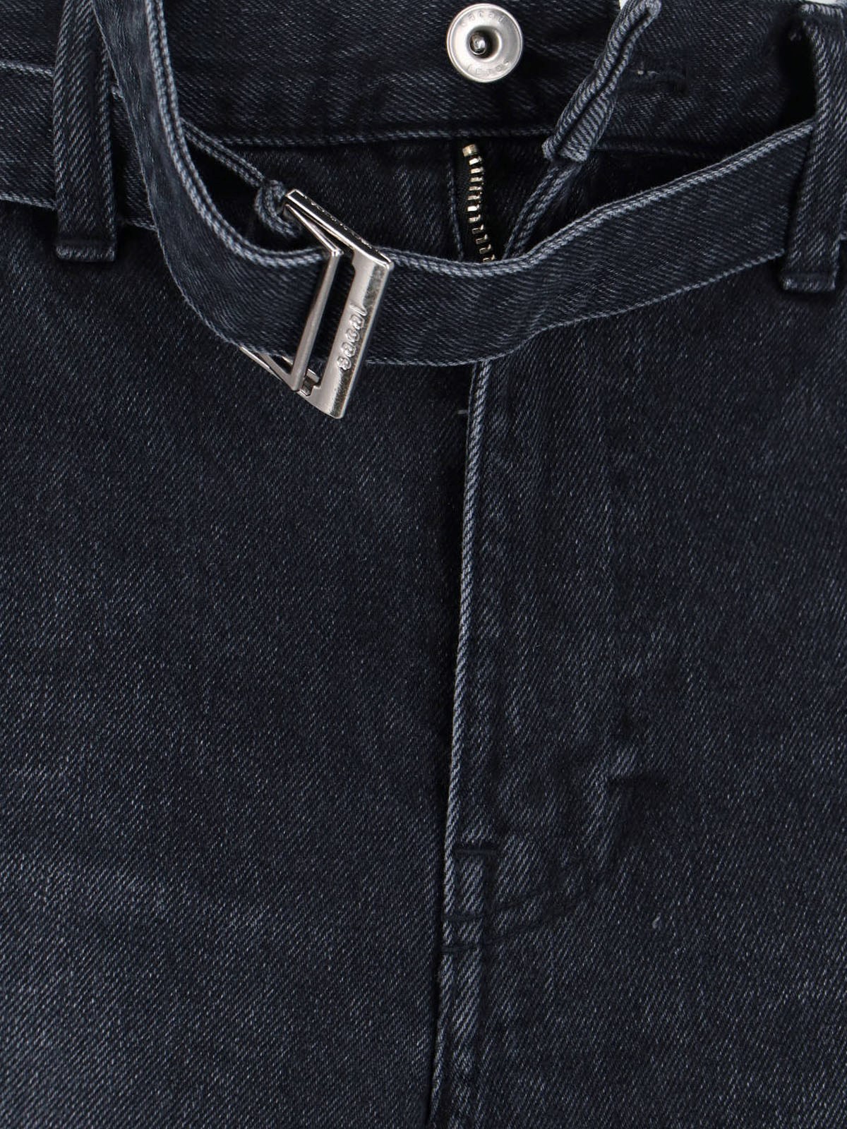 Sacai wide barrel jeans in black cotton denim with medium waist, button and zip closure, belt buckle at the waist, wide curved leg.