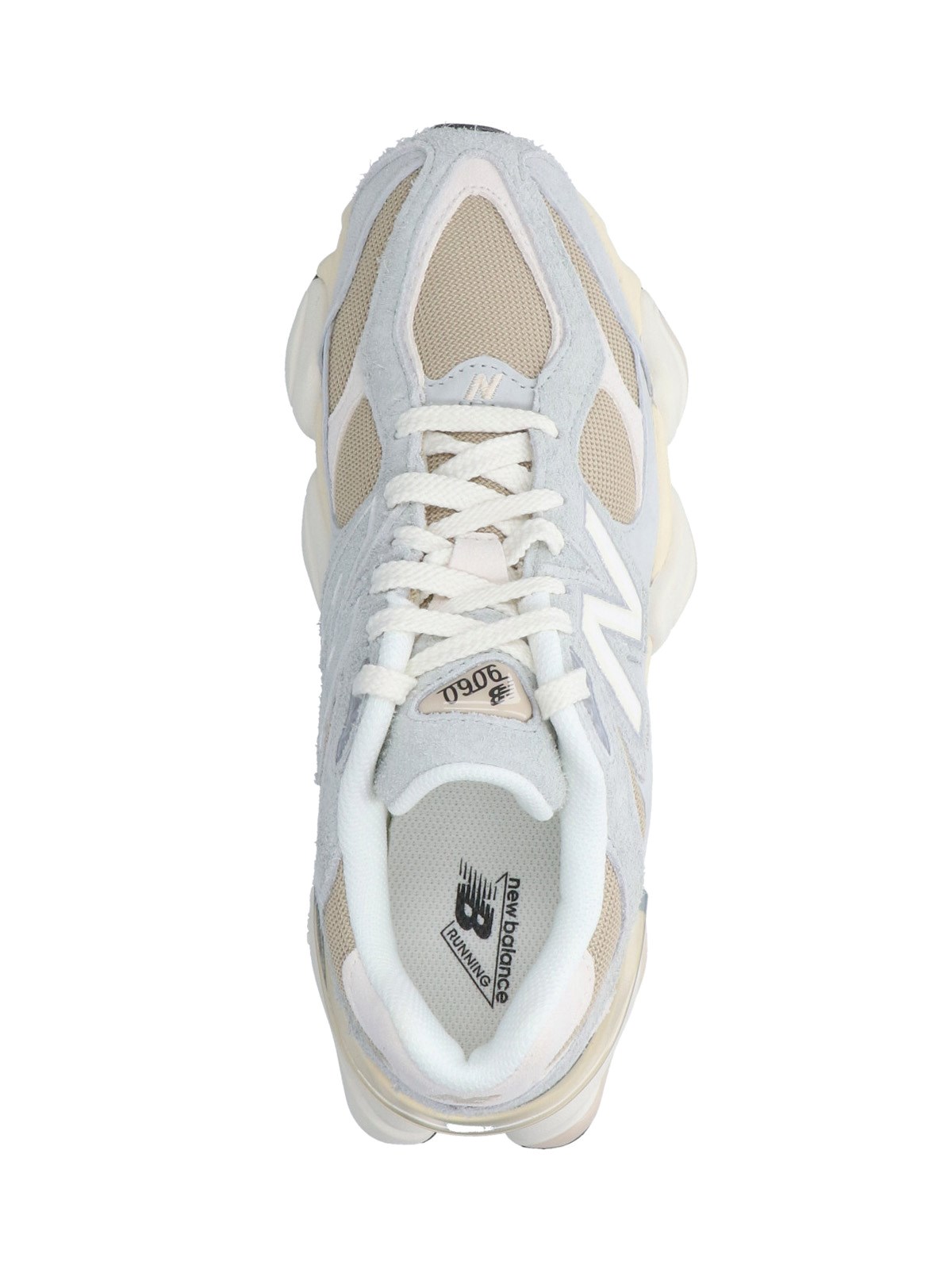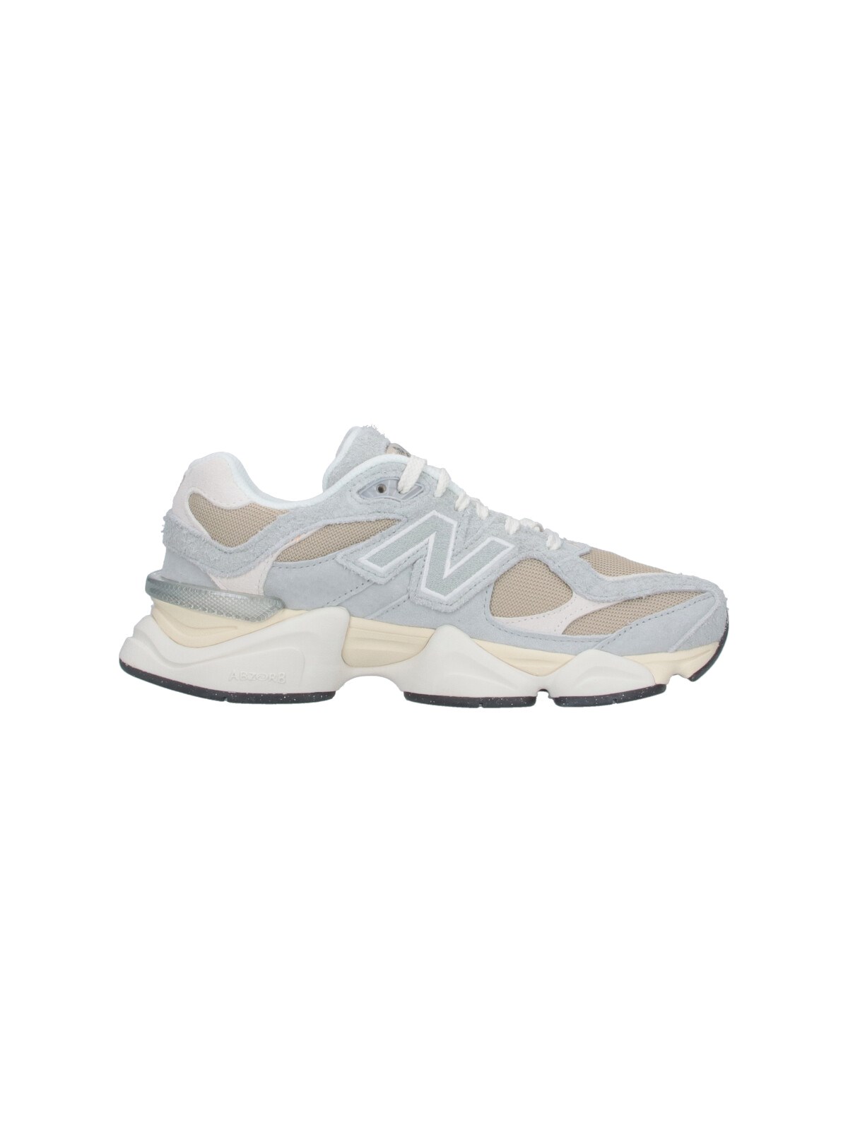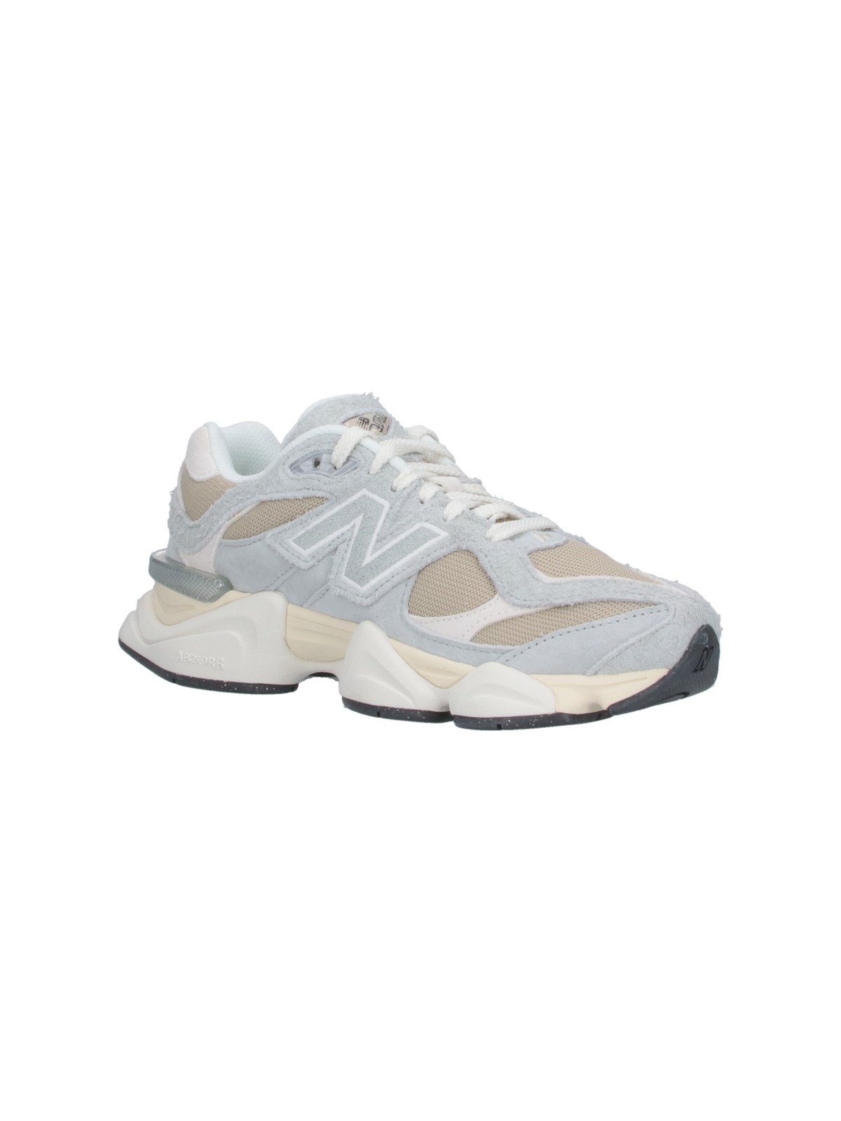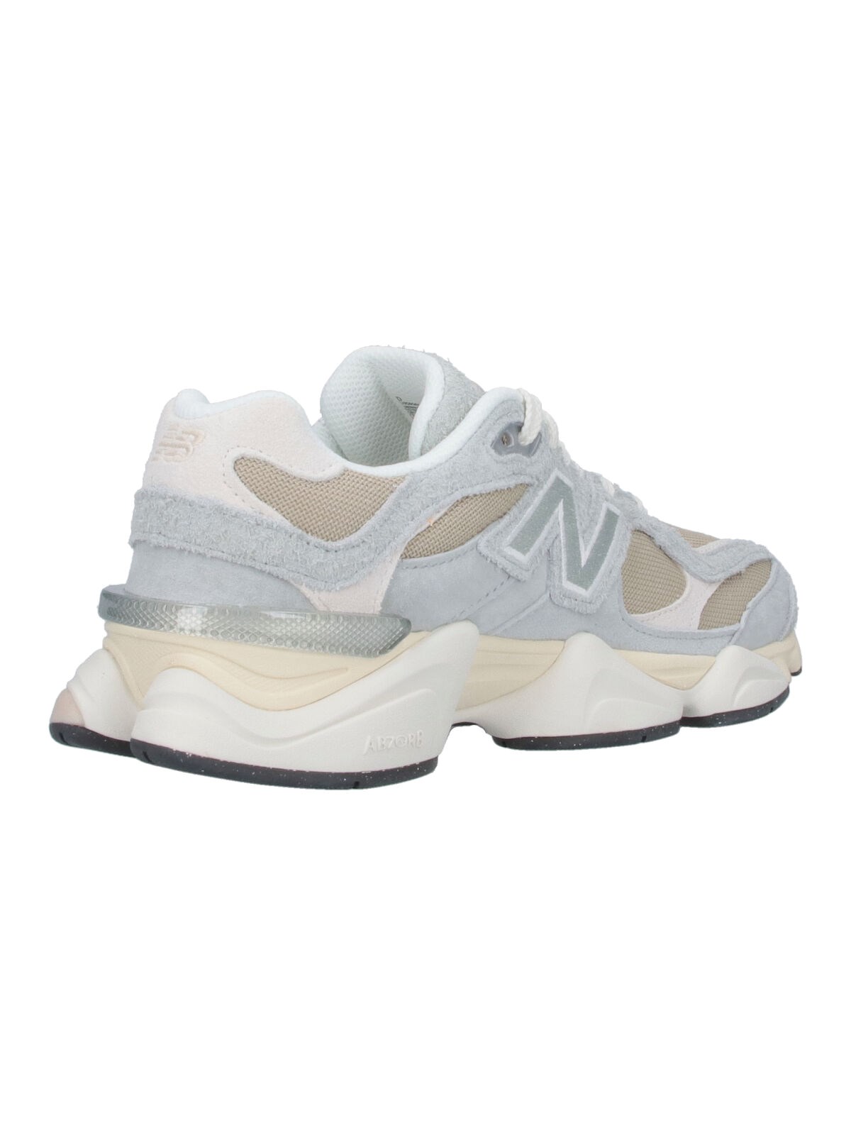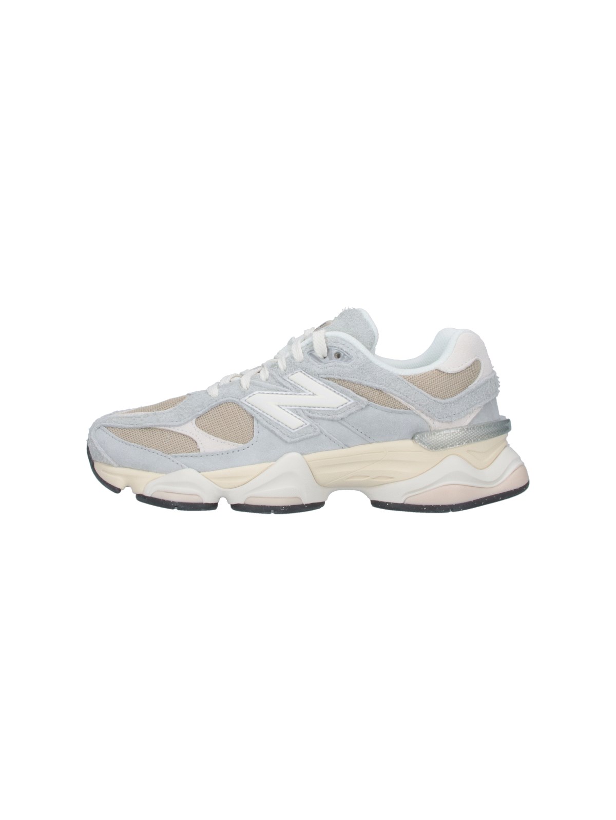 New Balance 9060 sneakers in gray suede with contrast mesh trim, round toe, laces, logo patch on tongue, side logo patch, contrasting logo embroidery on the back tab, and textured rubber sole.