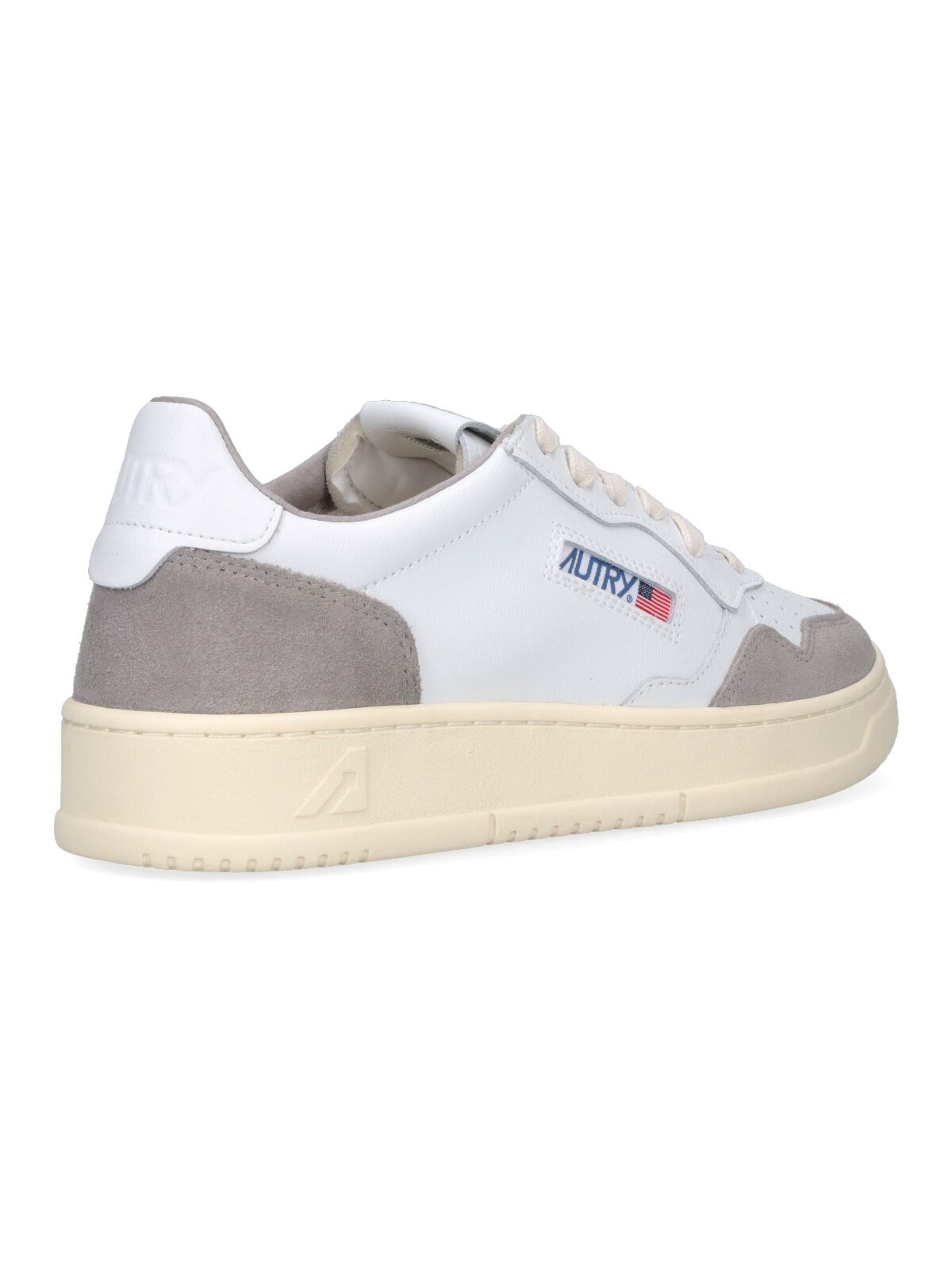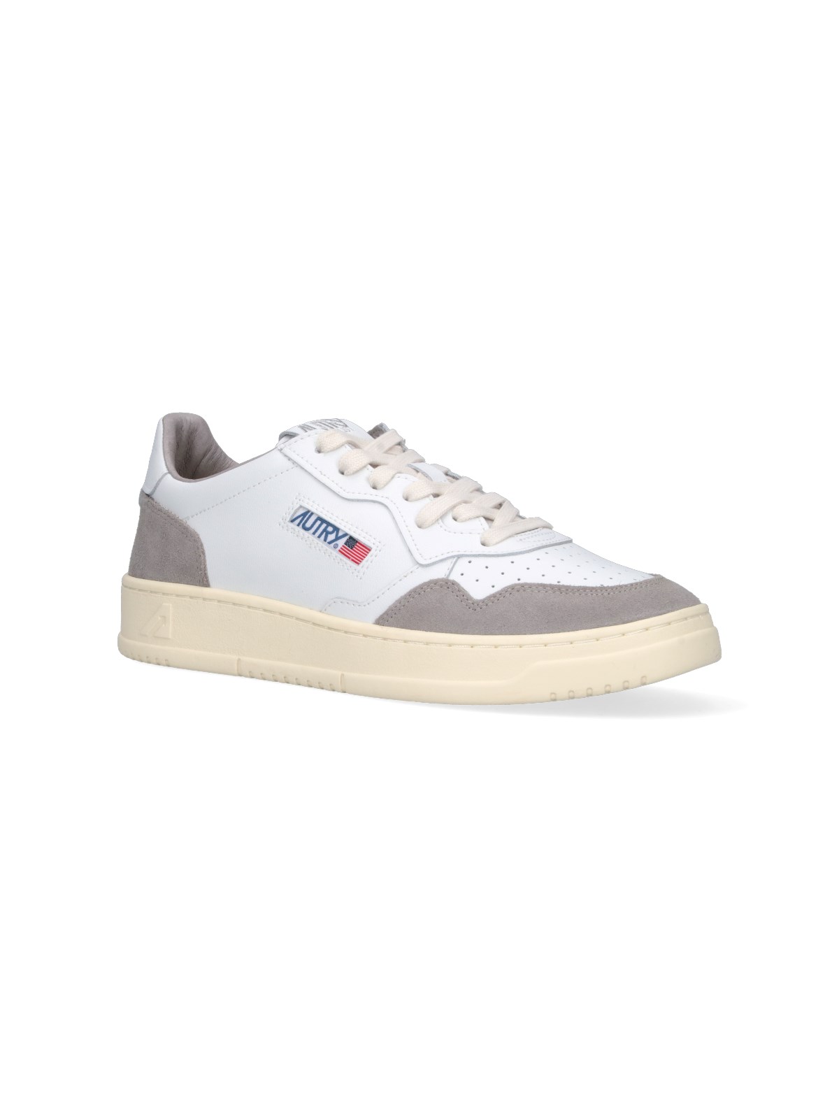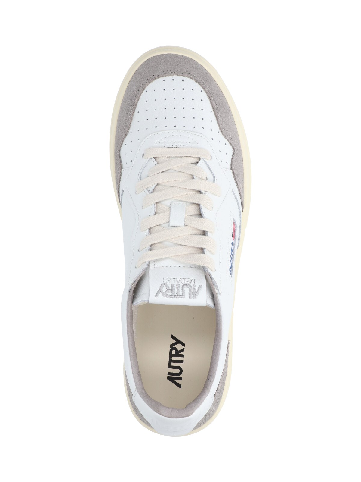 Autry "Medalist" low sneakers in white leather with round toe, laces, logo label on the tongue, logo tab on the back, contrast suede trim, rubber sole.