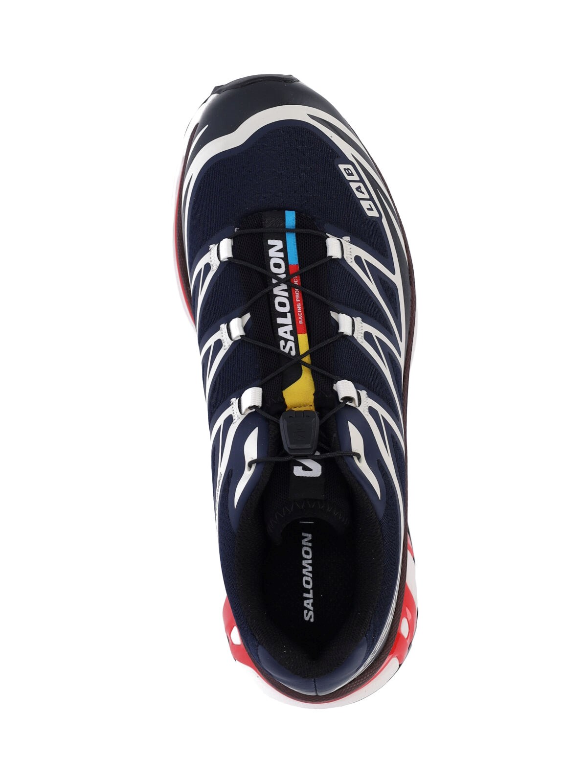 Salomon "XT-6" sneakers in blue fabric with contrasting mesh details, round toe, "Quicklace¢â" drawstring closure, multicolor logo label detail, side logo print, back logo print, contrasting textured rubber sole.