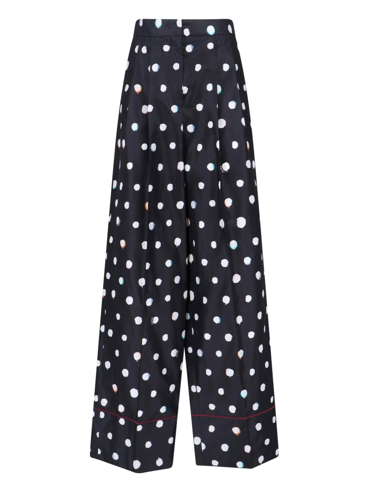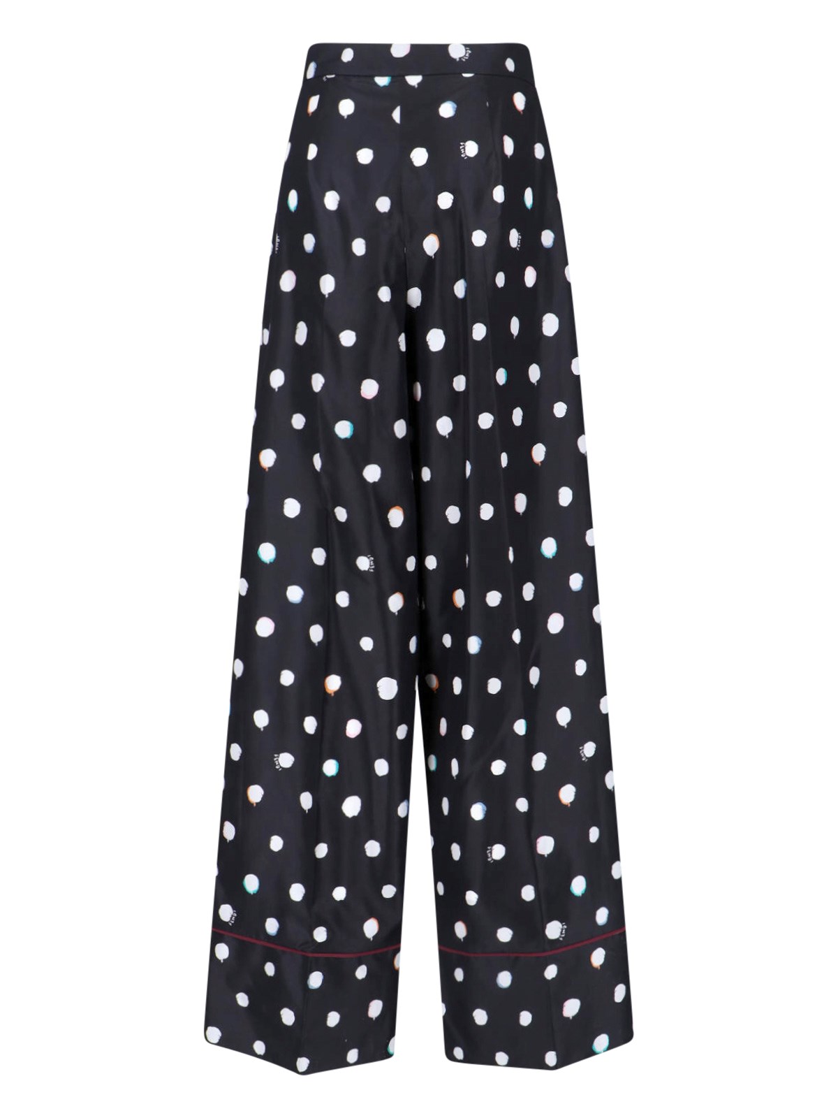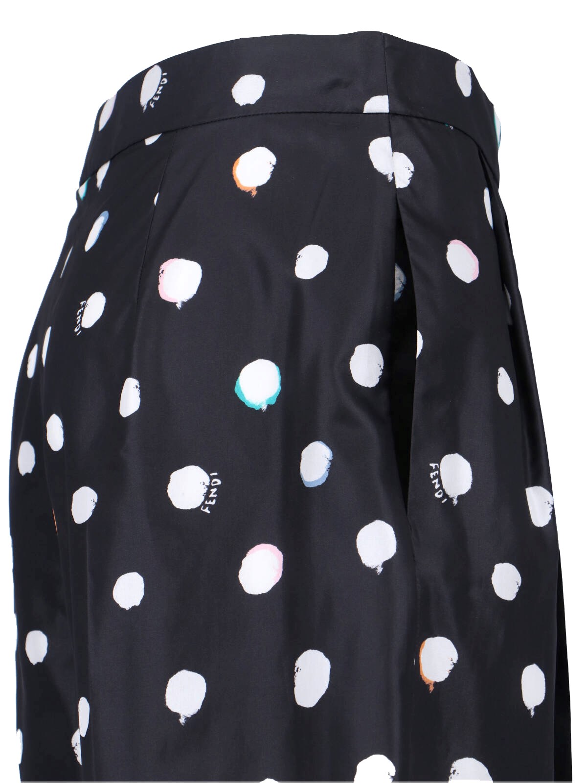 Fendi "Falena" wide trousers in black silk with polka dot pattern, high waist, zip and hook closure, two side pockets, wide leg.