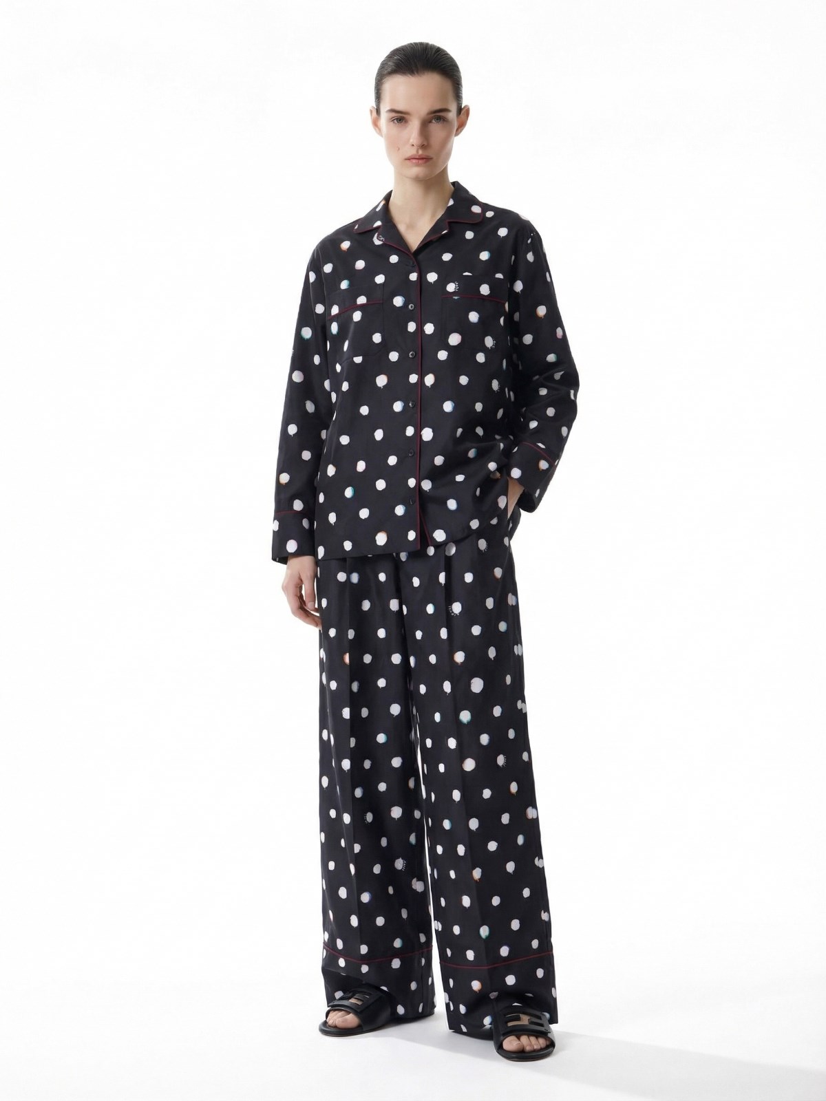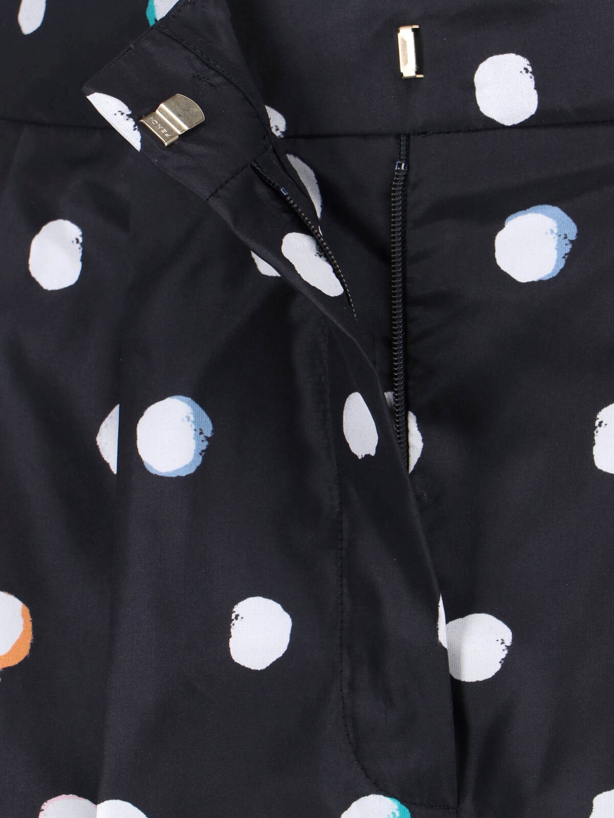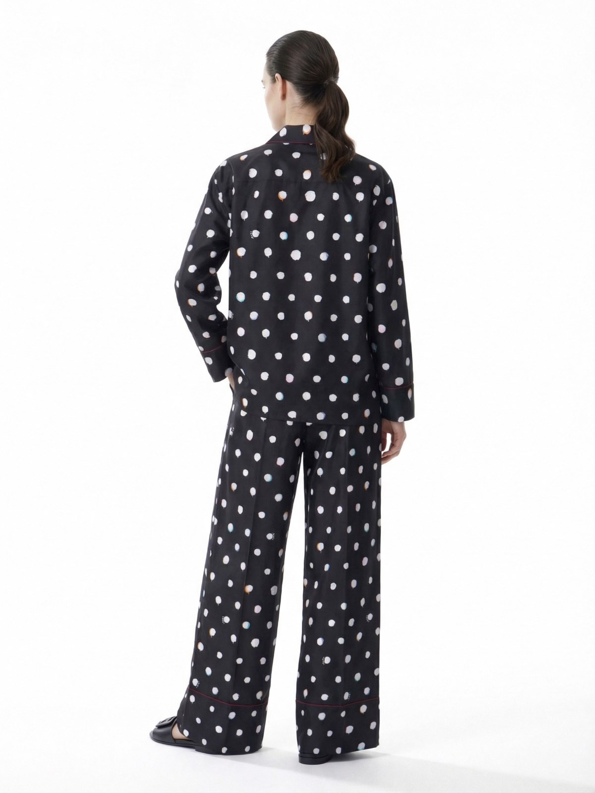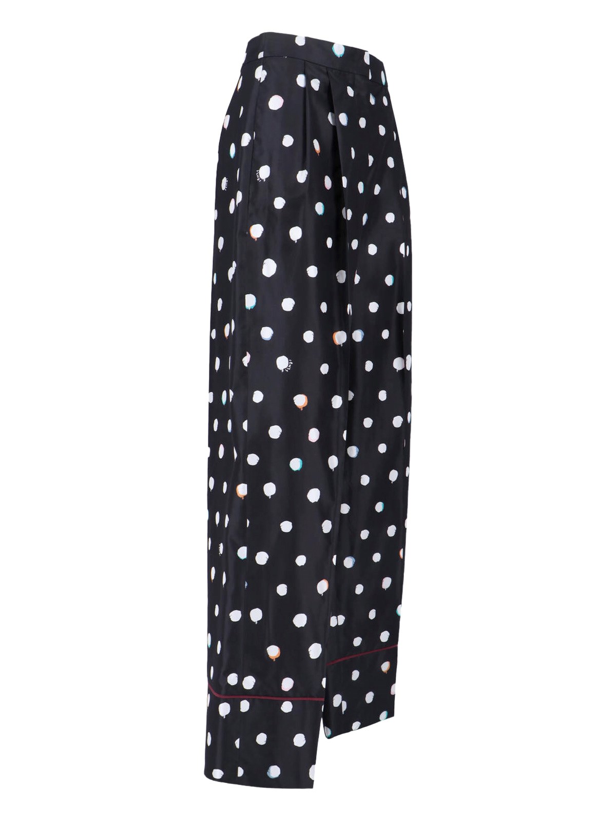 Fendi "Falena" wide trousers in black silk with polka dot pattern, high waist, zip and hook closure, two side pockets, wide leg.