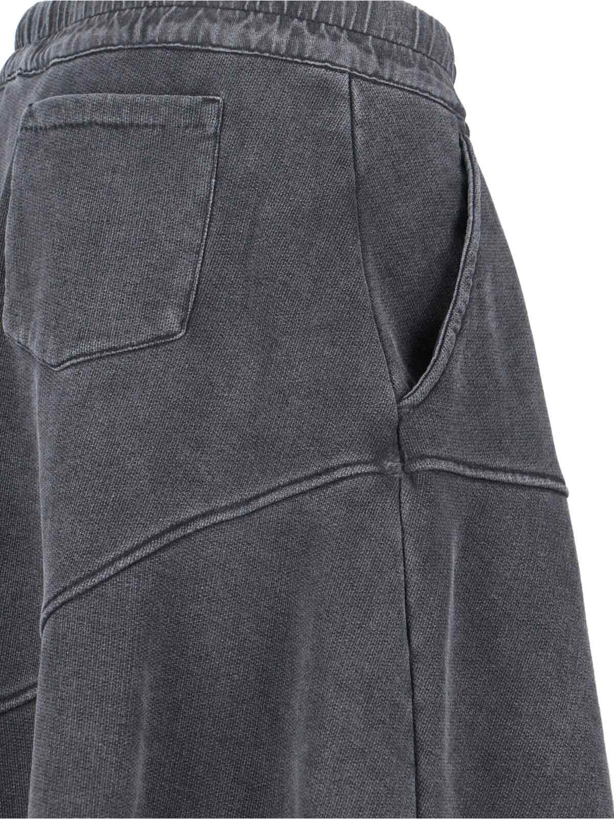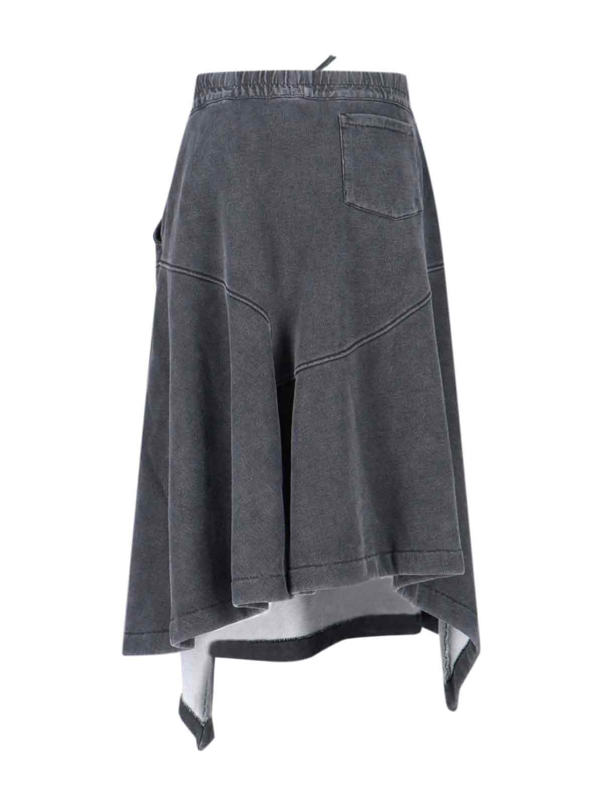 Our legacy "Lounge" midi skirt in girgio organic cotton, distressed effect, medium elastic waistband, drawstring detail, two side pockets, one back pocket, asymmetrical hem.