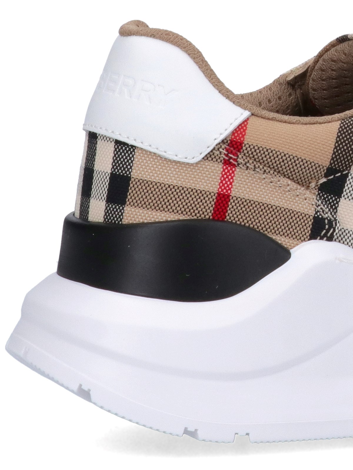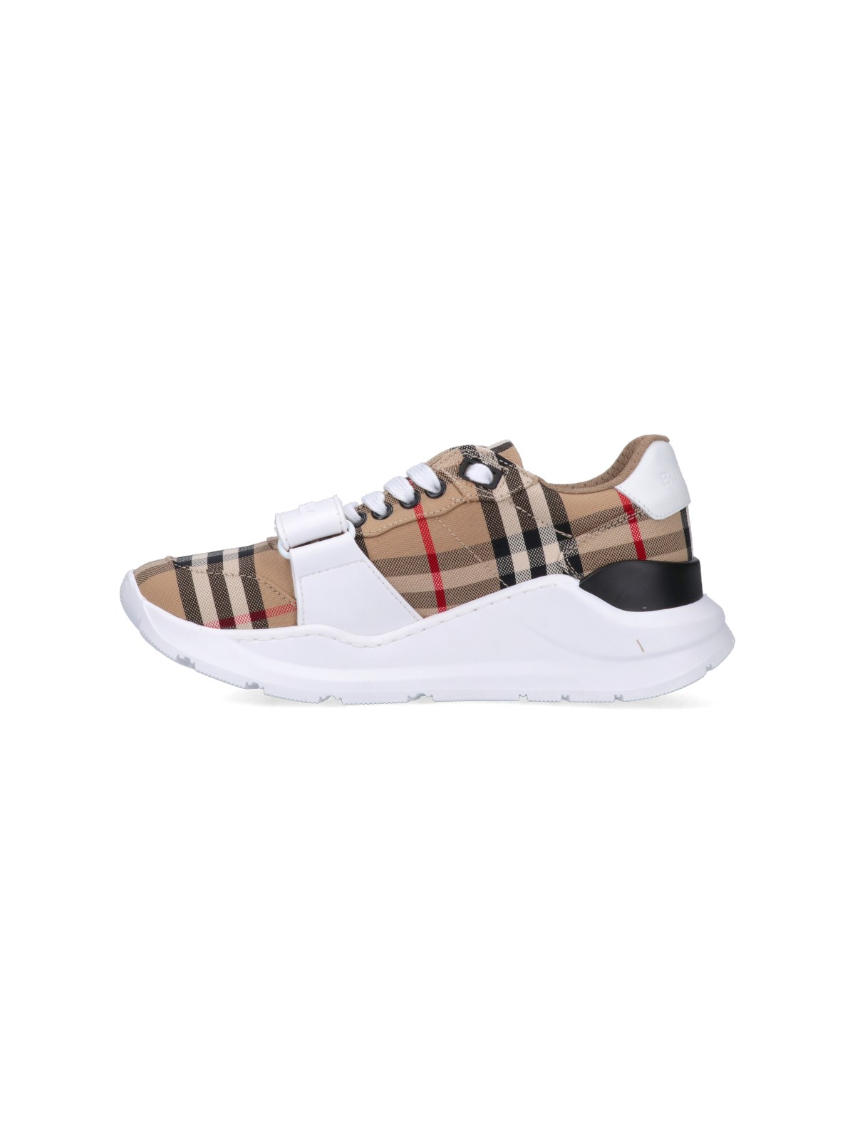 Burberry "Vintage Check" Sneakers, beige fabric, iconic all-over pattern, round toe, logo strap closure and laces, white back tab, white rubber sole.