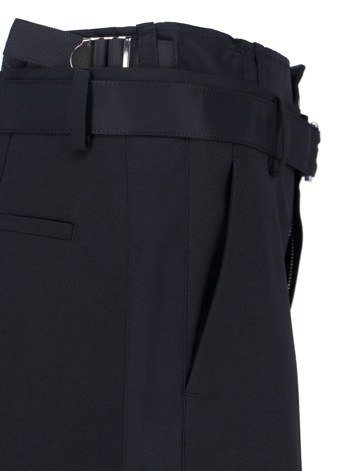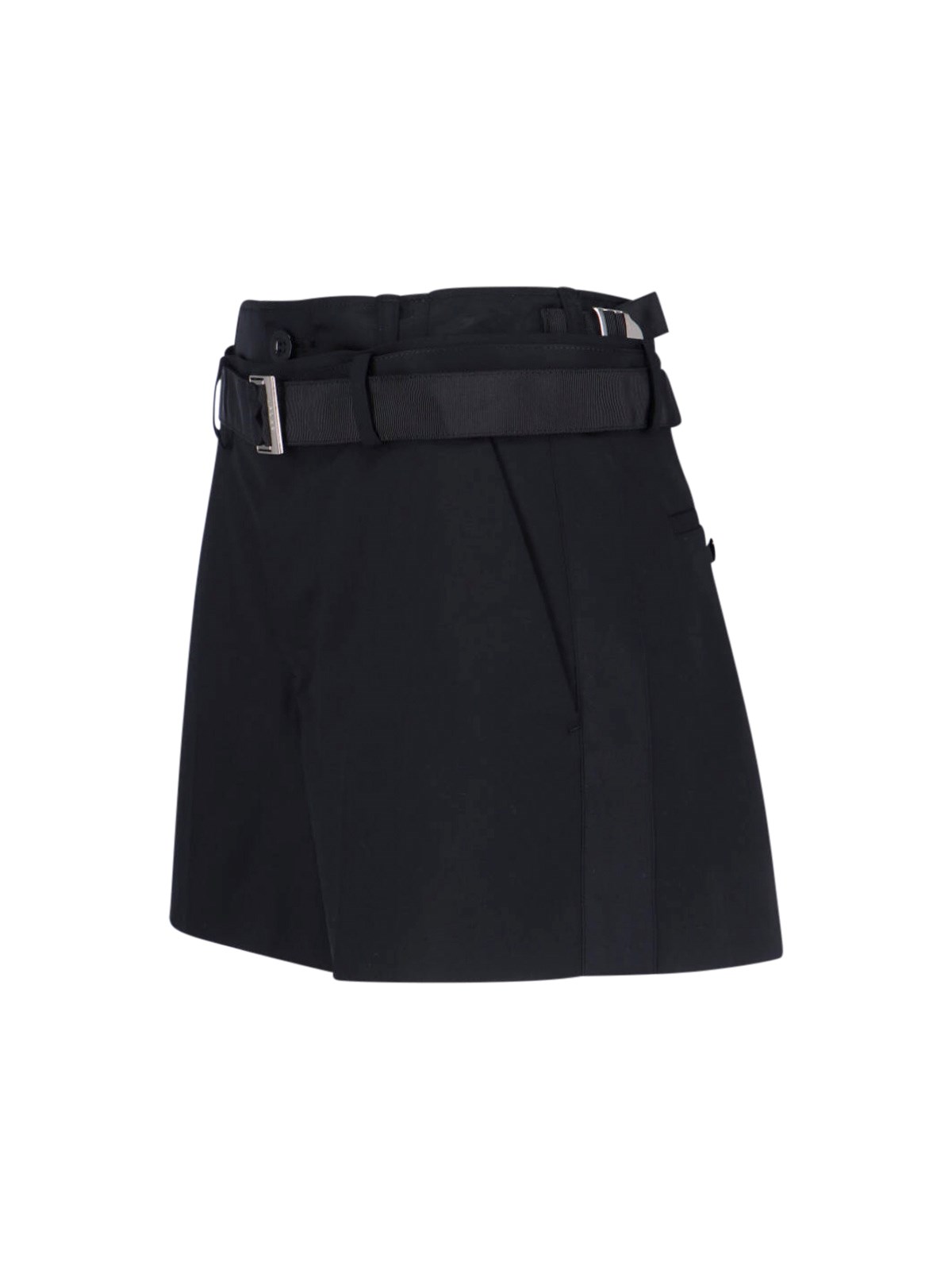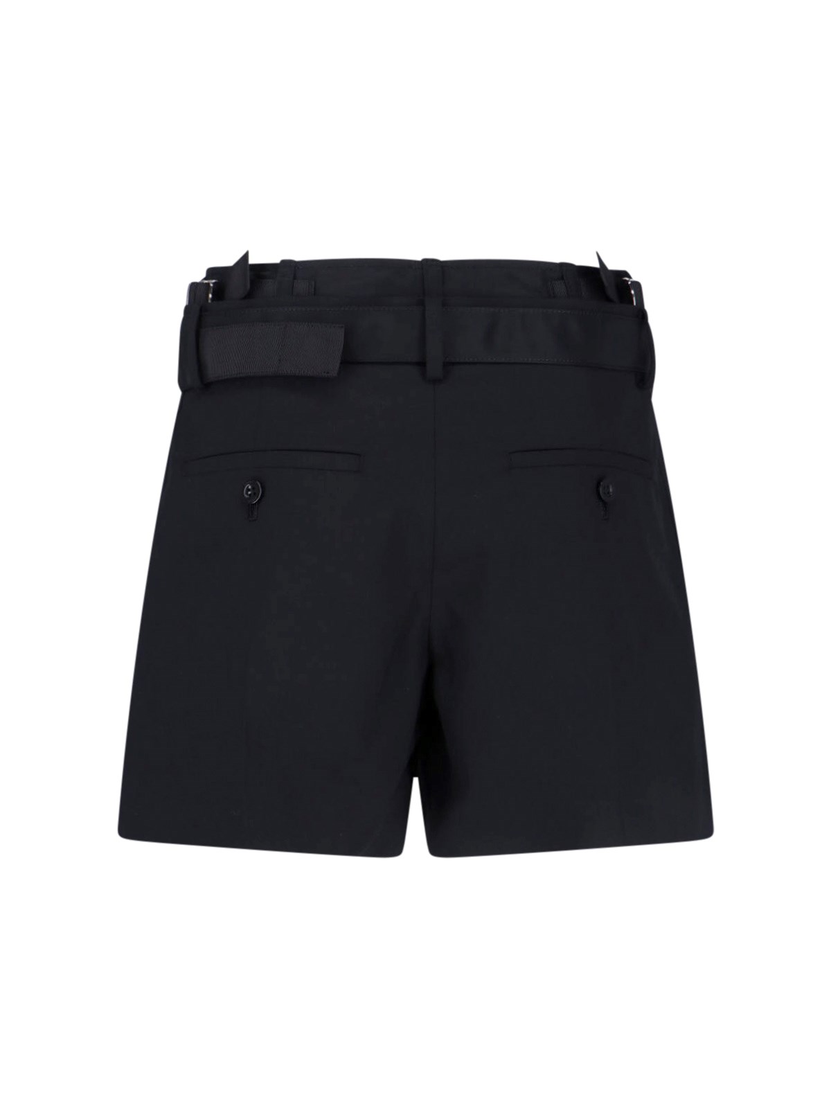 Sacai wool blend shorts in black, mid waist, button and zip closure, front buckle belt detail, two side slanted pockets, two back button pockets, straight leg.